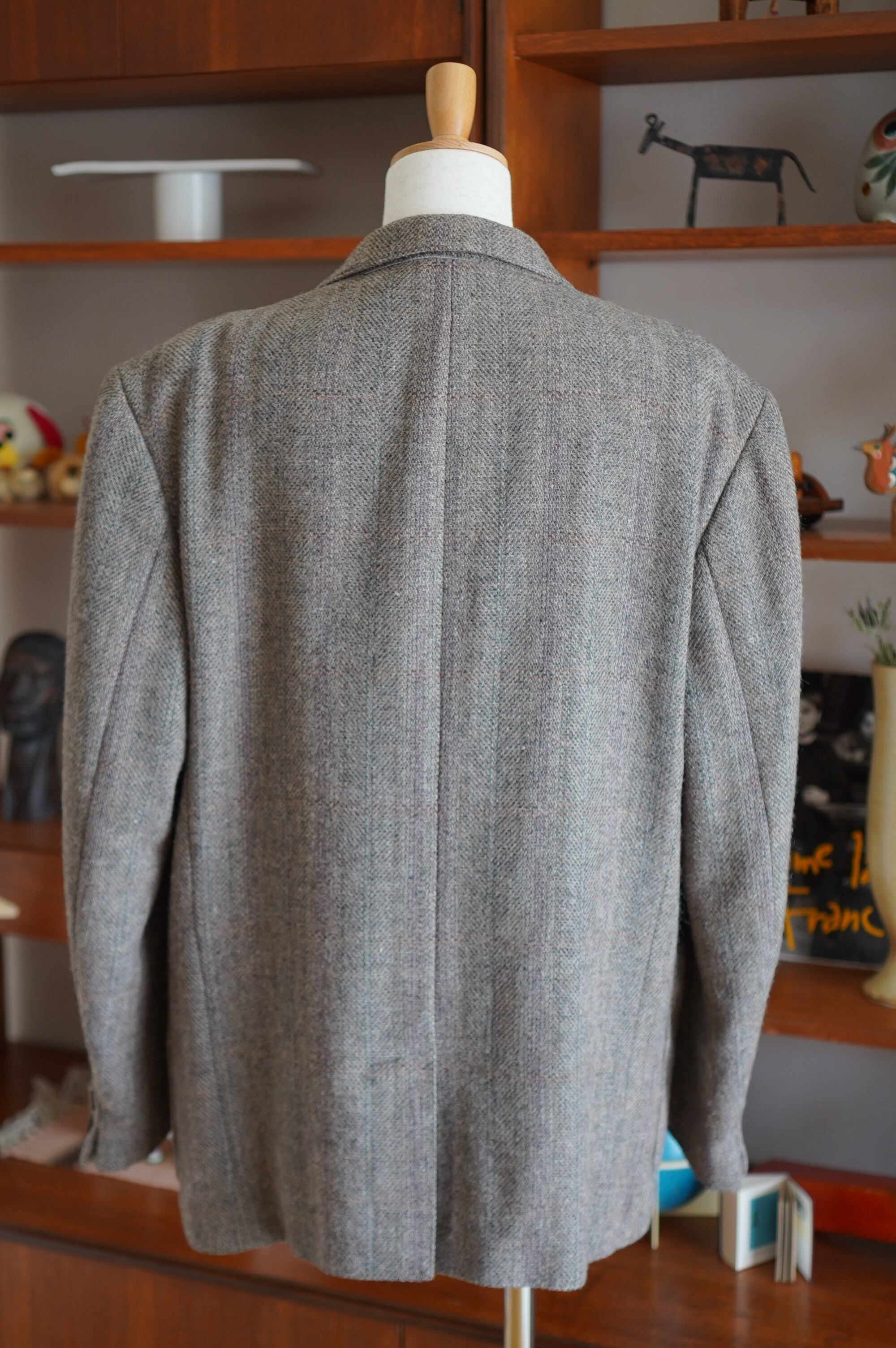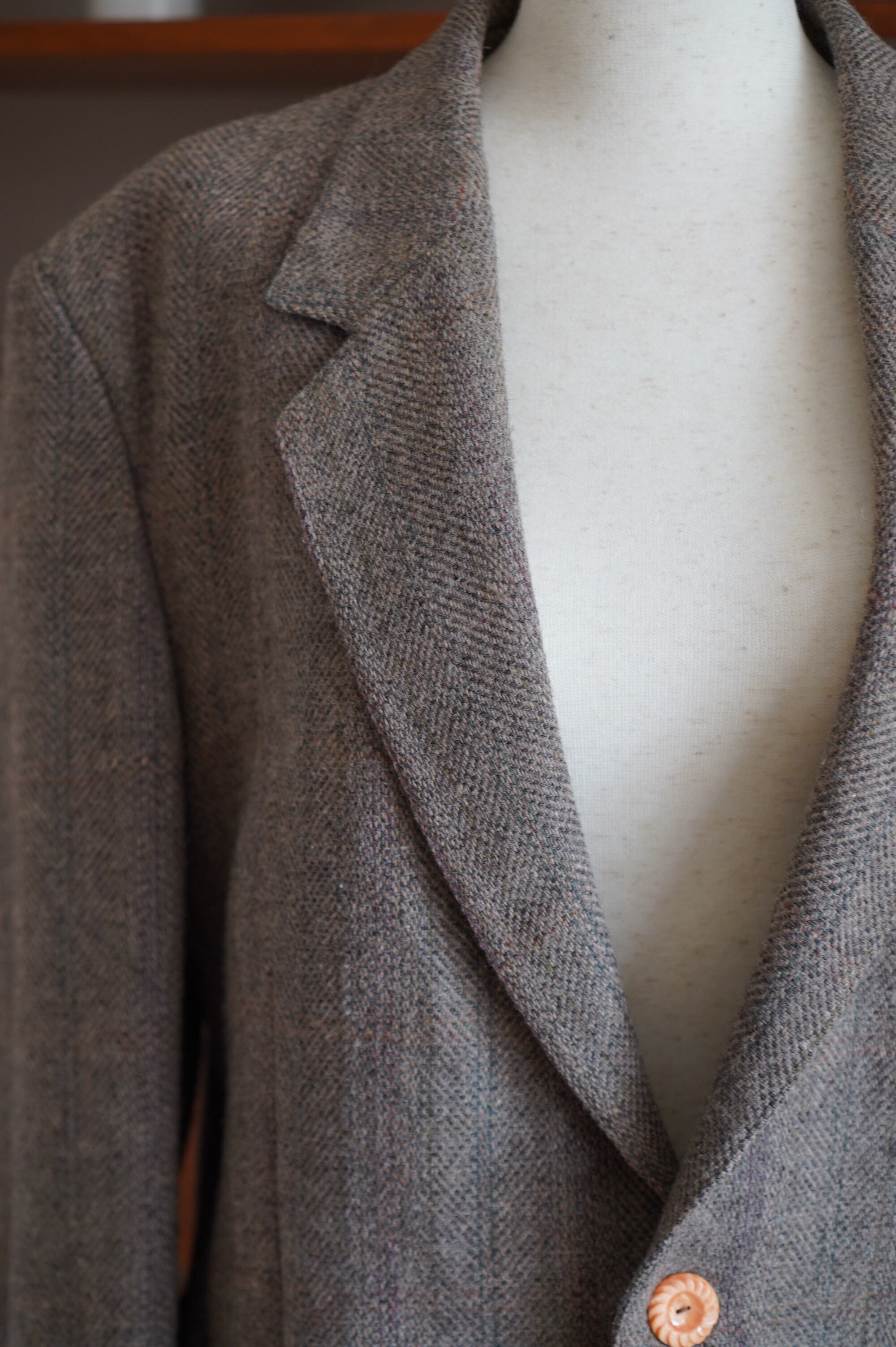 ライトグレーのベースに、チョコレートブラウンとブラック、ブルーグリーンの糸が織り交ざっています。
