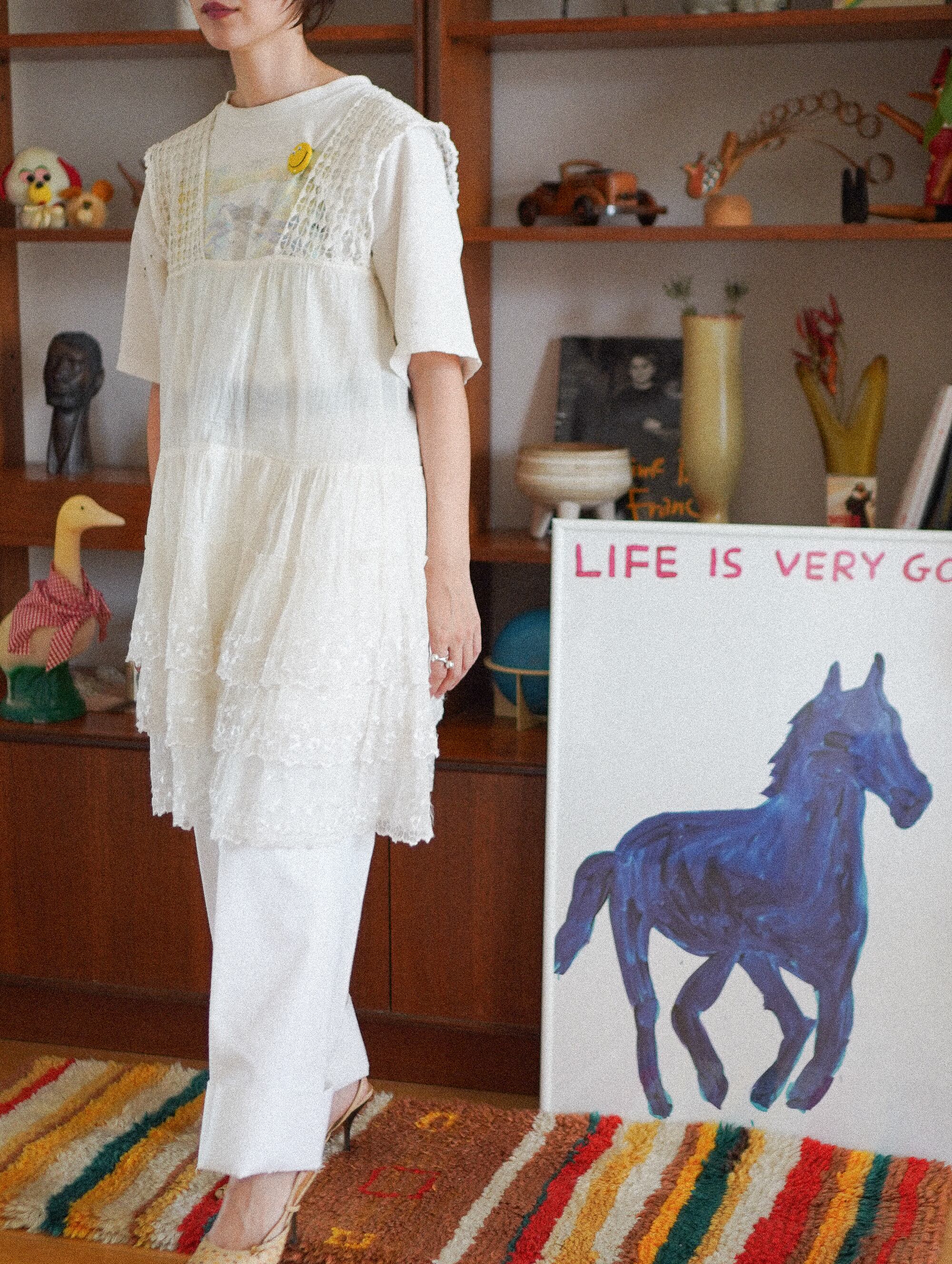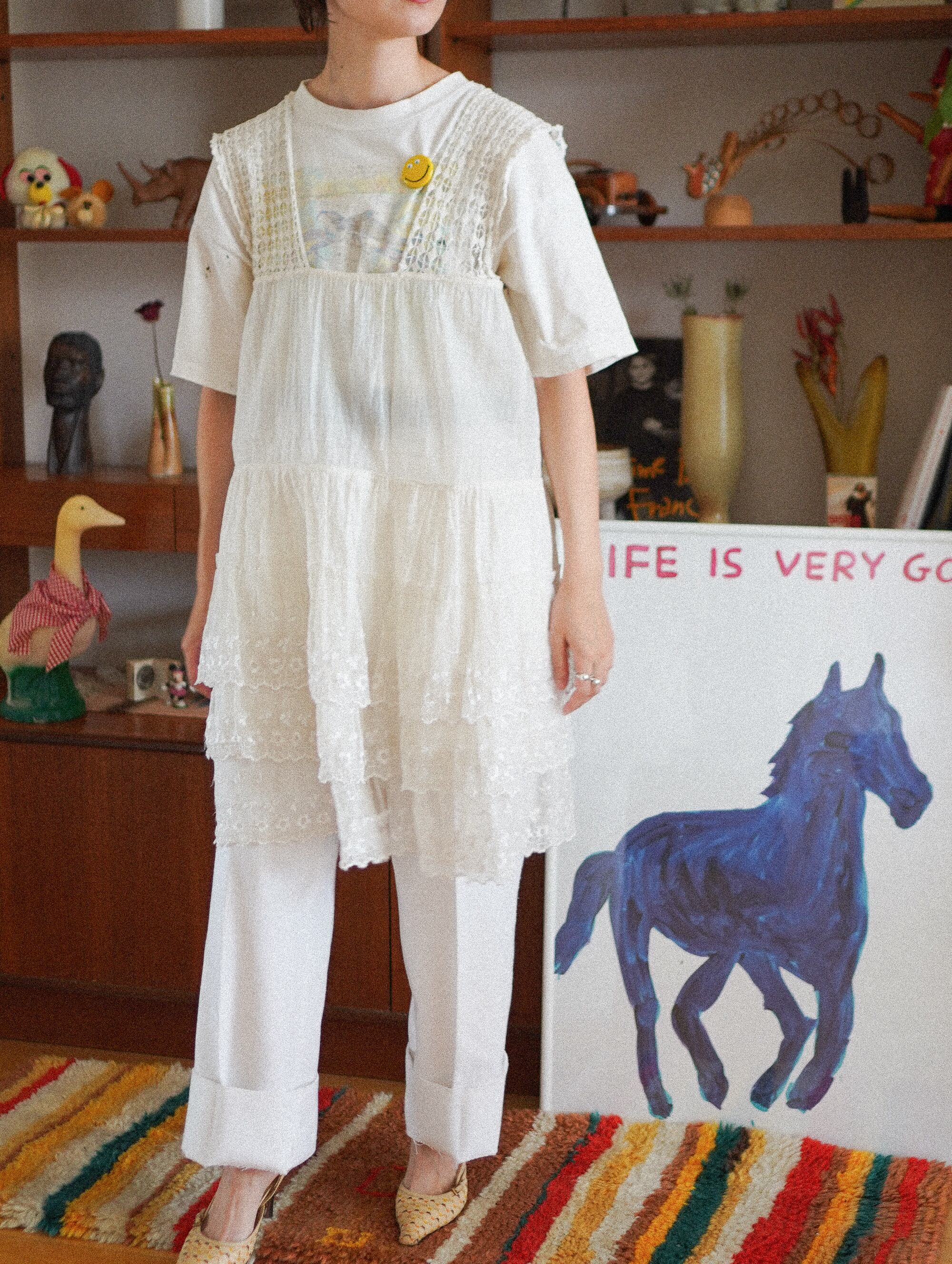 太めのクロシェ編みのレースが甘すぎないポイント。