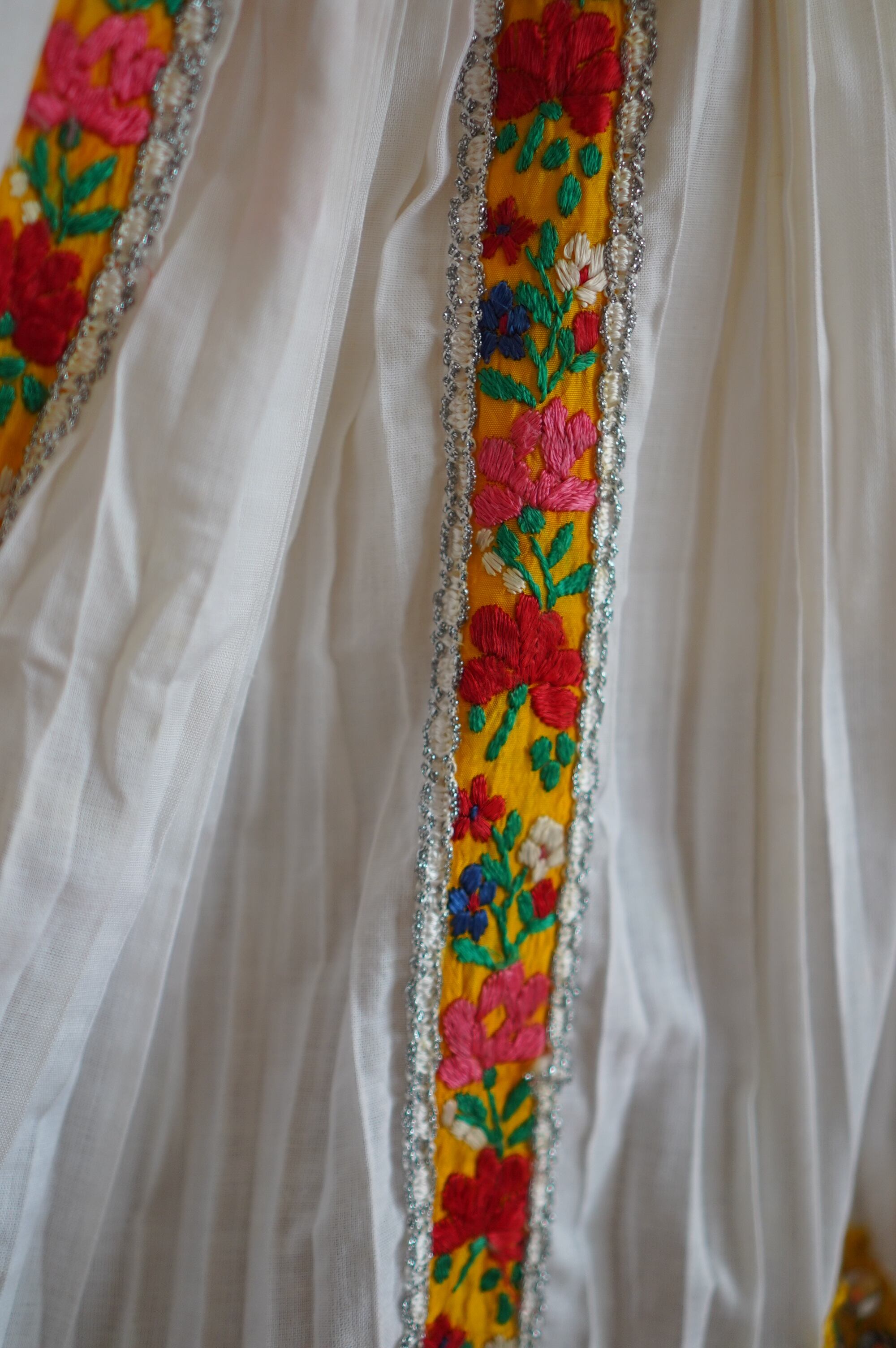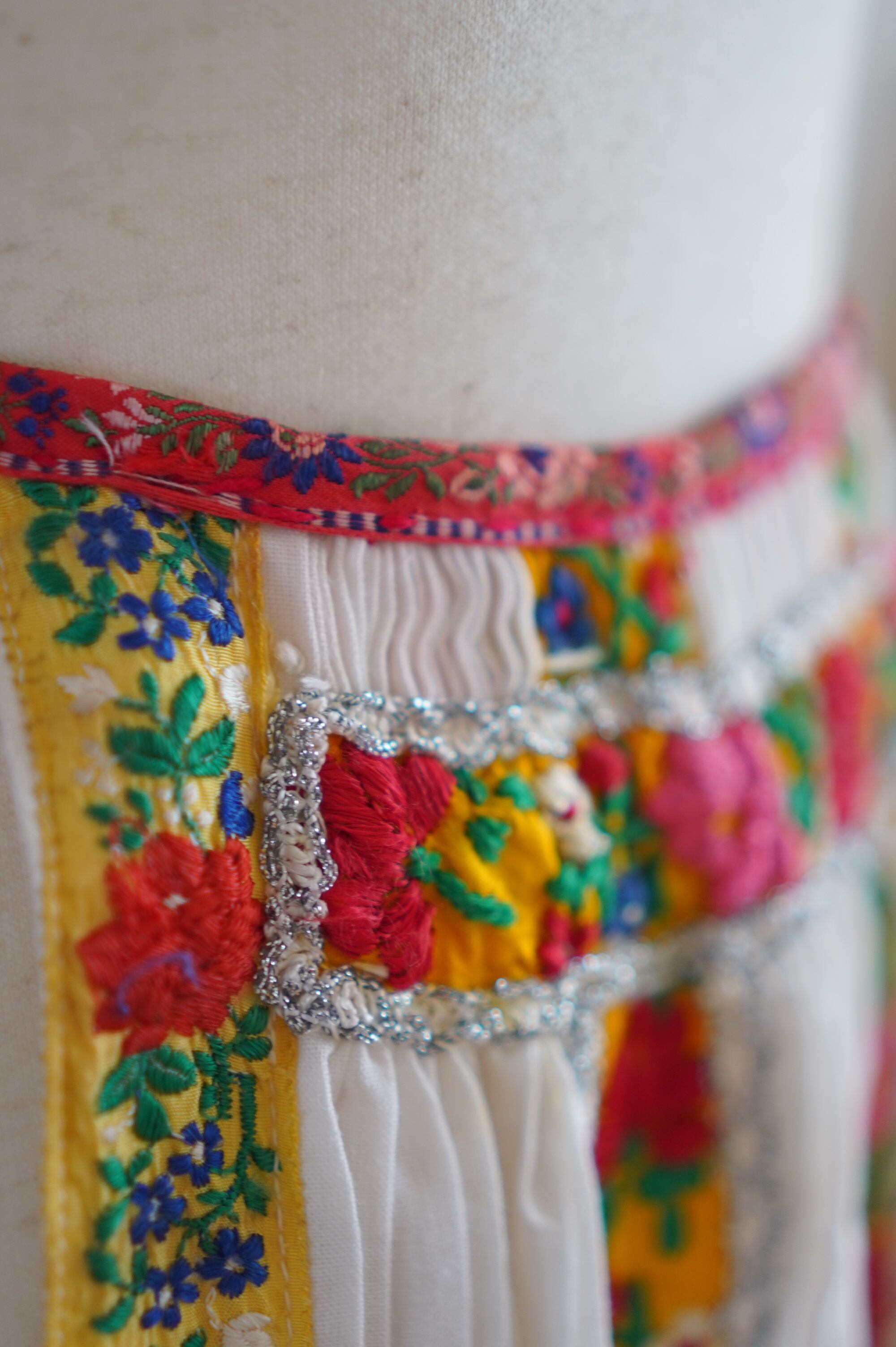 色とりどりの花刺繍やシルバーの装飾テープなど、