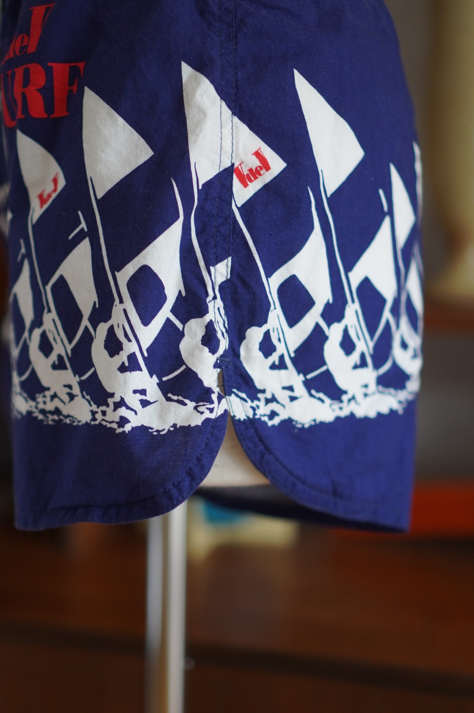 ネイビーの生地にヨットのプリントと赤いロゴがキュートな、VdeVのスイムショーツ。made in Paris。ウエストはドローコード仕様で、サイズ調整が可能です。内側にはインナーメッシュ付きで水着としても安心してご使用いただけます。素材はコットン。柔らかくて履き心地も抜群。ヴィンテージならではの雰囲気がたっぷりです。おそらく1980年代ごろのアイテムと思われます。-"DEL SURF Sailboat Print Swim Shorts (Made in Paris)"