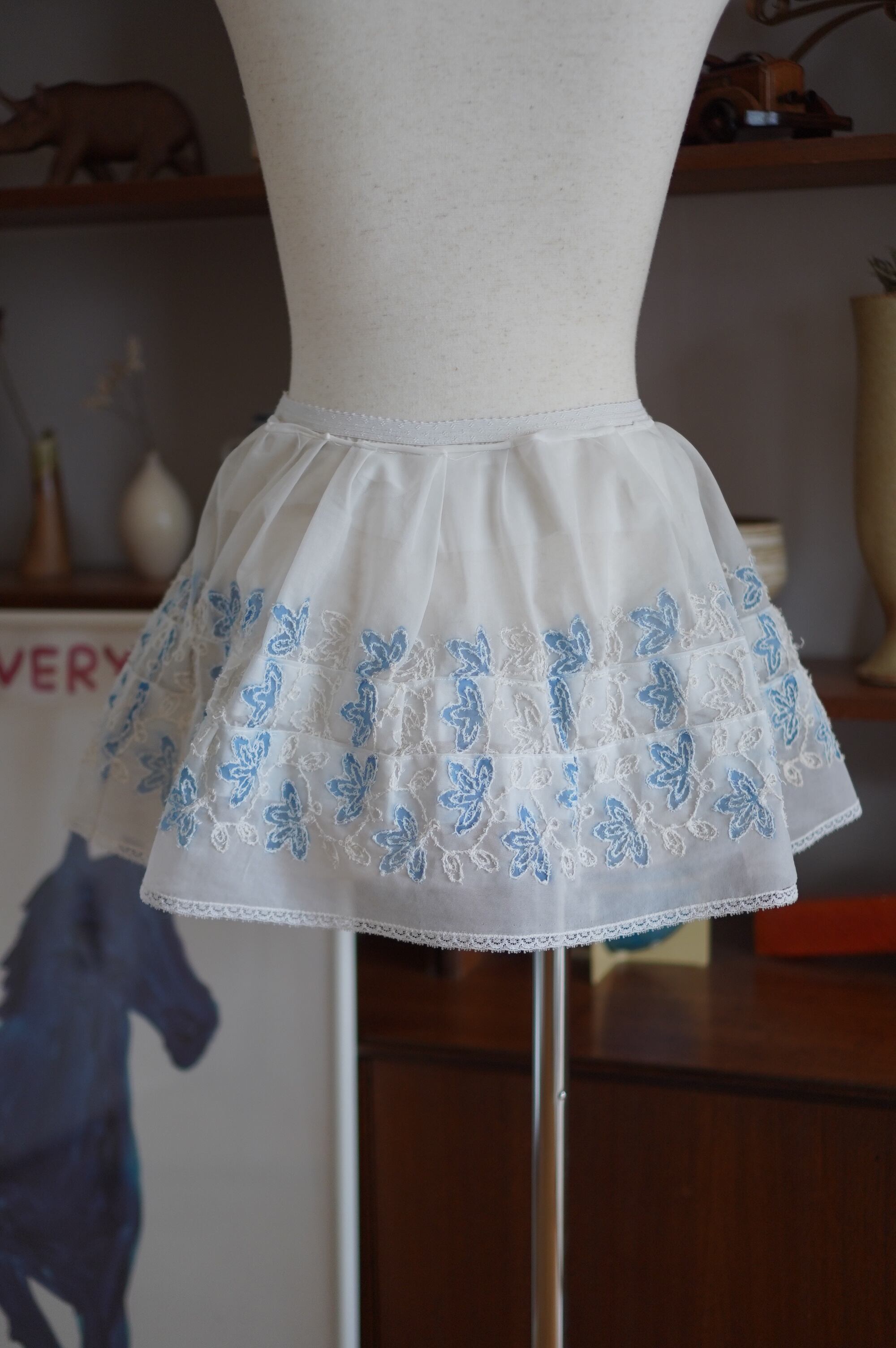 淡いブルーのフローラル刺繍が印象的な、透け感のあるスカート。おそらくコットンオーガンジーと思われる素材で仕立てられた、繊細なシャリ感のある一枚です。ふんわりとしたシルエットがキュートで愛おしくなります。ウエスト部分は刺繍入りの伸縮ゴムテープ仕様で、軽やかで快適な着用感。一枚で、スタイリングに特別なムードをプラスしてくれるスペシャルなスカートです。-blue embroidered sheer skirt