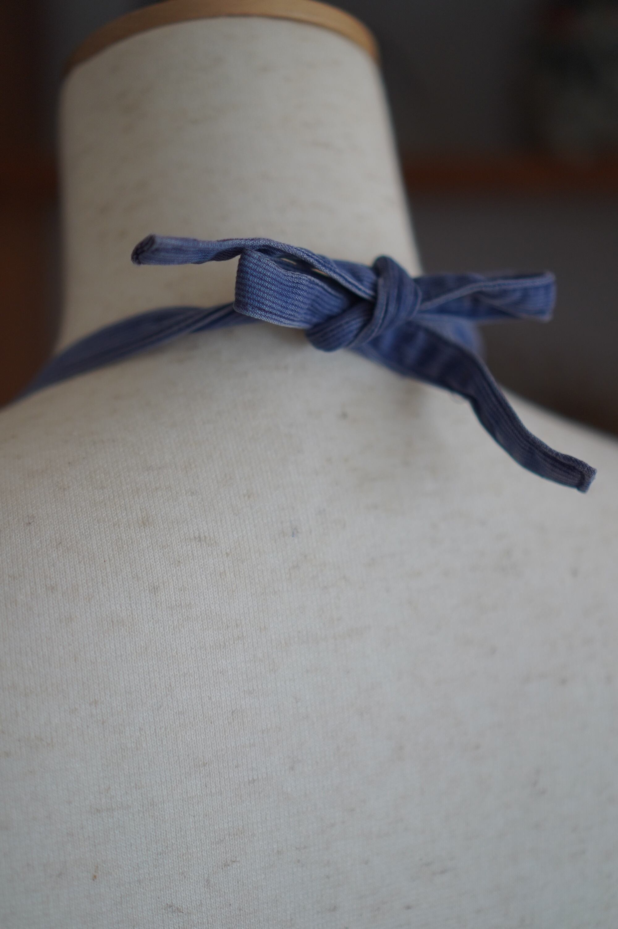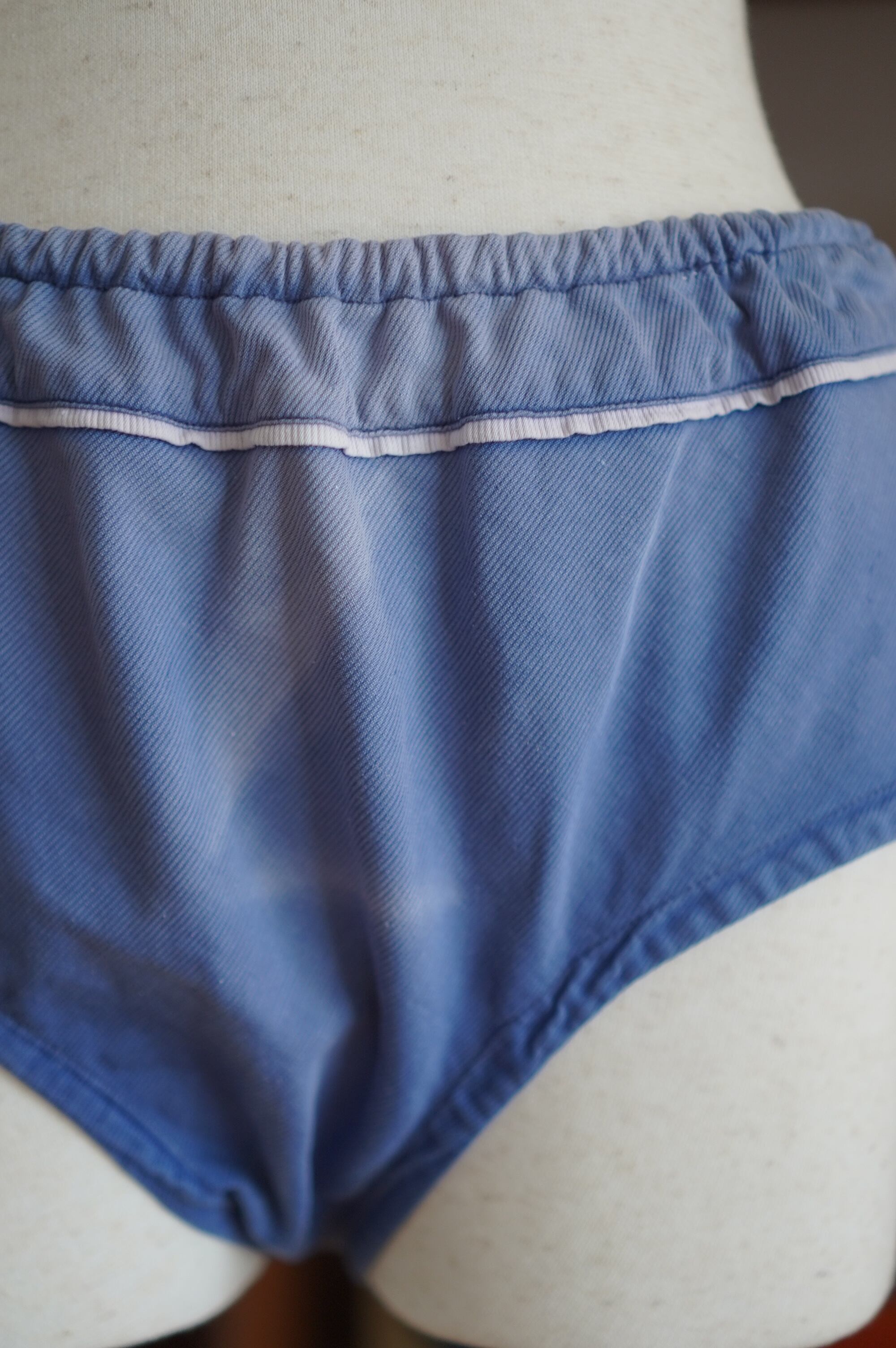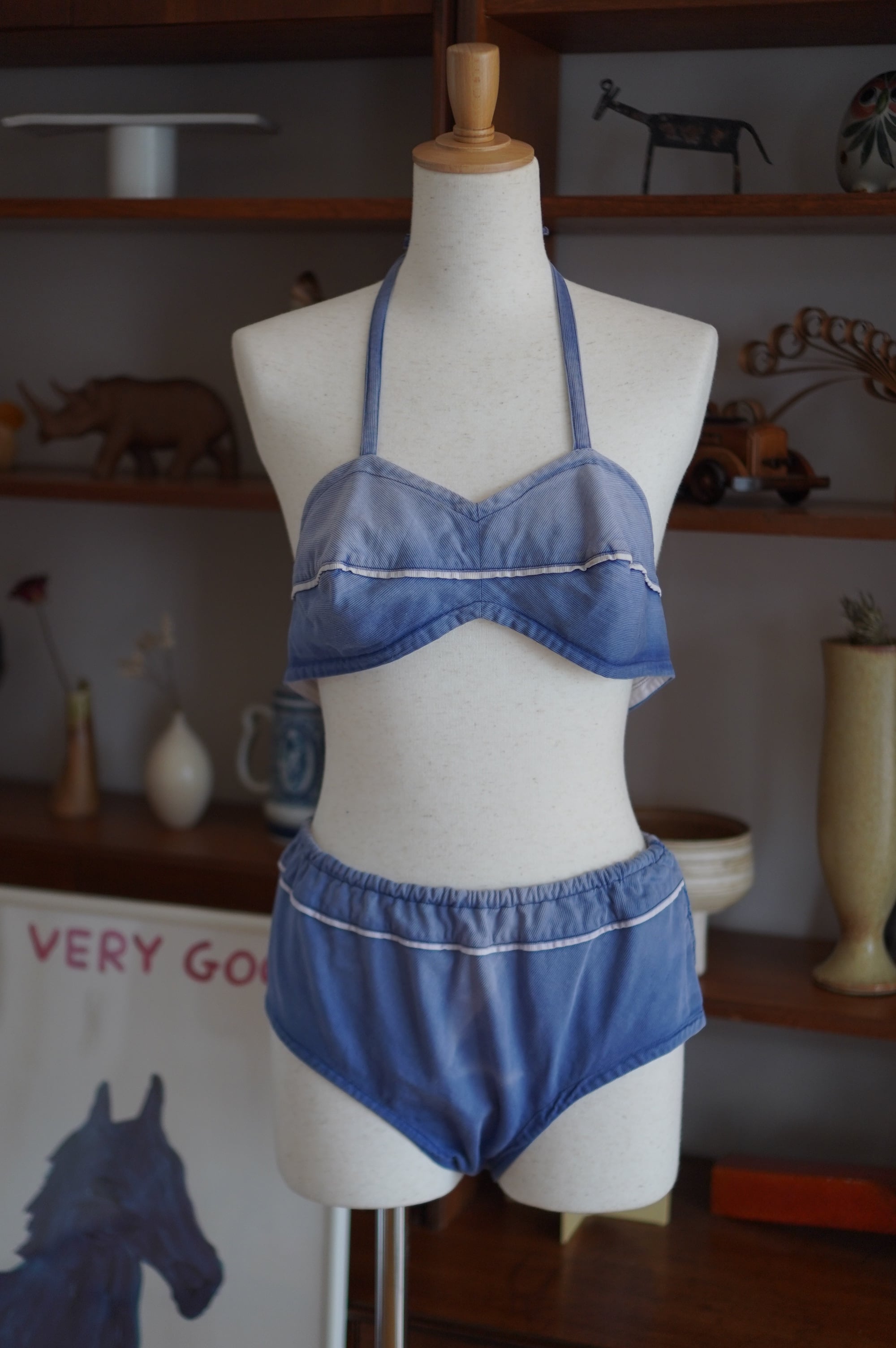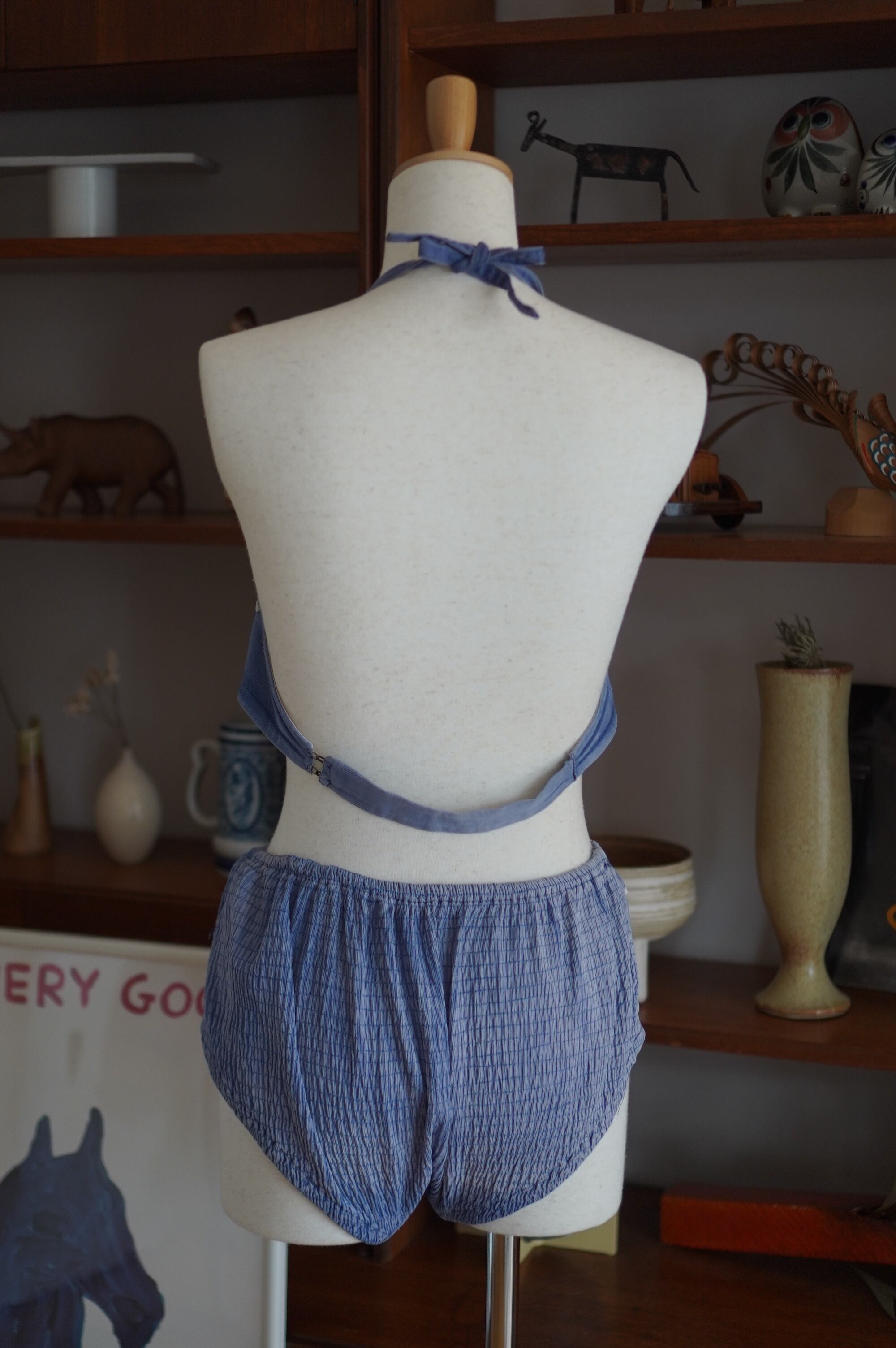 ハンガリー製の希少なヴィンテージ水着。トップはホルターネック仕様、ボトムはたっぷりギャザーが入ったハイウエストシルエットで、当時らしいバランス感が楽しめるデザイン。コットンベースと思われるしっかりとした素材に、細かなストライプ織りがたまらなくキュートです。ハンガリーの古いタグがついているところも特別なポイント。やや色あせや使用感はありますが、ヴィンテージとしては状態良好で、色落ち感もかっこよいです。クラシックな雰囲気がお好きな方にはたまらないかと思います。-vintage hungarian two-piece swimsuit / 1940s–50s style