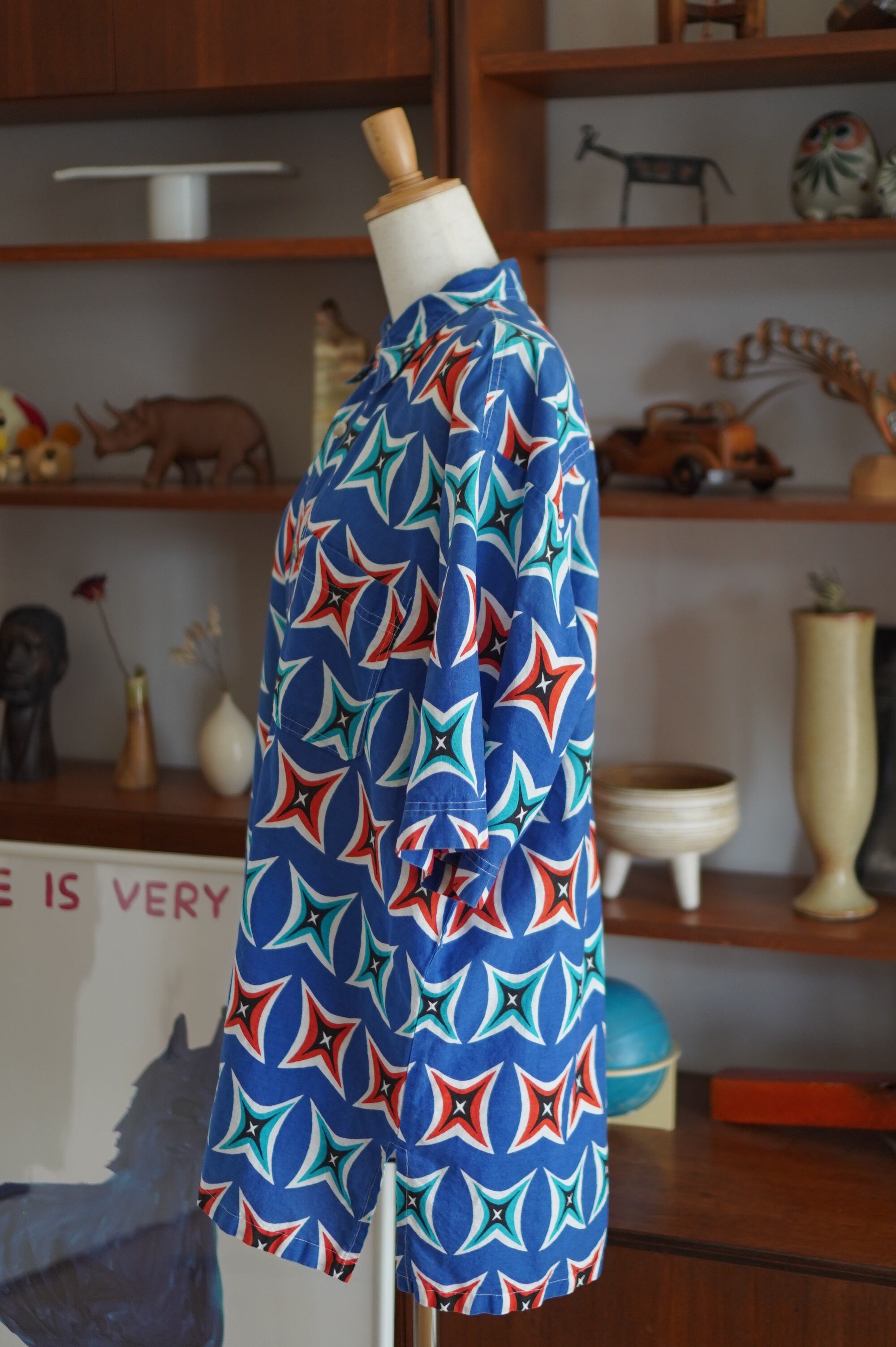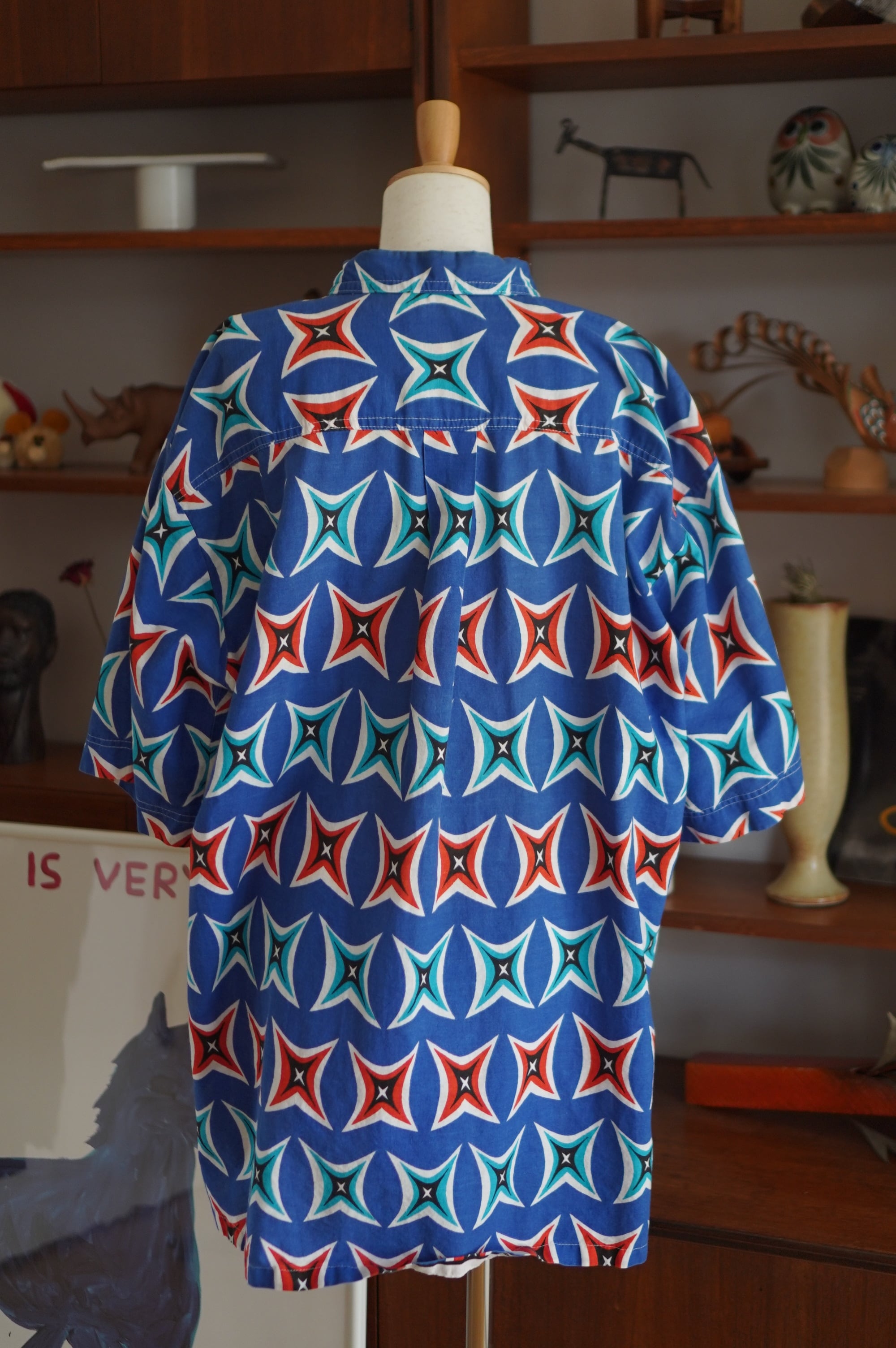 鮮やかなブルーをベースに、レッドとグリーンの幾何学模様が映える最高にキュートな半袖シャツ。手裏剣みたいでユニークな柄です。UTEXAFRICA 100%コットンのしっかりとした生地感で、軽やかな着心地ながら存在感のある一枚です。フロントボタンや胸ポケットなど細部にもこだわりが詰まっており、ユニセックスでの着用もおすすめ。さらっと羽織るだけでもコーディネートがパッと華やぎます。誰ともかぶりたくない特別な一枚を求めてる方に是非!-utexafrica grafic shirt