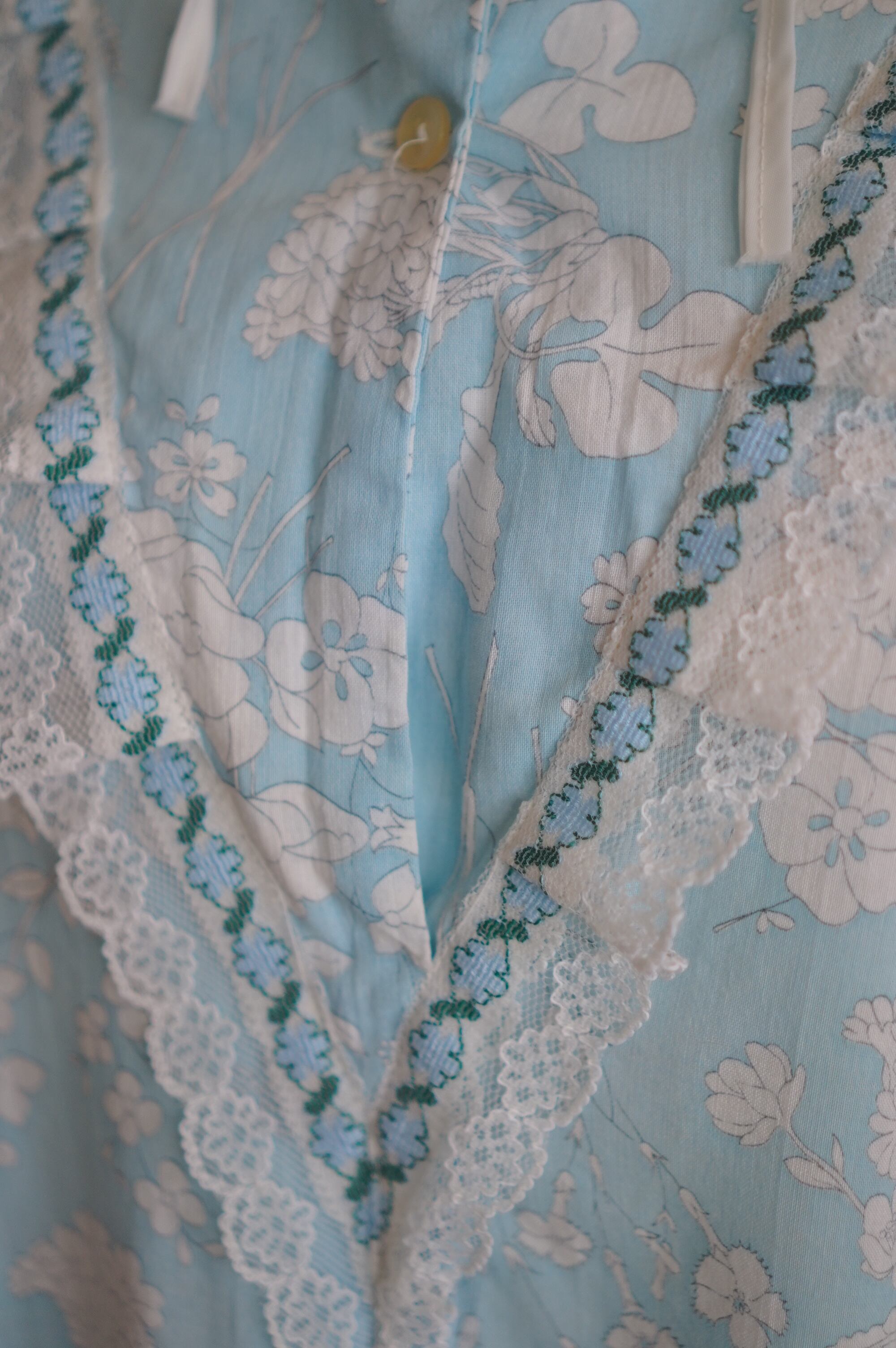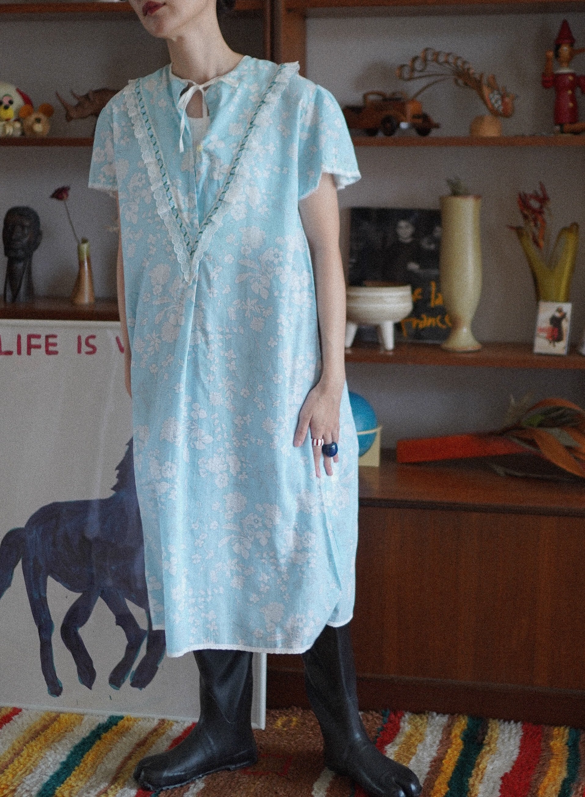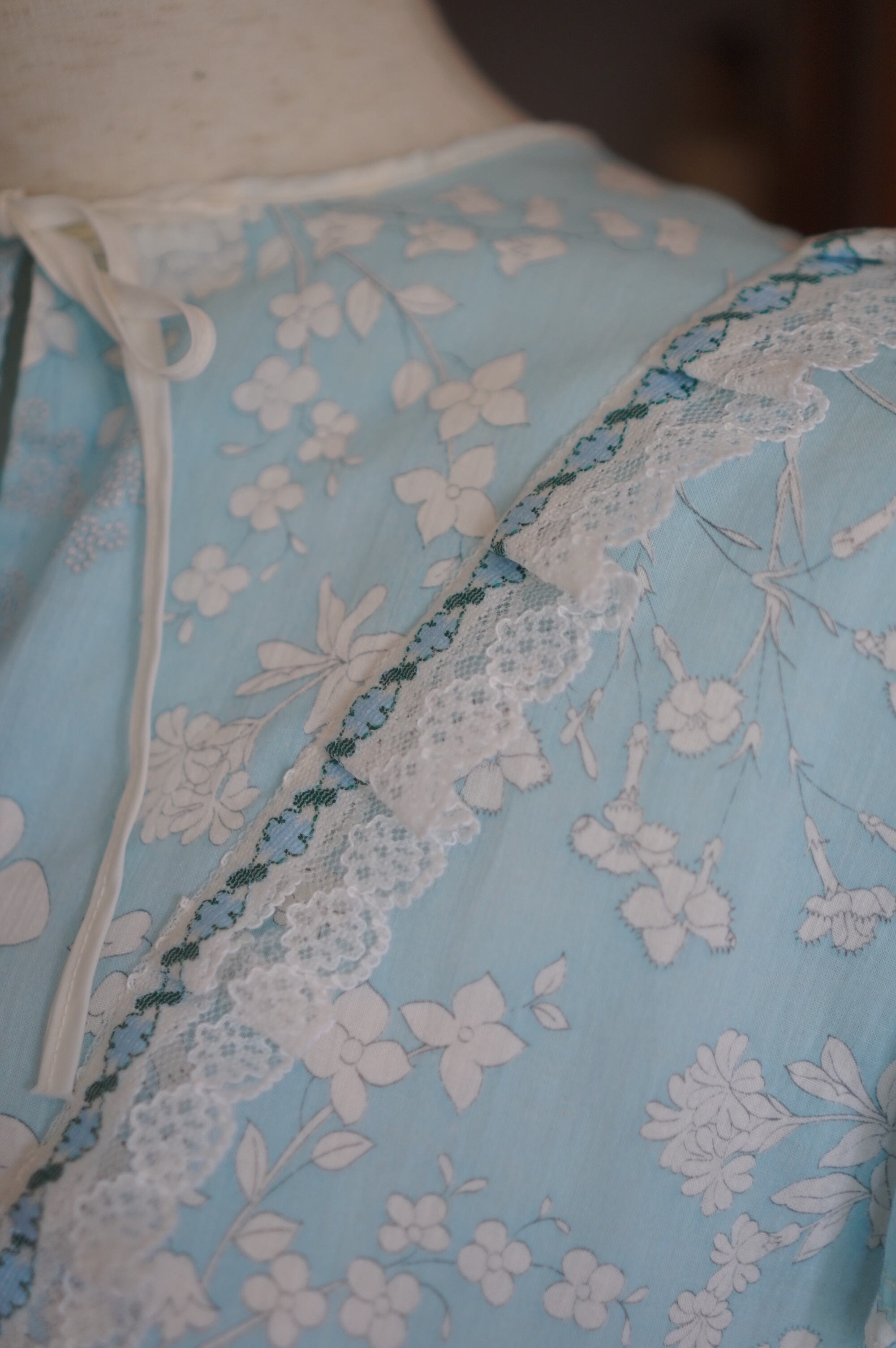 淡いスカイブルーに白いお花のプリントがキュートなヴィンテージナイトドレス。Vラインに重ねられたホワイトレースと、ポイントで使われたブルーのフラワーレースがチャームポイント。ネックラインはリボンで結ぶデザインで、バックスタイルもほんのりガーリーでキュートです。さらっとしたコットン生地で、夏でも快適に着ていただけます。秋はスウェットとロングブーツを合わせてもキュートです。冬はもこもこなニットと合わせても愛くるしいです。-sky blue floral night dress