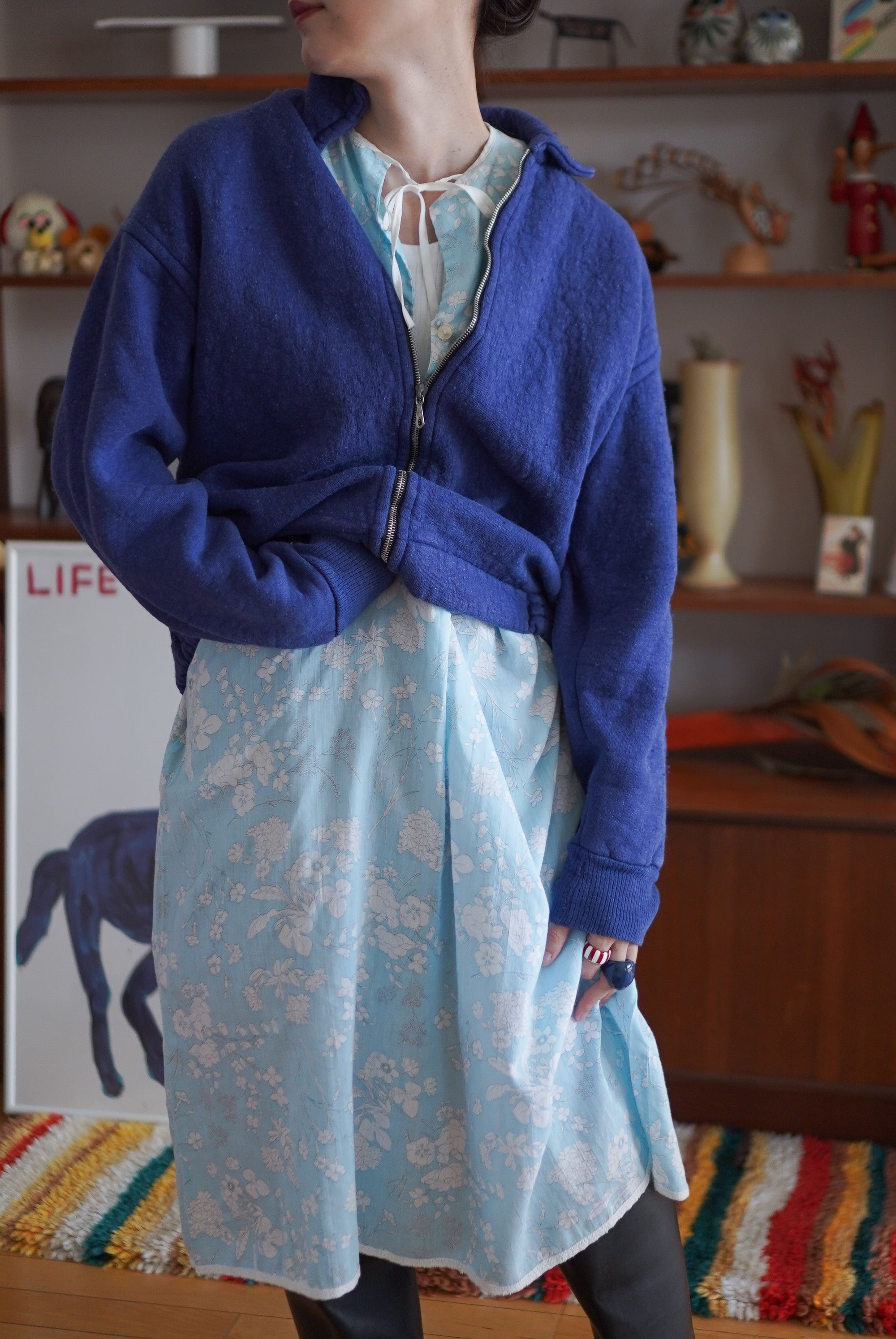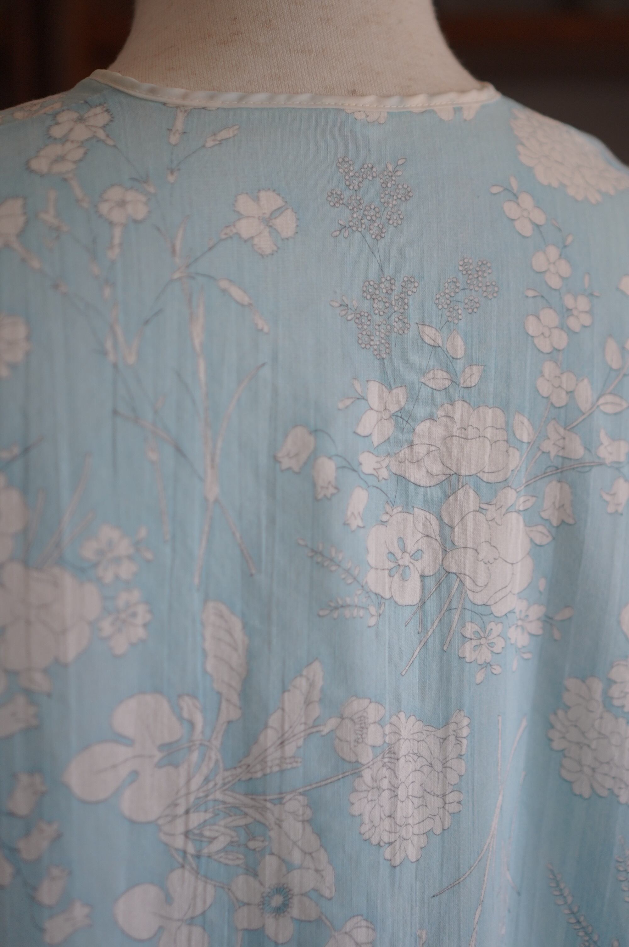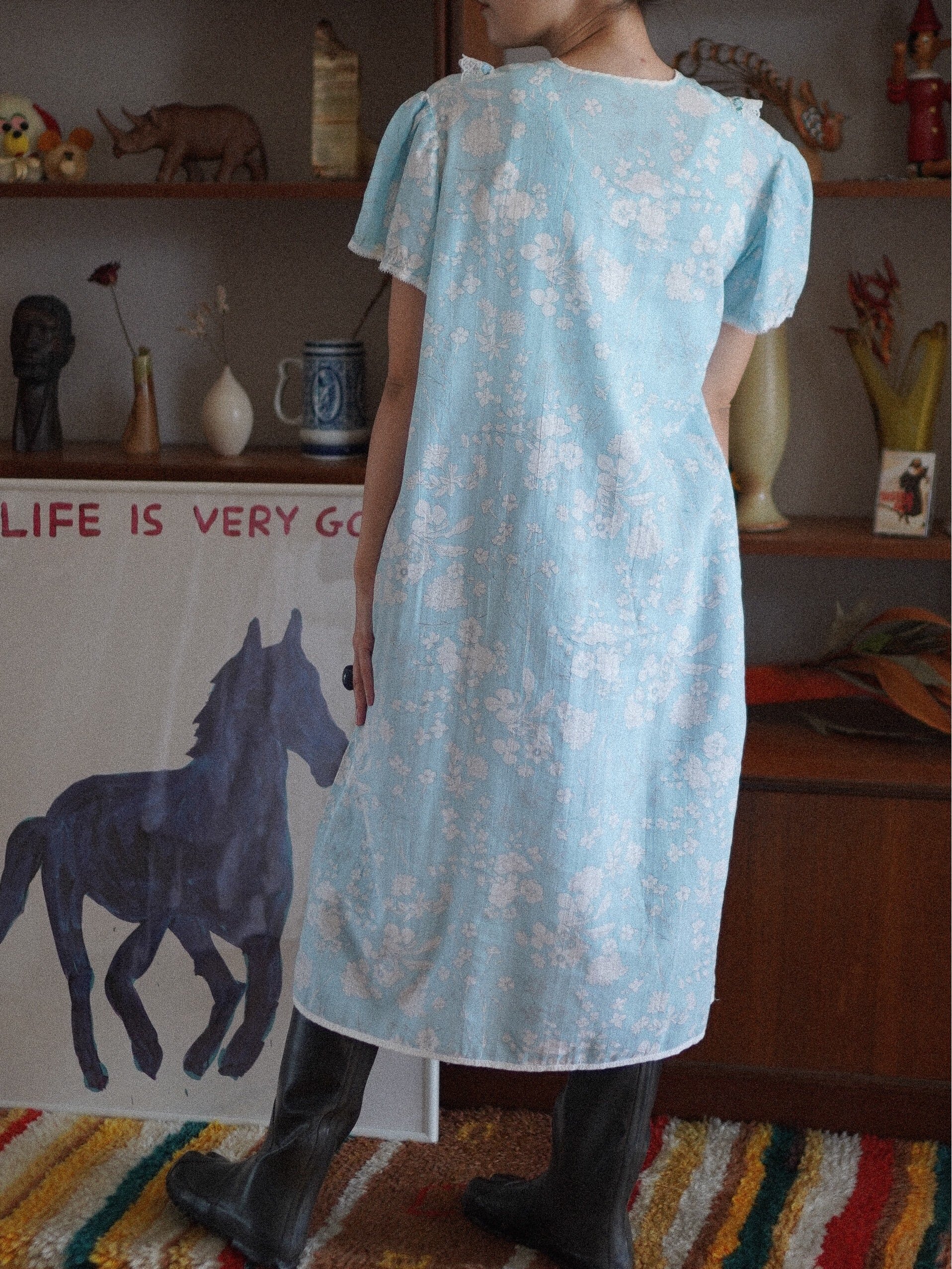 淡いスカイブルーに白いお花のプリントがキュートなヴィンテージナイトドレス。Vラインに重ねられたホワイトレースと、ポイントで使われたブルーのフラワーレースがチャームポイント。ネックラインはリボンで結ぶデザインで、バックスタイルもほんのりガーリーでキュートです。さらっとしたコットン生地で、夏でも快適に着ていただけます。秋はスウェットとロングブーツを合わせてもキュートです。冬はもこもこなニットと合わせても愛くるしいです。-sky blue floral night dress