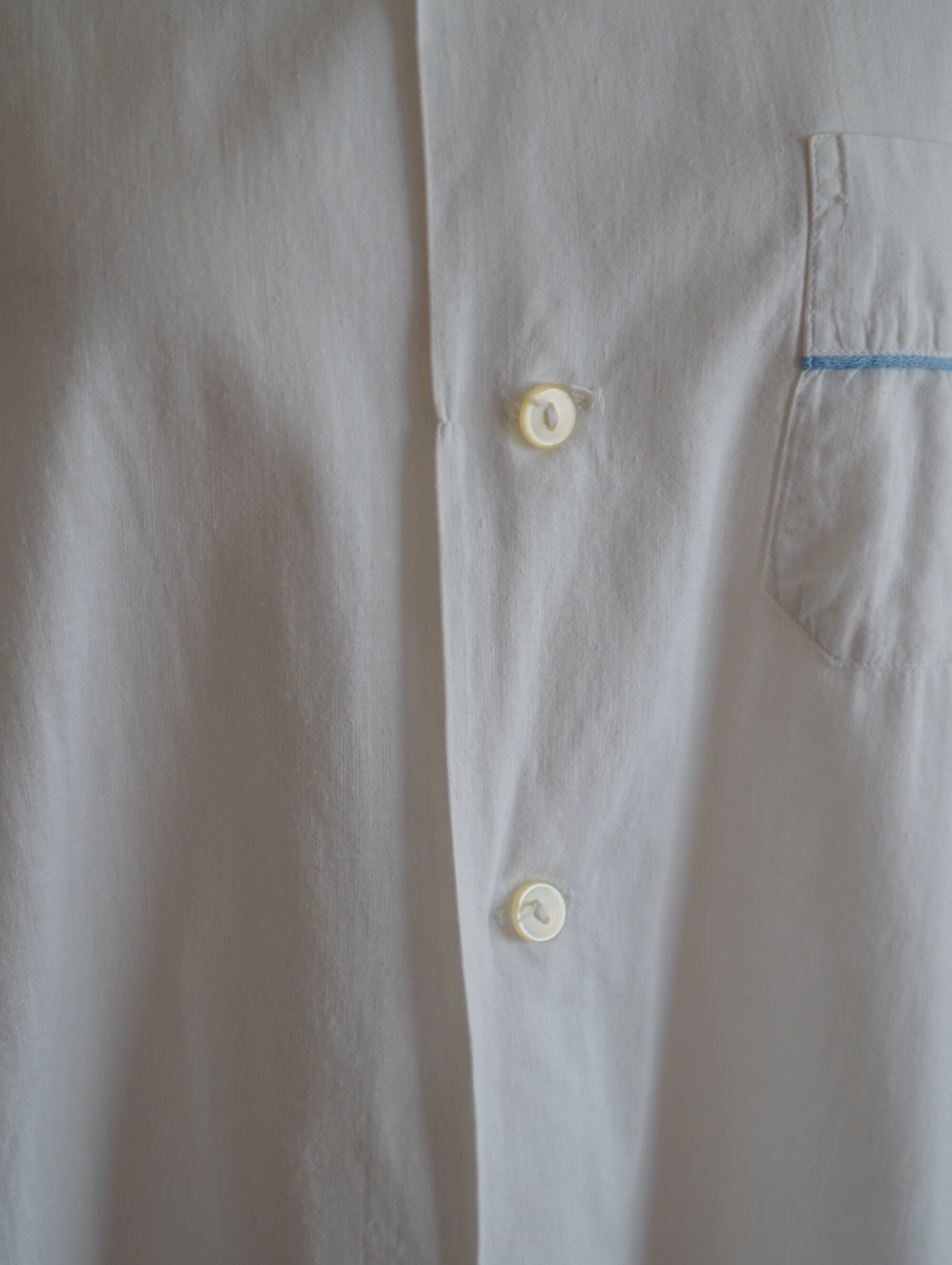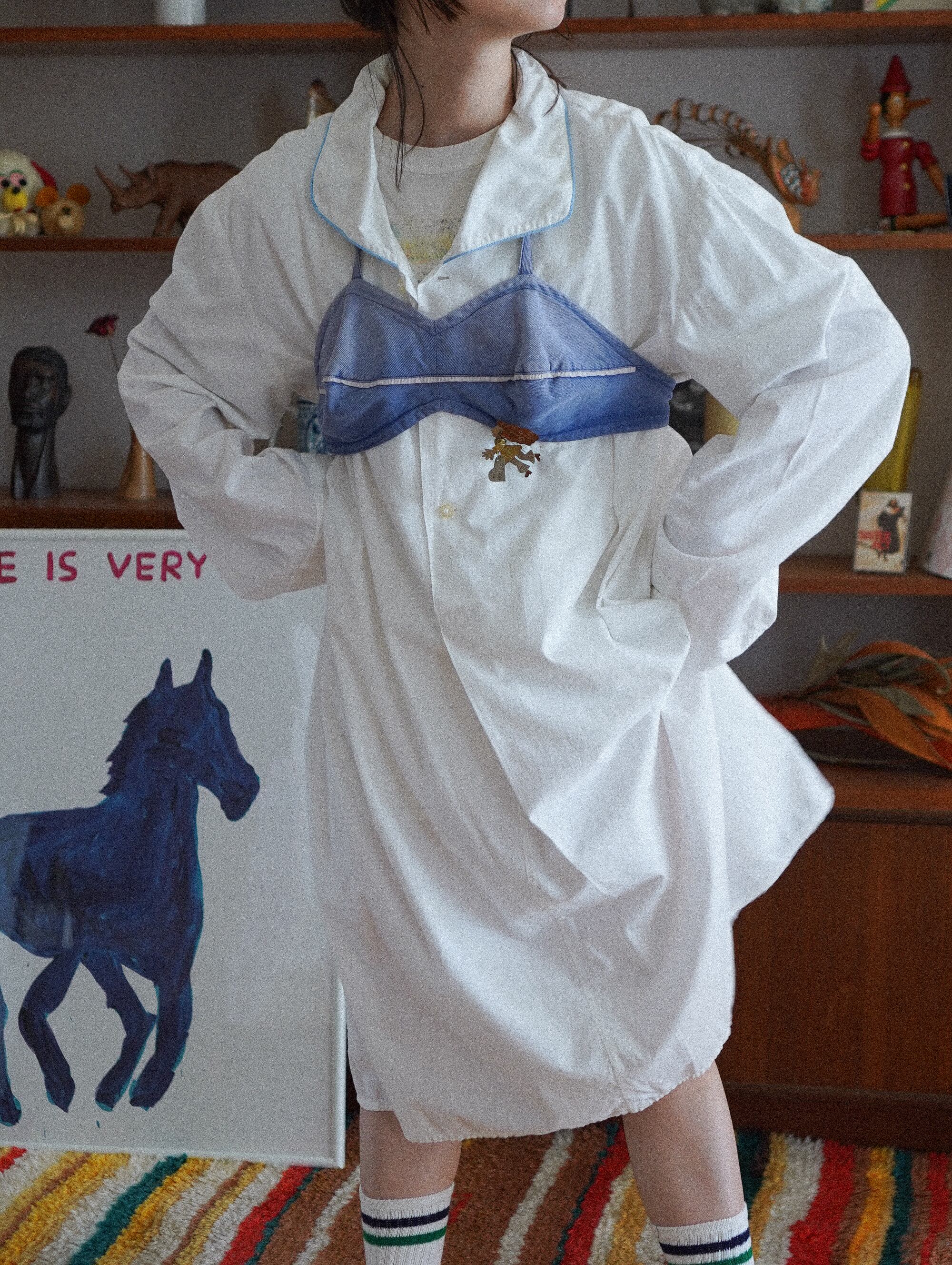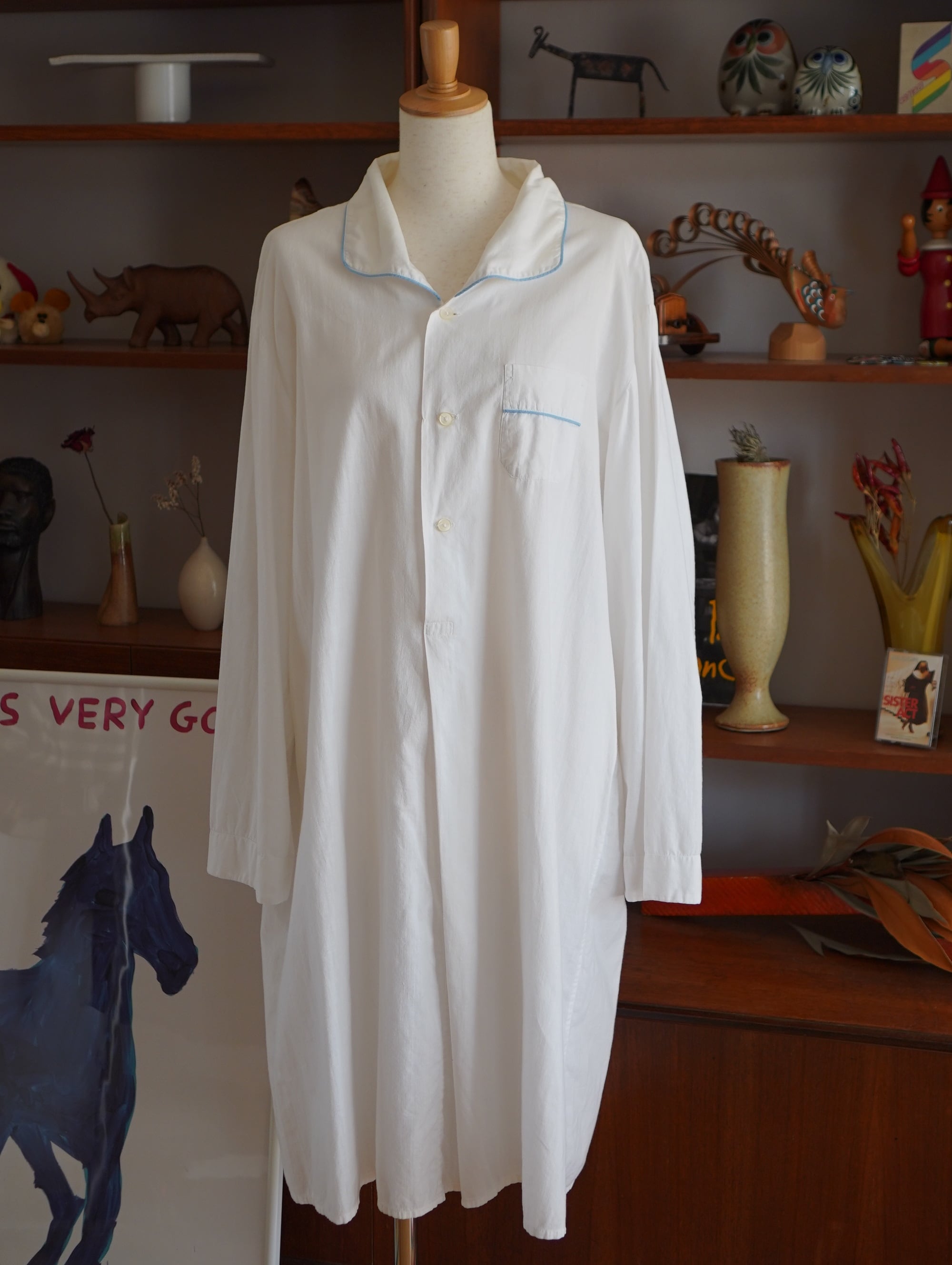 ハンガリー製のヴィンテージコットンで仕立てられた、パジャマシャツのような一着。程よい厚みと柔らかさを持つ古いコットン素材は、肌あたりが優しく、着込むほどに味わいが増していきます。身幅が広く、ゆったりと着用いただけます。ブルーのパイピングと大きめの開襟、胸ポケットがクラシカルで清潔感のある佇まい。元々は病院や施設用として使われていた可能性もある、実用的でしっかりとした縫製が特徴です。ワンピースとしての着用はもちろん、羽織りやルームウェアとしても活躍してくれる一枚。シンプルながら、背景にストーリーを感じるアイテムです。-hungarian cotton pajama shirt dress