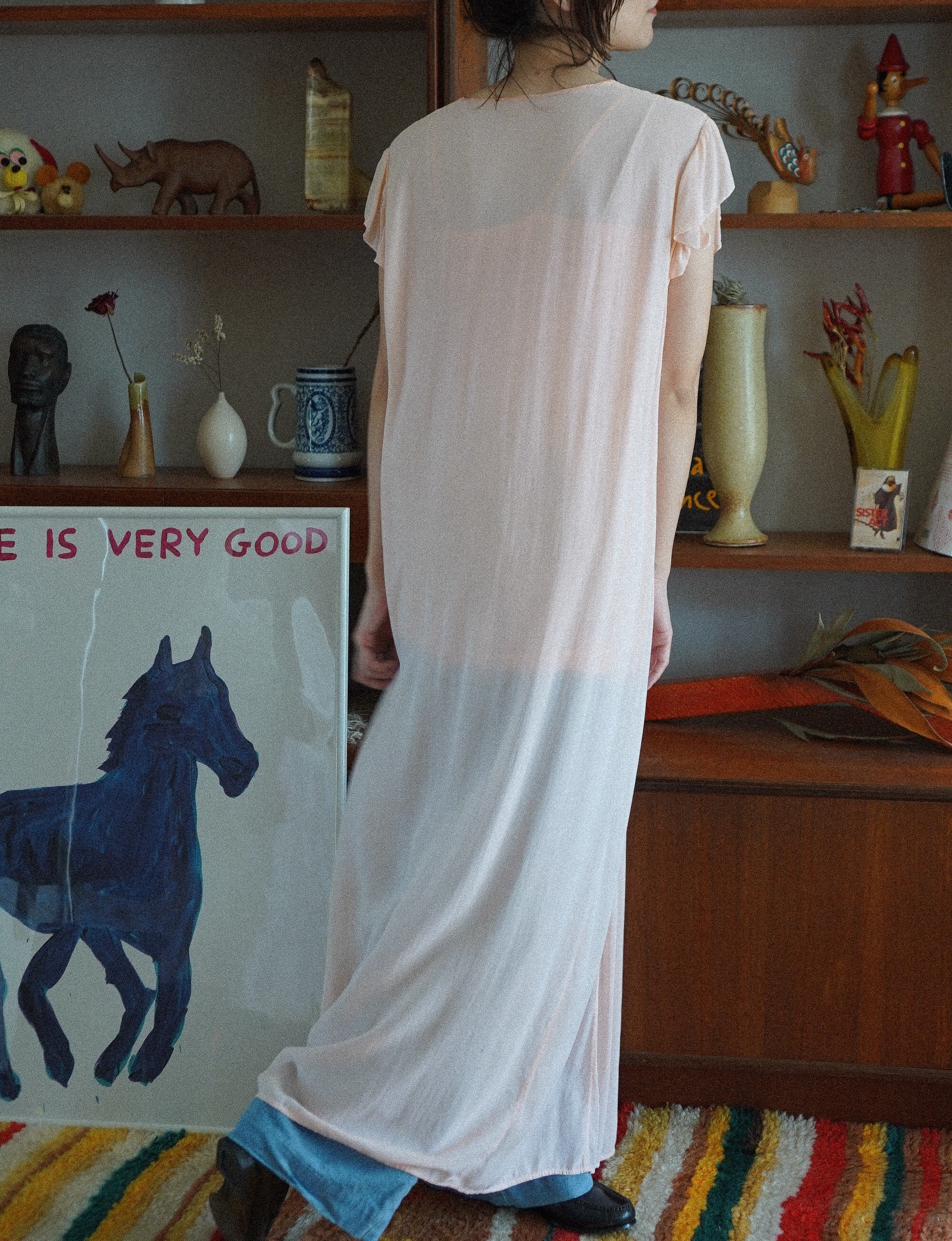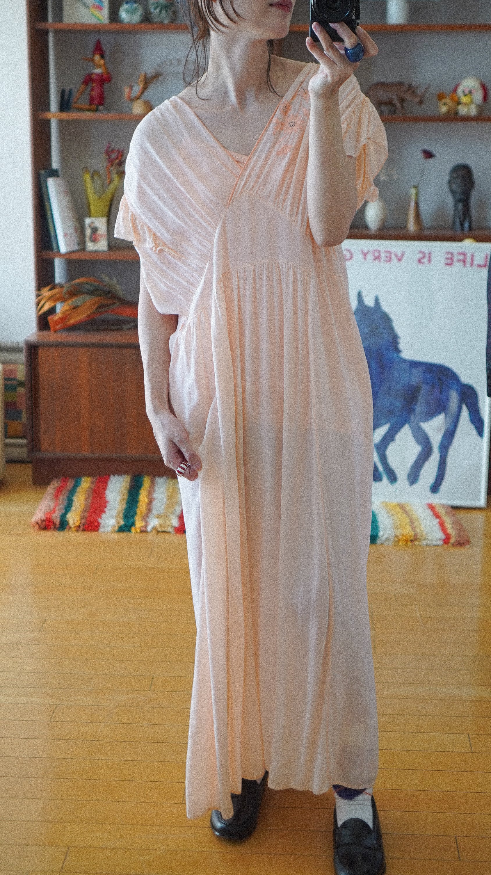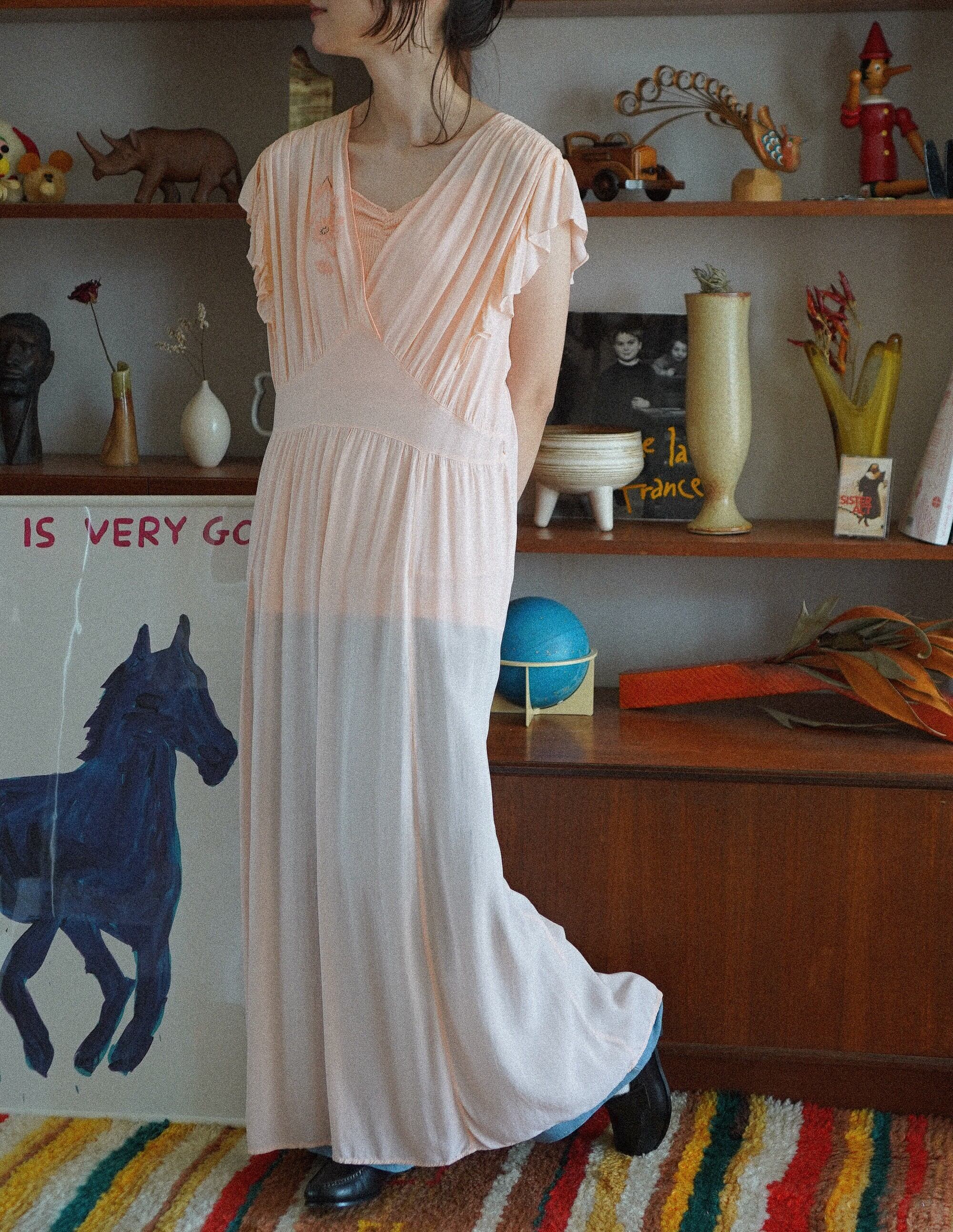 とろけるようなピーチカラーが美しい、ランジェリーライクなナイトドレス。柔らかく肌に吸い付くような薄手の生地に、肩から流れるようなフリルスリーブ、胸元にはキュートなおはなの刺繍が施されています。刺繍には異素材の立体パーツも使われており、さりげない存在感が魅力。Vネックラインとウエストの切り替えで、リラックス感の中にも女性らしいラインを感じられるシルエットです。お部屋で過ごす時間にも、旅先での朝にも。特別な気分になりたいときにぴったりの一着です。-floral embroidered peach nightdress