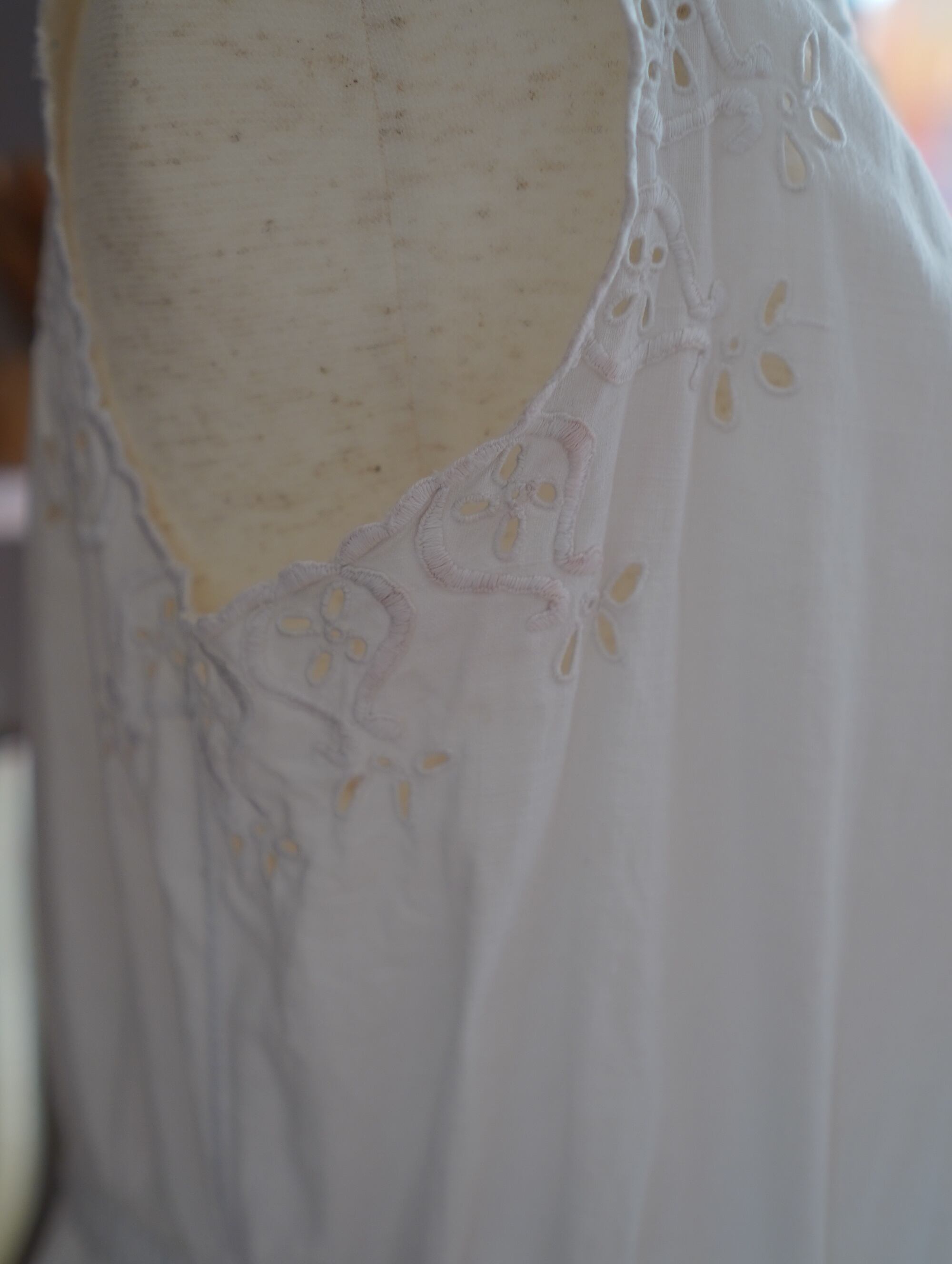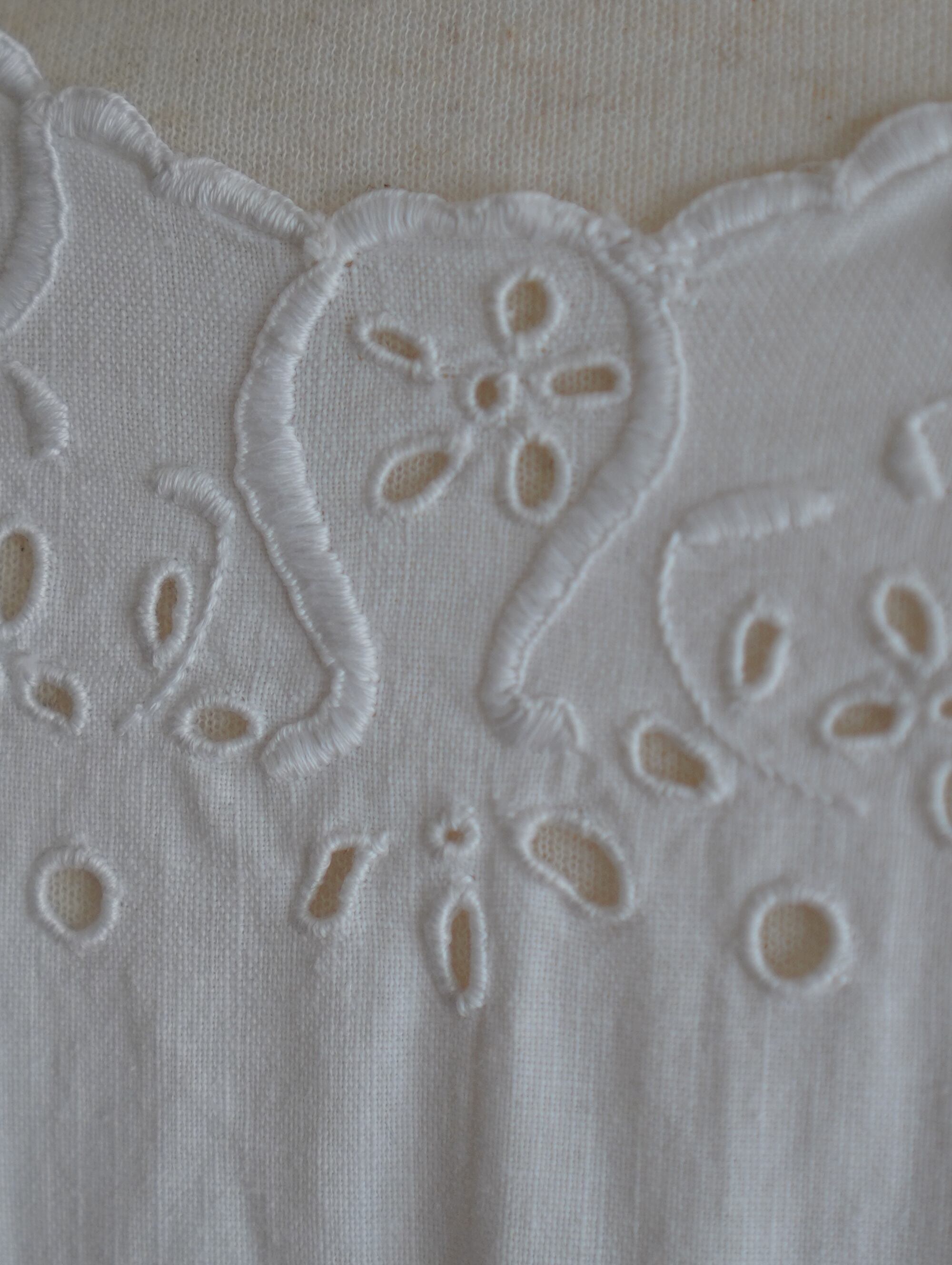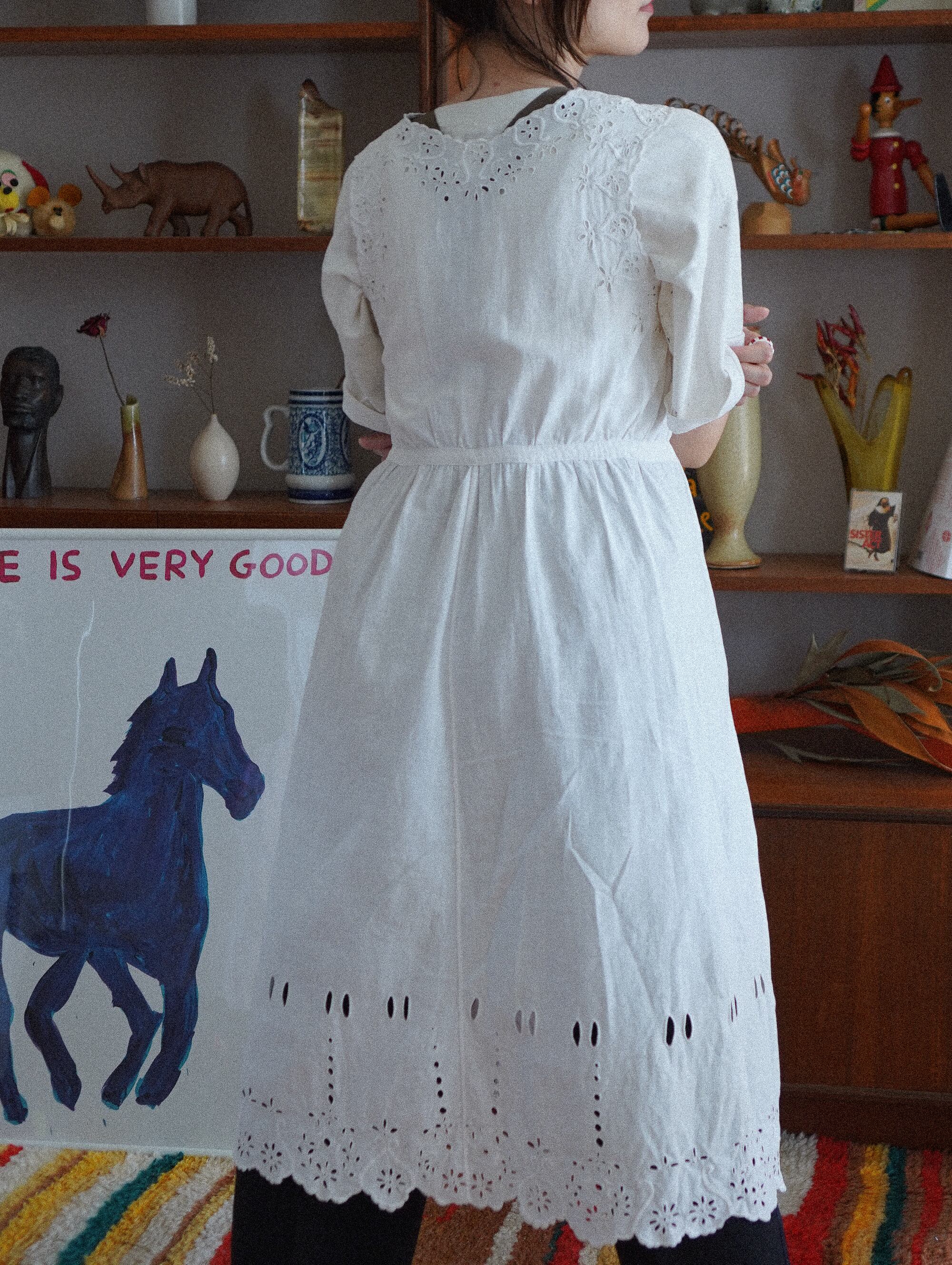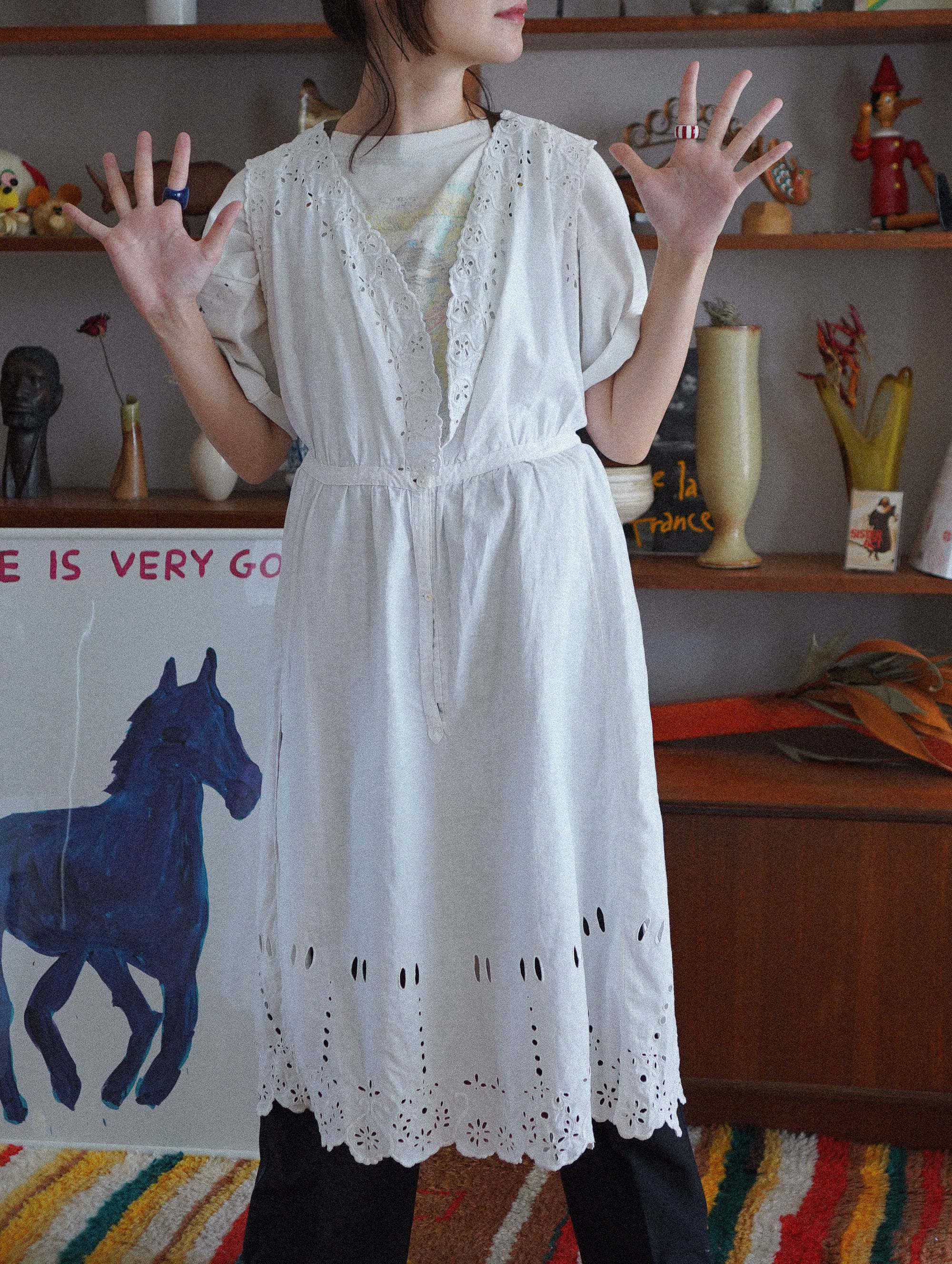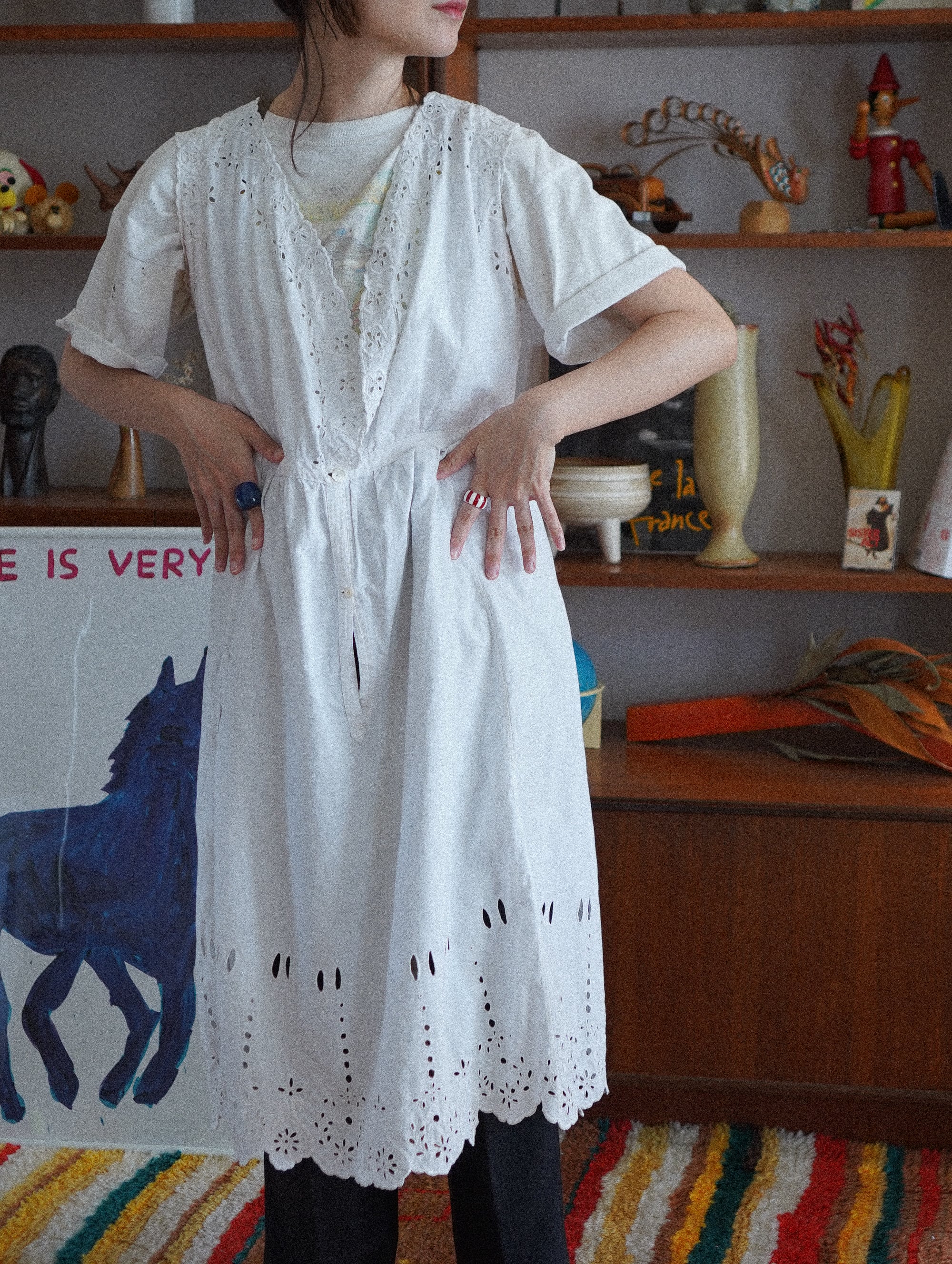 すべて手作業で仕立てられた、古い時代のワンピースです。程よく厚手でしっかりとしたコットンに、カットワーク刺繍がぐるりと施されていて、素朴なキュートがぎゅっとつまっています。ひと針ずつ縫われた刺繍のあたたかみで心がきゅんとするワンピースです。手しごとの服ならではの、やさしい空気をまとっています。ストレスなく、すとんと着用いただけます。秋冬はスウェットやニットと重ねたり、春夏は一枚でさらりと、季節問わず活躍してくれるアイテムです。-antique cutwork cotton dress