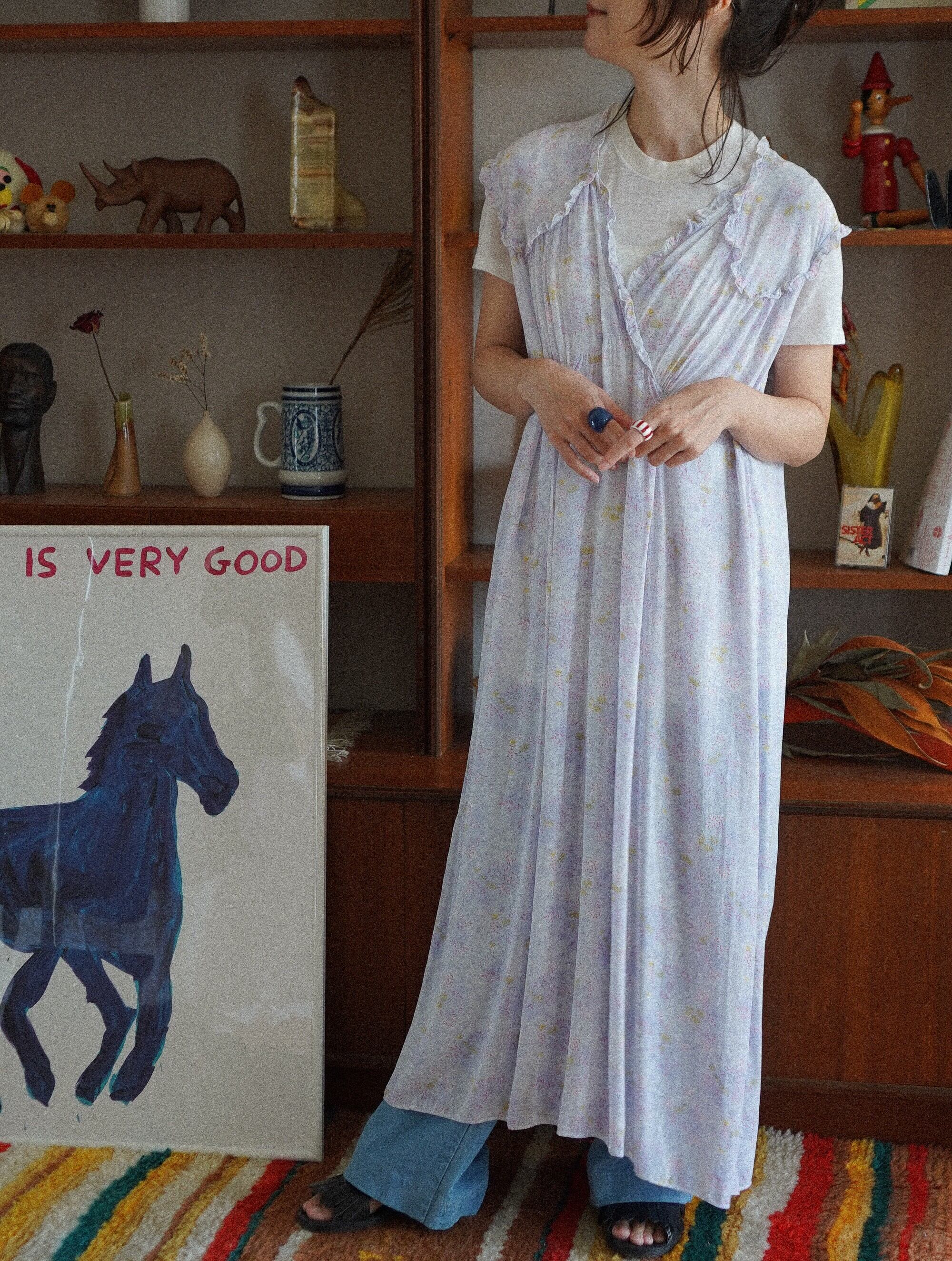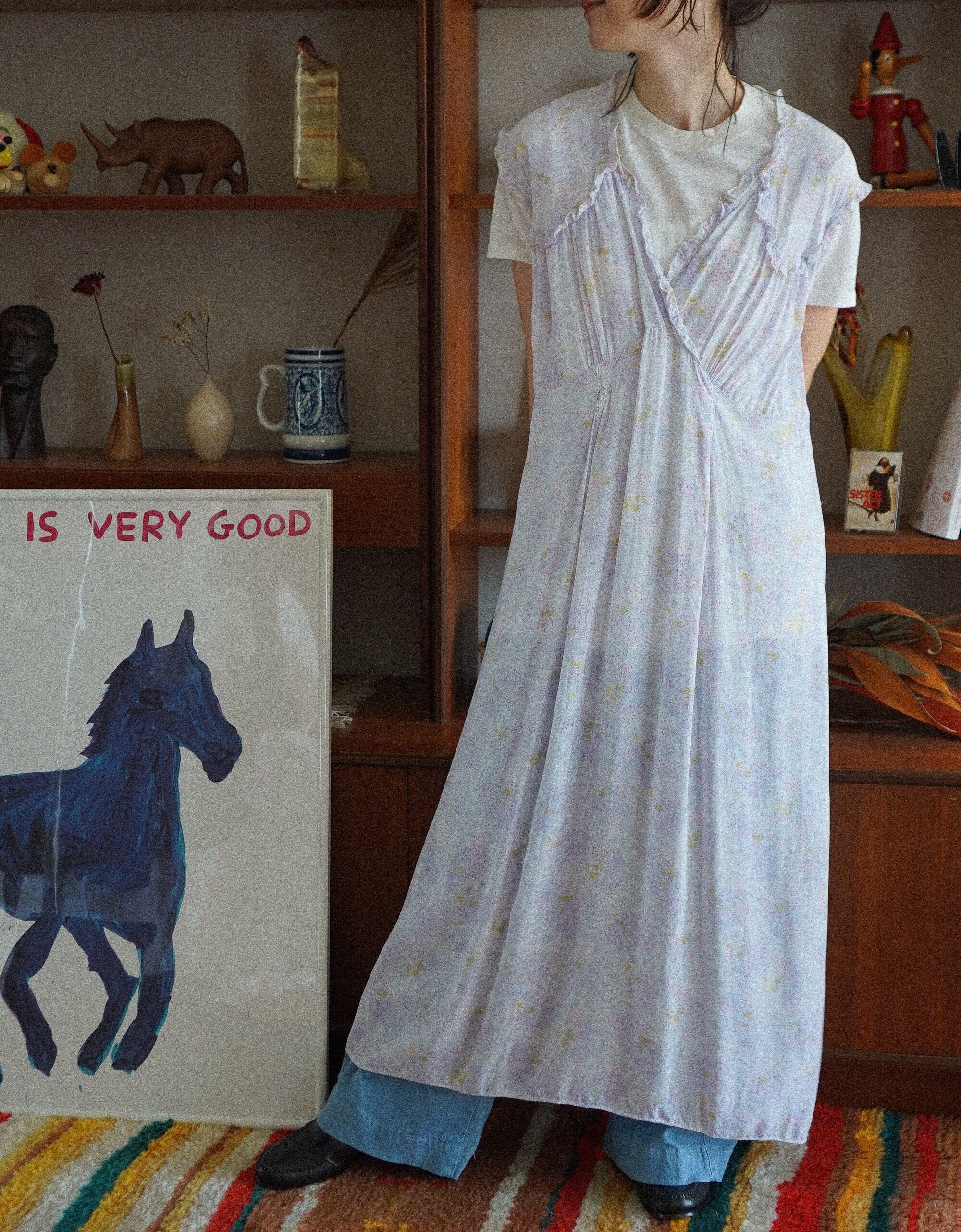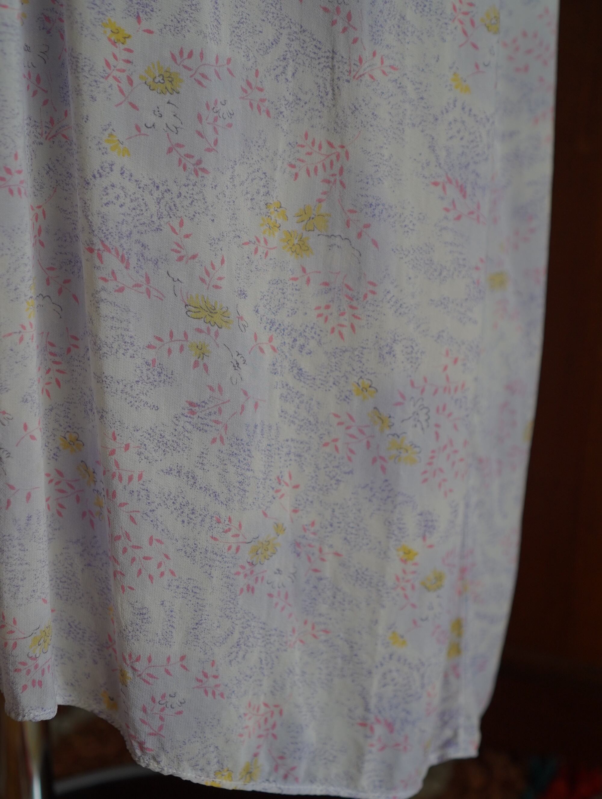 やわらかなラベンダーグレーのベースに、ピンクやイエローの小さなおはながふんわりと舞うように描かれた、軽やかなナイティ。ほんのり透け感のある、とろみ素材のヴィンテージファブリックで肌触りがとても良いです。お部屋でゆったりと過ごすときにも優しくさっと着るだけで、気分をきゅんと明るくしてくれます。-soft violet floral nightdress