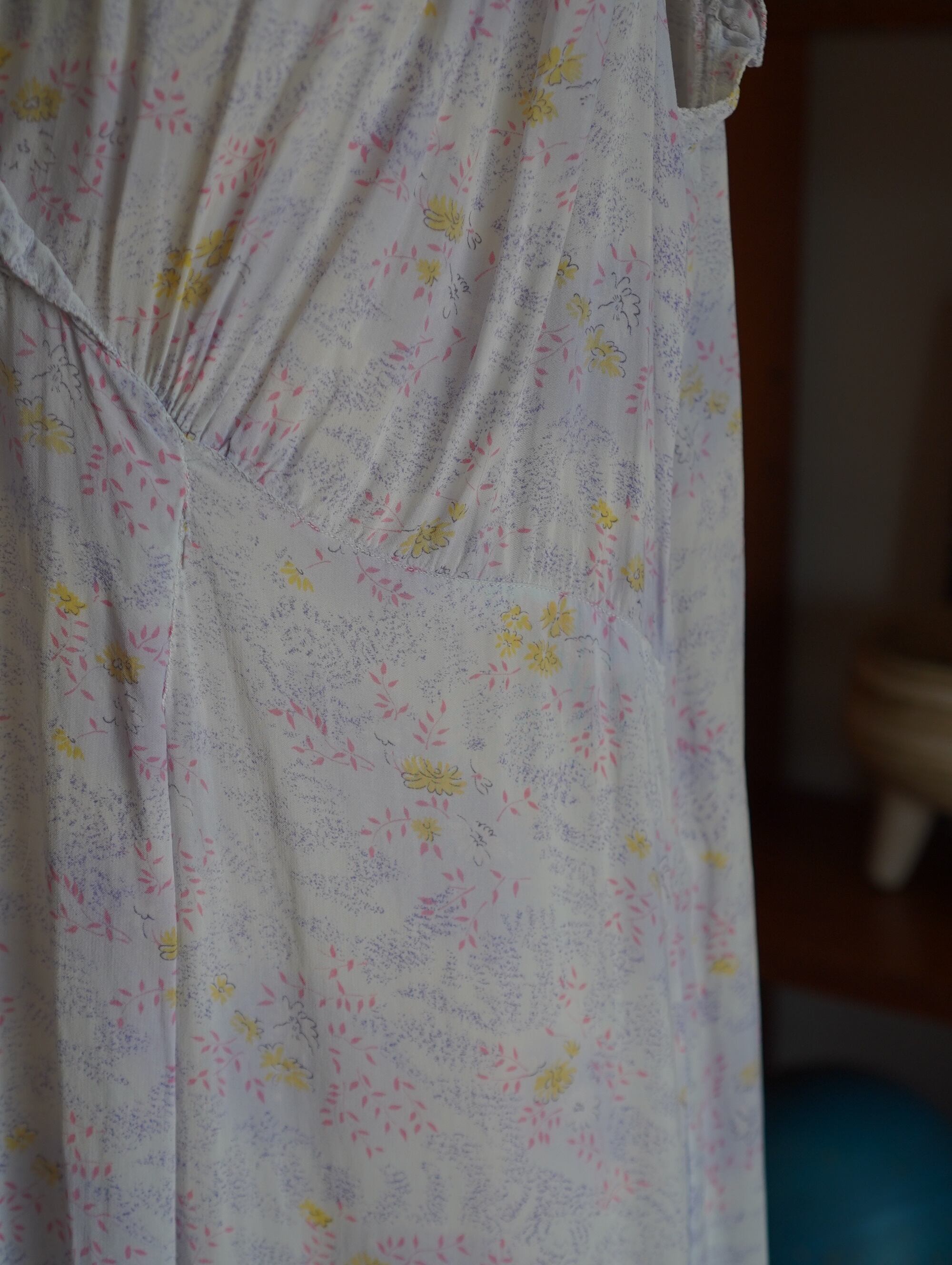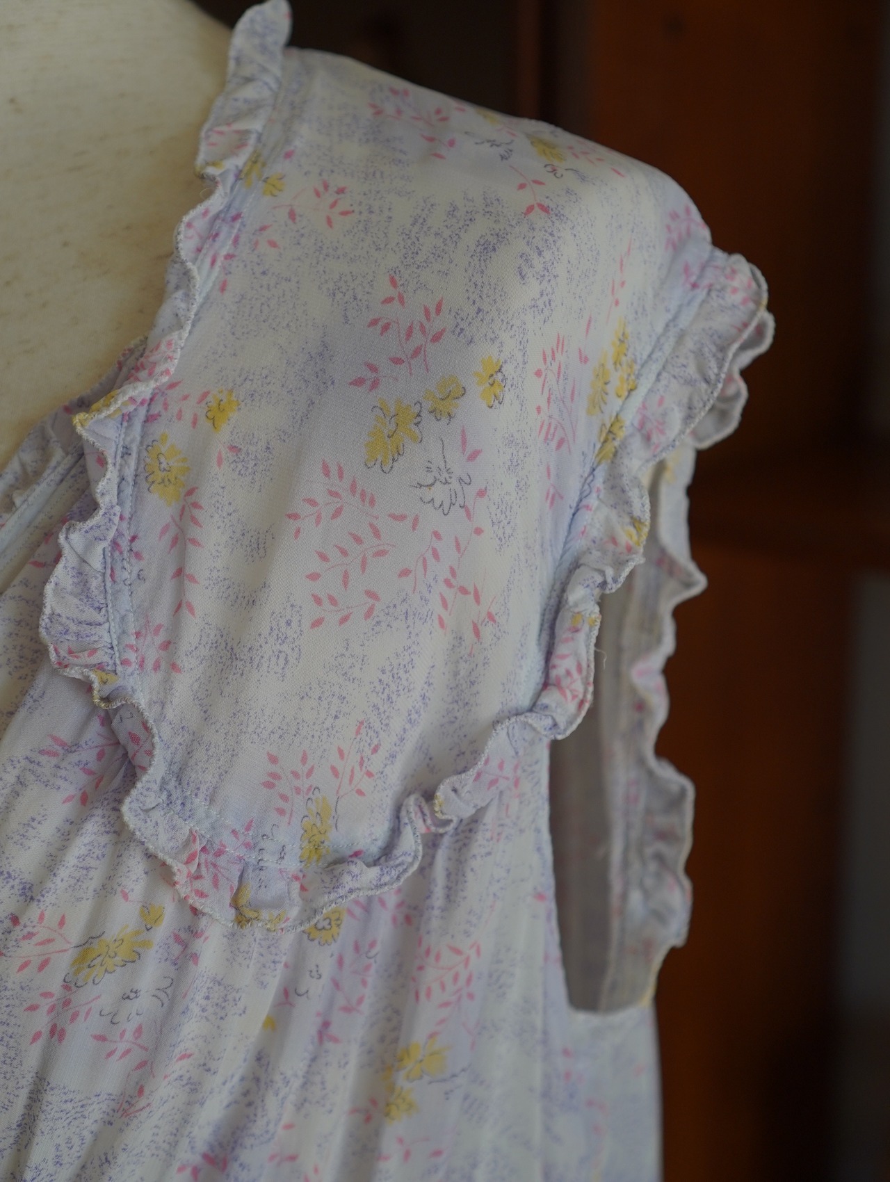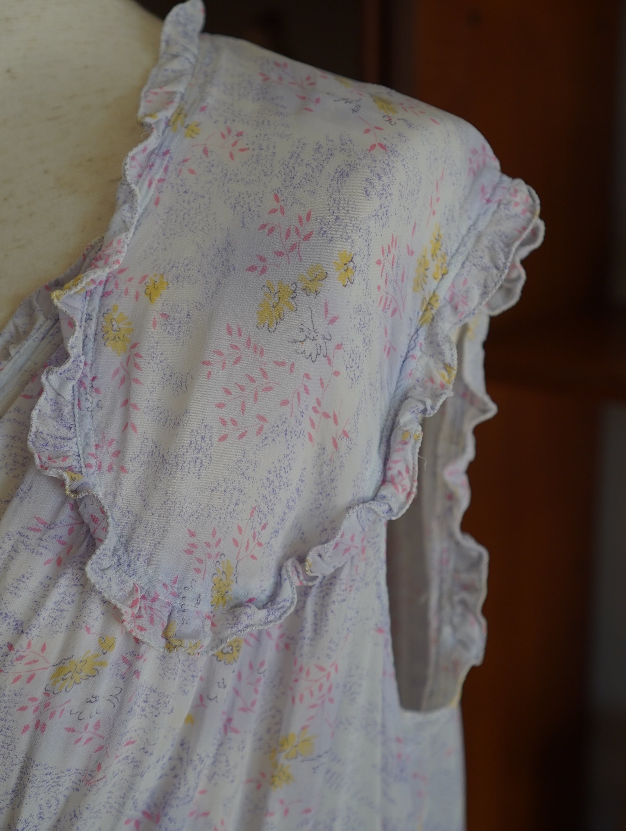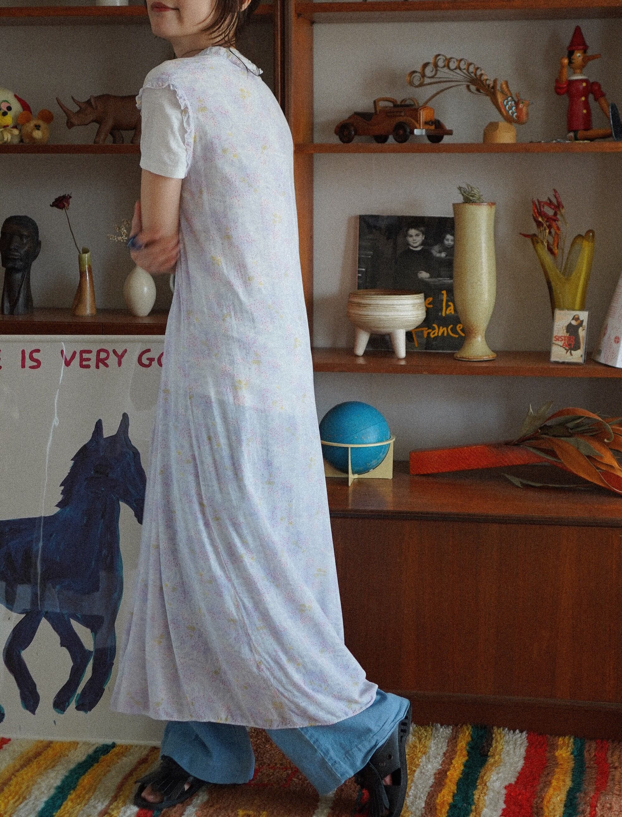 やわらかなラベンダーグレーのベースに、ピンクやイエローの小さなおはながふんわりと舞うように描かれた、軽やかなナイティ。ほんのり透け感のある、とろみ素材のヴィンテージファブリックで肌触りがとても良いです。お部屋でゆったりと過ごすときにも優しくさっと着るだけで、気分をきゅんと明るくしてくれます。-soft violet floral nightdress