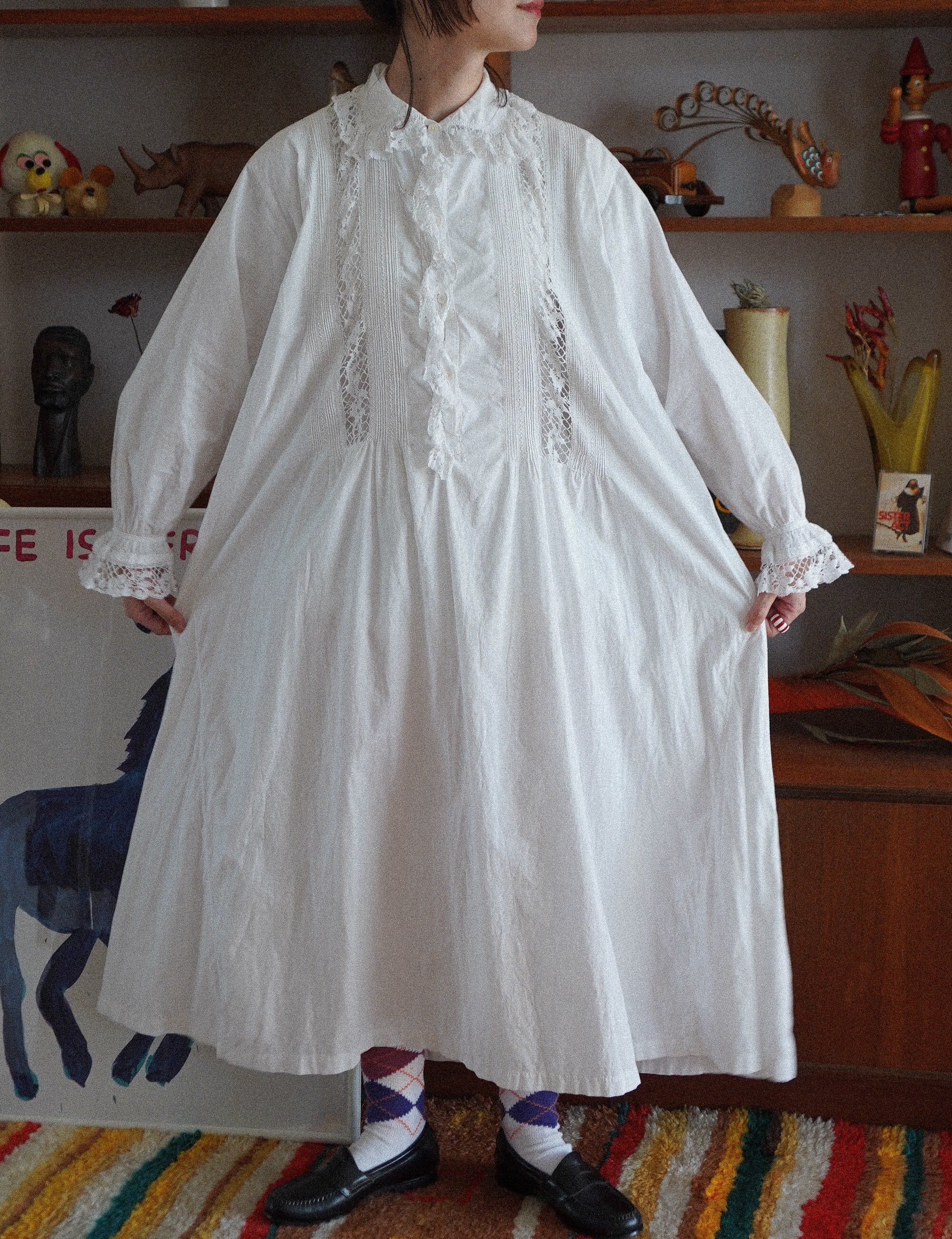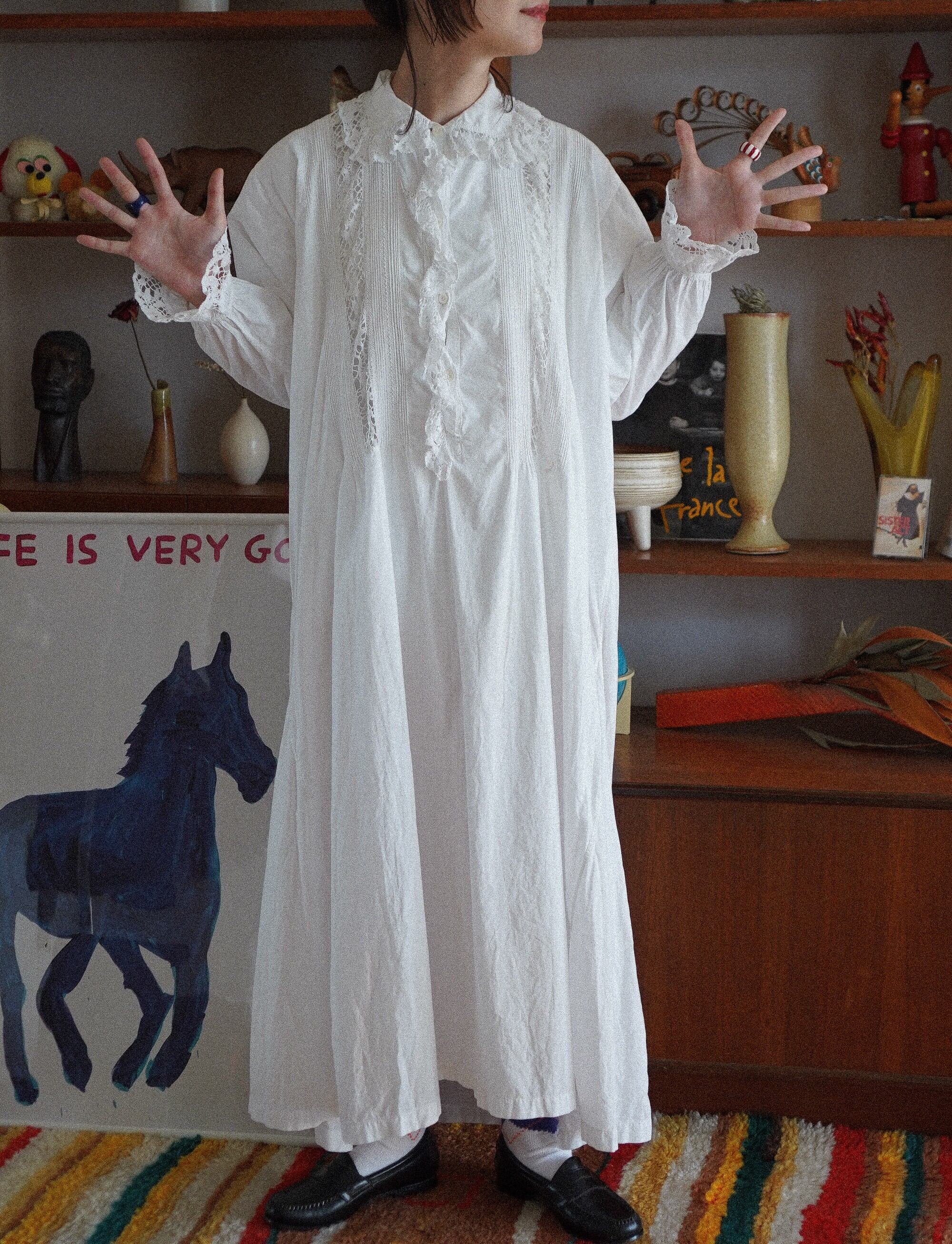 やわらかく、ふっくらとした風合いのアンティークコットンで仕立てられた、繊細なレースと刺繍が最高にキュートなホワイトドレス。生地自体は1900年代ごろのものと思われ、しっとりとした優しい手ざわりで心癒されます。細かなピンタックや、ふわりと揺れる胸元のフリル、袖口や身頃にあしらわれたレースも、ひとつひとつが丁寧で見ているだけで癒されます。胸元のピンタックの間にひょっこりとカットワーク刺繍が施されており、そんなところもきゅんポイントです。仕立てには、古い足踏みミシンによる細かな縫い目が見られ、当時の手しごとの温度がやさしく残る一着です。-old cotton pintuck & lace dress