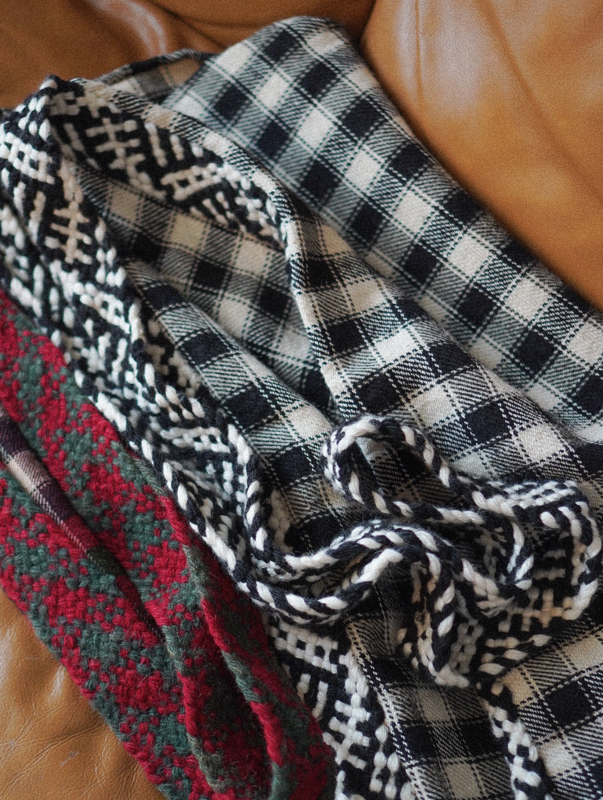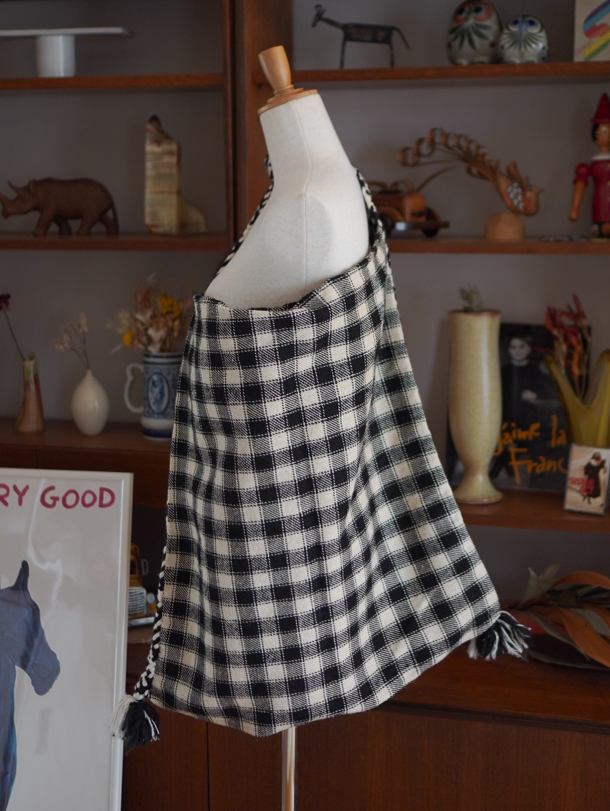 黒×白のギンガムチェックがクラシックな雰囲気を演出しつつ、太めのショルダーストラップには手織りならではの立体感ある模様が施されています。先端にはふわっと揺れるタッセル付きで、民族的な温かみと遊び心がプラス。シンプルなモノトーンカラーはコーディネートに取り入れやすく、秋冬の厚手ニットとも相性抜群。