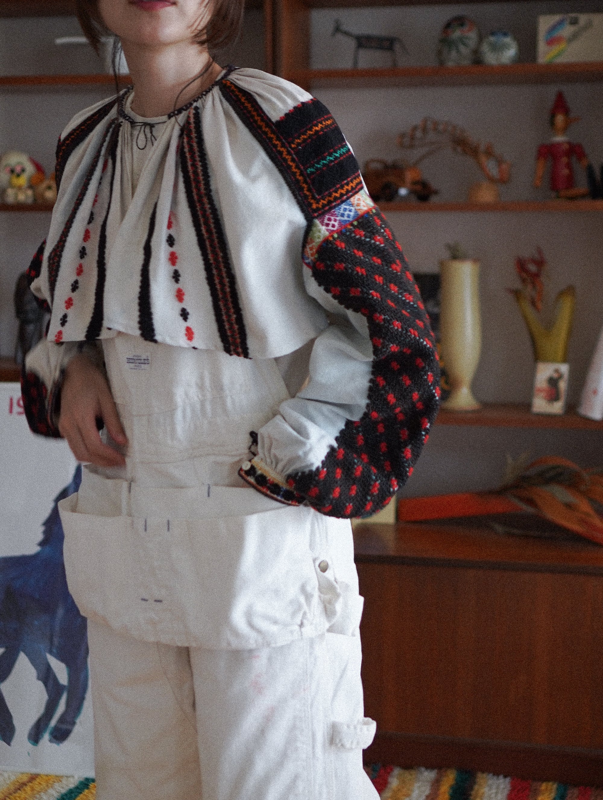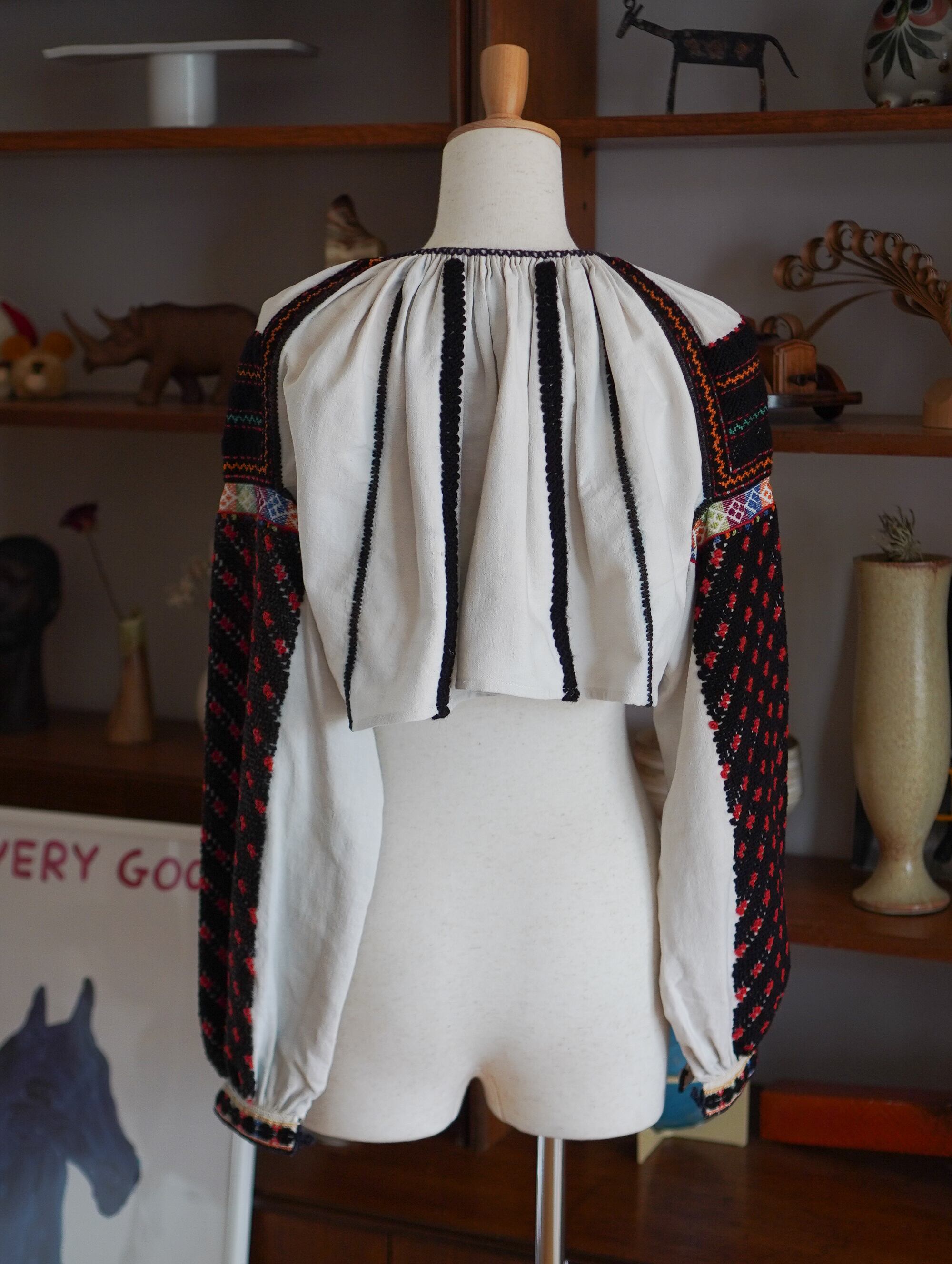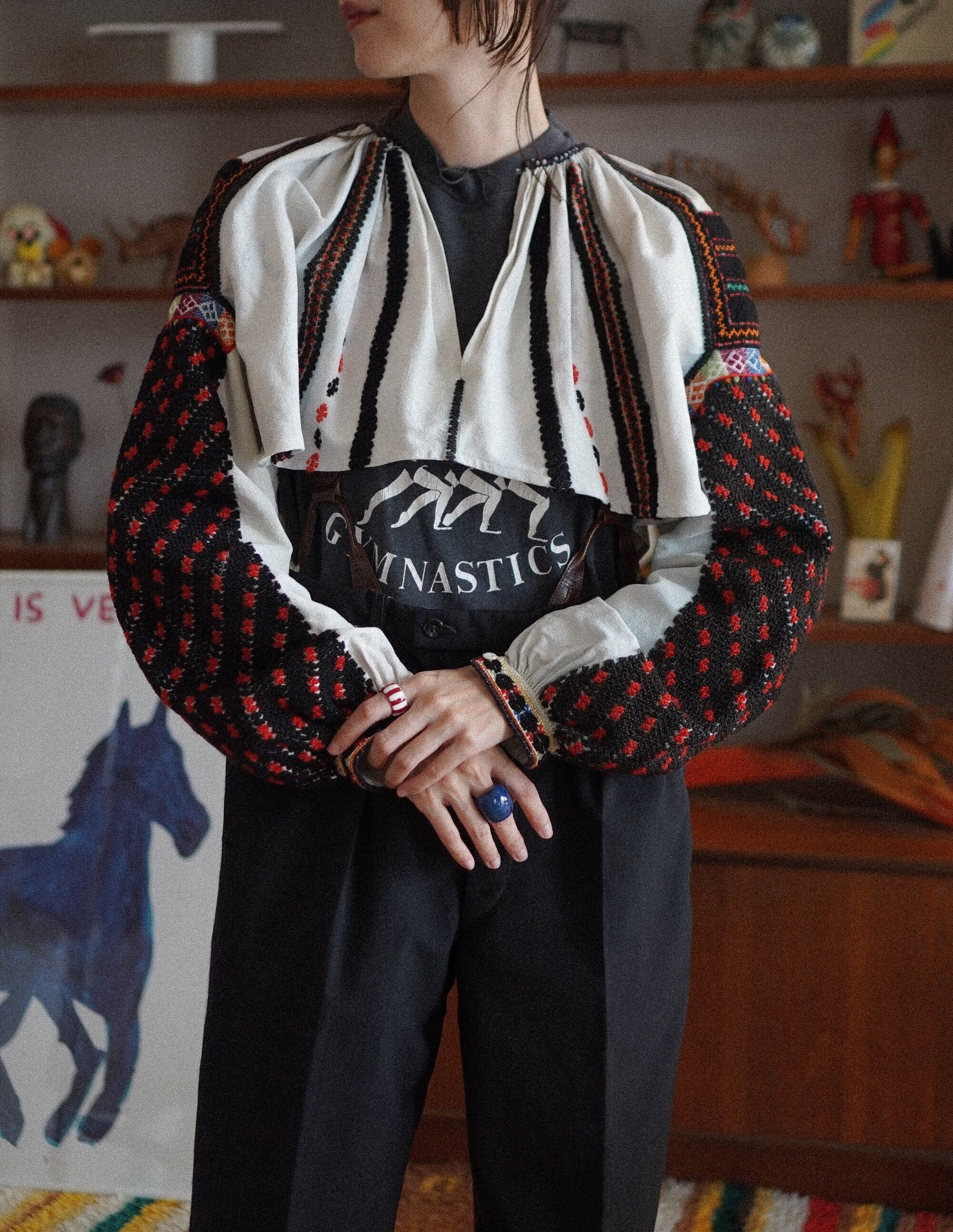 ルーマニアのマーケットで出会った、とてもスペシャルな民族衣装のブラウス。黒地に映えた赤と白のクロスステッチ、カラフルな幾何学模様の帯刺繍が施された袖は、ルーマニアのおばあちゃんの手仕事そのもの。胸元や背中にはたっぷりとギャザーが寄せられ、動くたびにふわりと揺れるシルエットに。古い民族衣装ならではの風合いと、長い時間をかけて受け継がれてきた刺繍の力強さ。着ているだけで心強くなれるような特別な一枚です。-romanian folk embroidered blouse with colorful sleeves