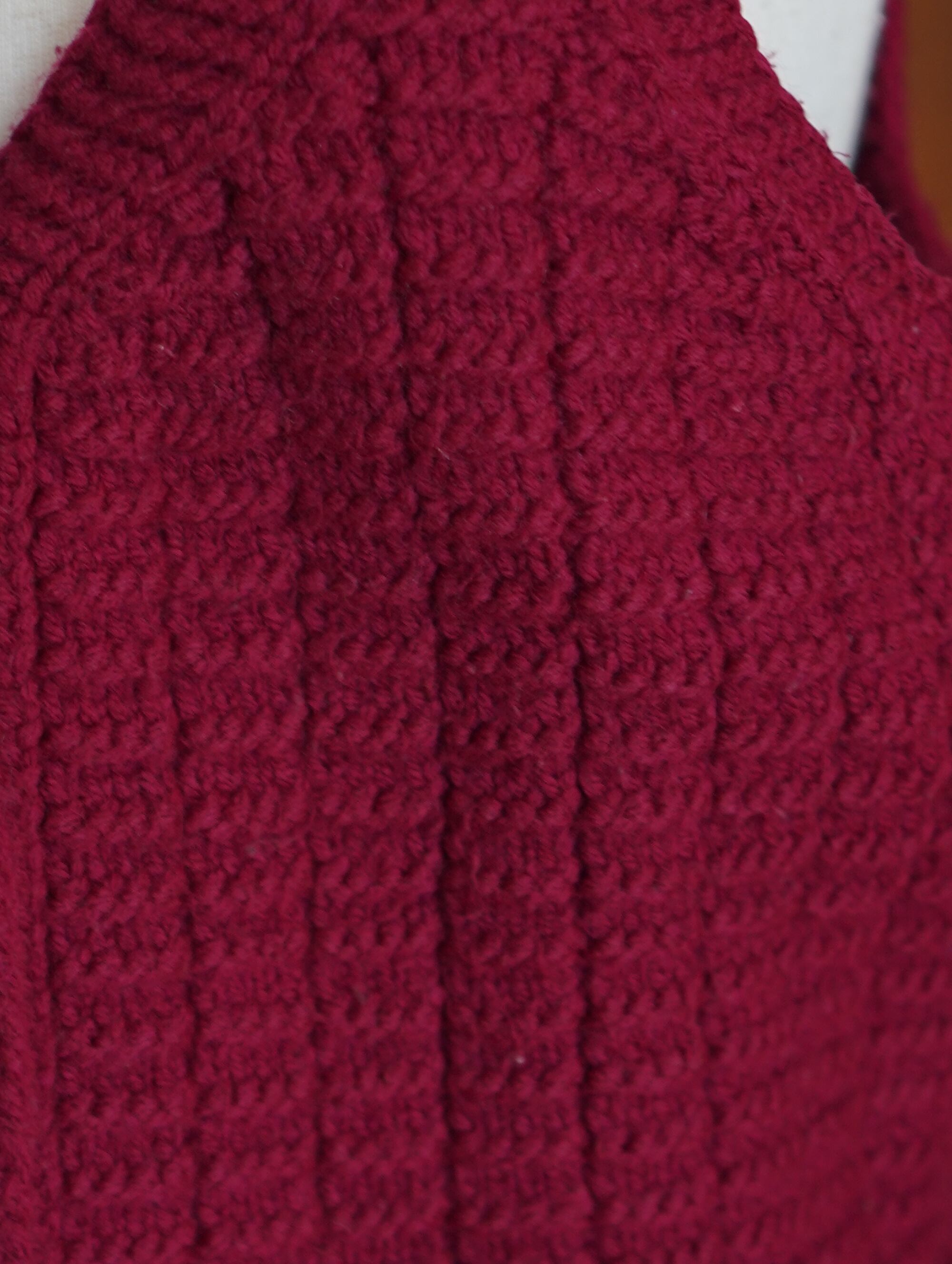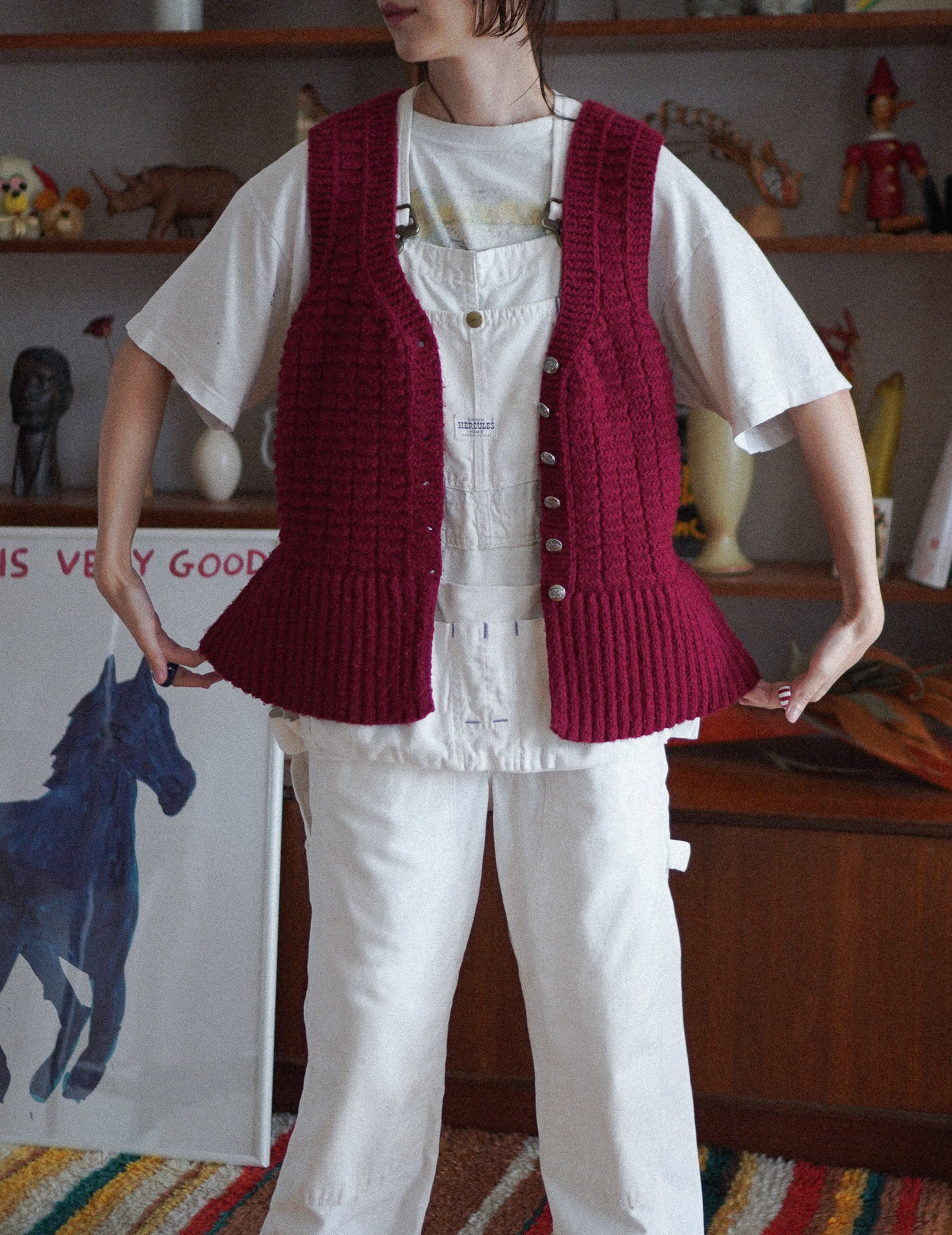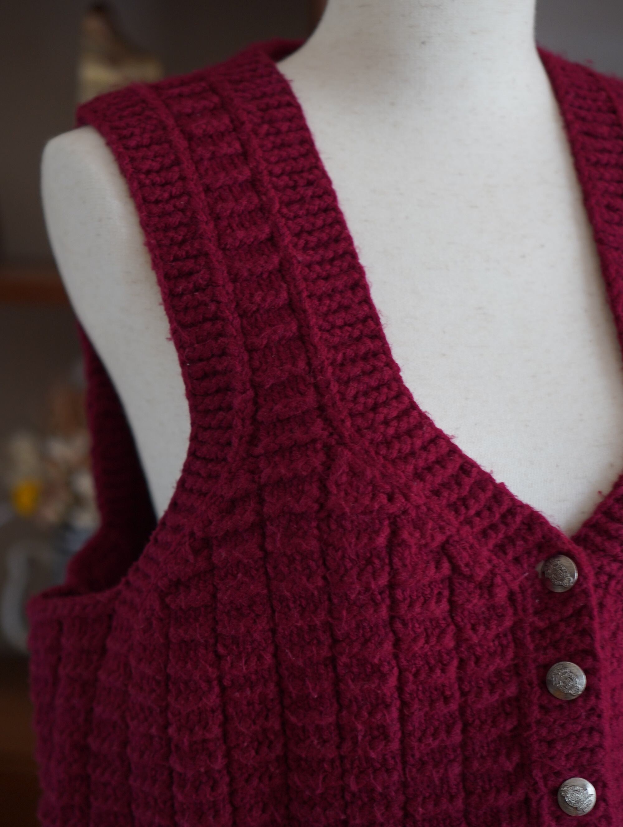 やわらかくてあたたかな毛糸が使われており、ふんわりとしたウエストシルエットがとっても愛おしい一枚です。フロントに並んだシルバーボタンがアクセントになり、シンプルながらもフォークロアな雰囲気を漂わせます。ワンピースやブラウスの上から重ねるだけで、秋冬のコーディネートをぐっとあたたかく、かわいらしくしてくれます。ぬくぬくとした手編みならではの温もりを、ぜひお楽しみください。-romanian folk handcraft deep cherry red wool knit vest