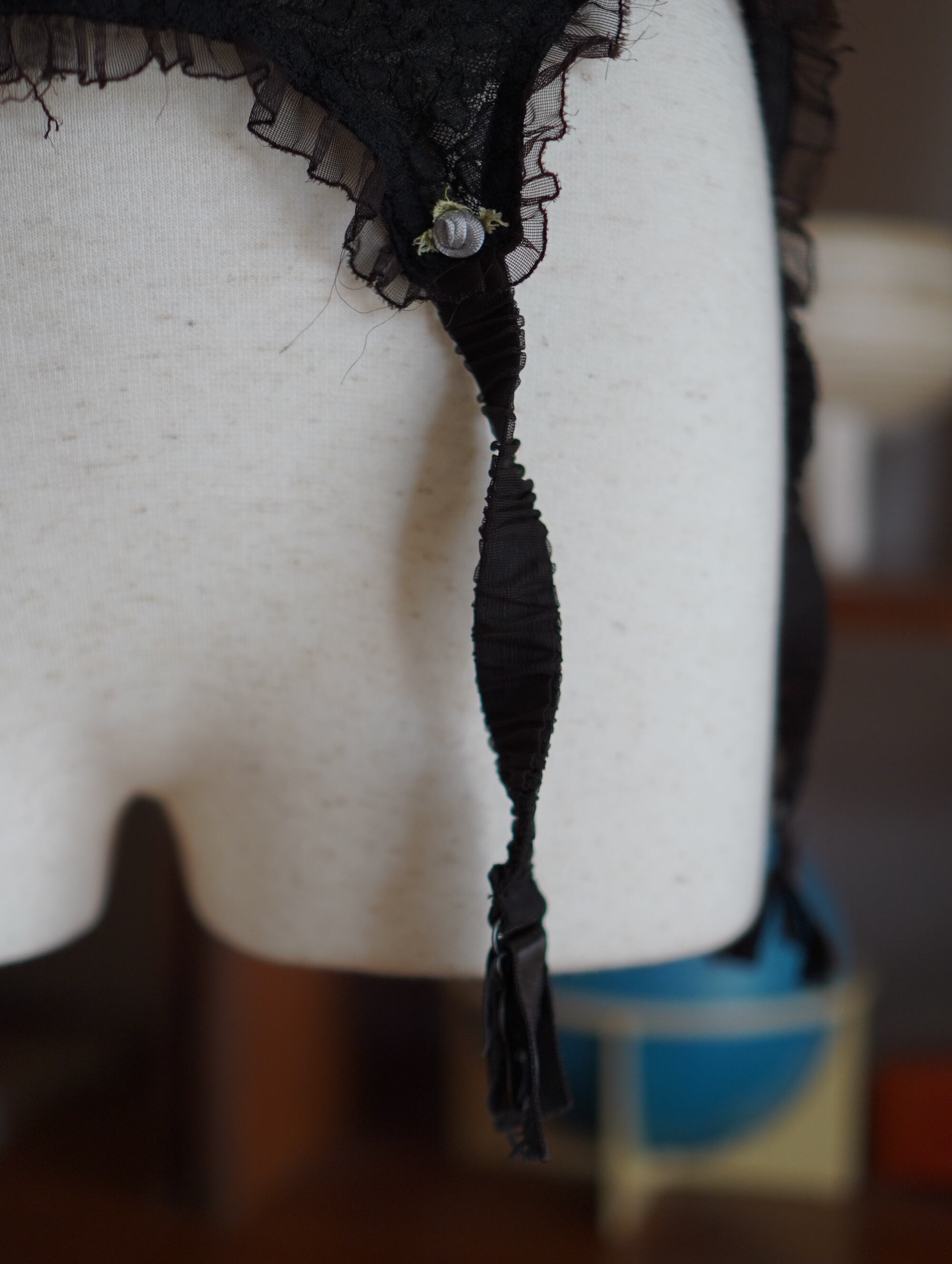 繊細な黒レースに、チュールのフリルが優しく縁取られたデザインが美しい1950's頃のガーターベルト。両サイドの小さなブルーローズの刺繍モチーフが、愛くるしいチャームポイント。ガーターベルトの先端には、当時特有のラバー製のまるい留め具が。ラベルには“Casa Marina – RIO–PARIS”の文字。リオデジャネイロとパリを繋ぐ高級ランジェリー店であったことを示すもので、フランスらしい繊細な装飾美と、南米との文化交流も感じさせてくれる一枚です。