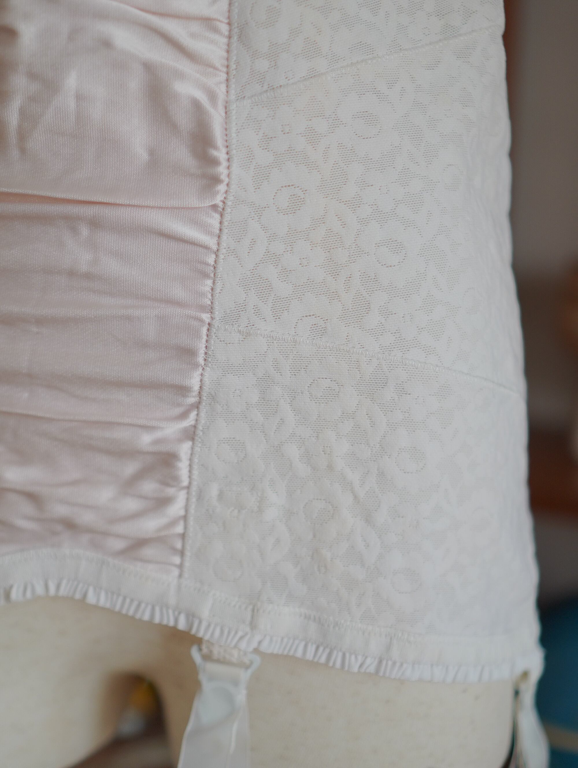 国内でもなかなか出会えない、スイス製の美しいガータースカート。花模様の織りに、淡いピンクサテンのパネルがチャームポイント。丁寧に使われてきたやさしさが、そっと肌に寄り添います。淡いピンクのサテンと、繊細な花柄メッシュの組み合わせが美しく、前面のサテンパネルがほんのり光沢を放ち、女性らしい雰囲気を引き立ててくれます。両サイドと後ろは通気性のあるメッシュ地で、軽やかな着心地。ランジェリーとしてはもちろん、レイヤードのポイントにもおすすめです。程よく伸縮性もあり、安心して着用いただけます。-1960~70s Satin Mesh Garter Skirt made in Switzerland