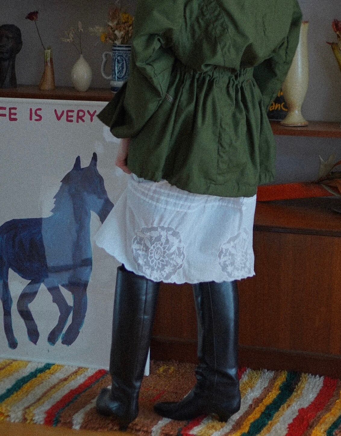 裾にあしらわれたサークル状のレースモチーフと、繊細に並んだピンタックがチャームポイント。胸元にはゴムなどは入っておらず、ストンと落ちるナチュラルなシルエット。春夏は一枚で、秋冬はタートルやカットソーと重ねて季節を問わず楽しめます。上からぱふっとニットやスウェットを着ても、ジャケットから裾をちらっと見せるのもキュートです。-pin-tuck & circle lace french antique cotton dress – lace strap remake