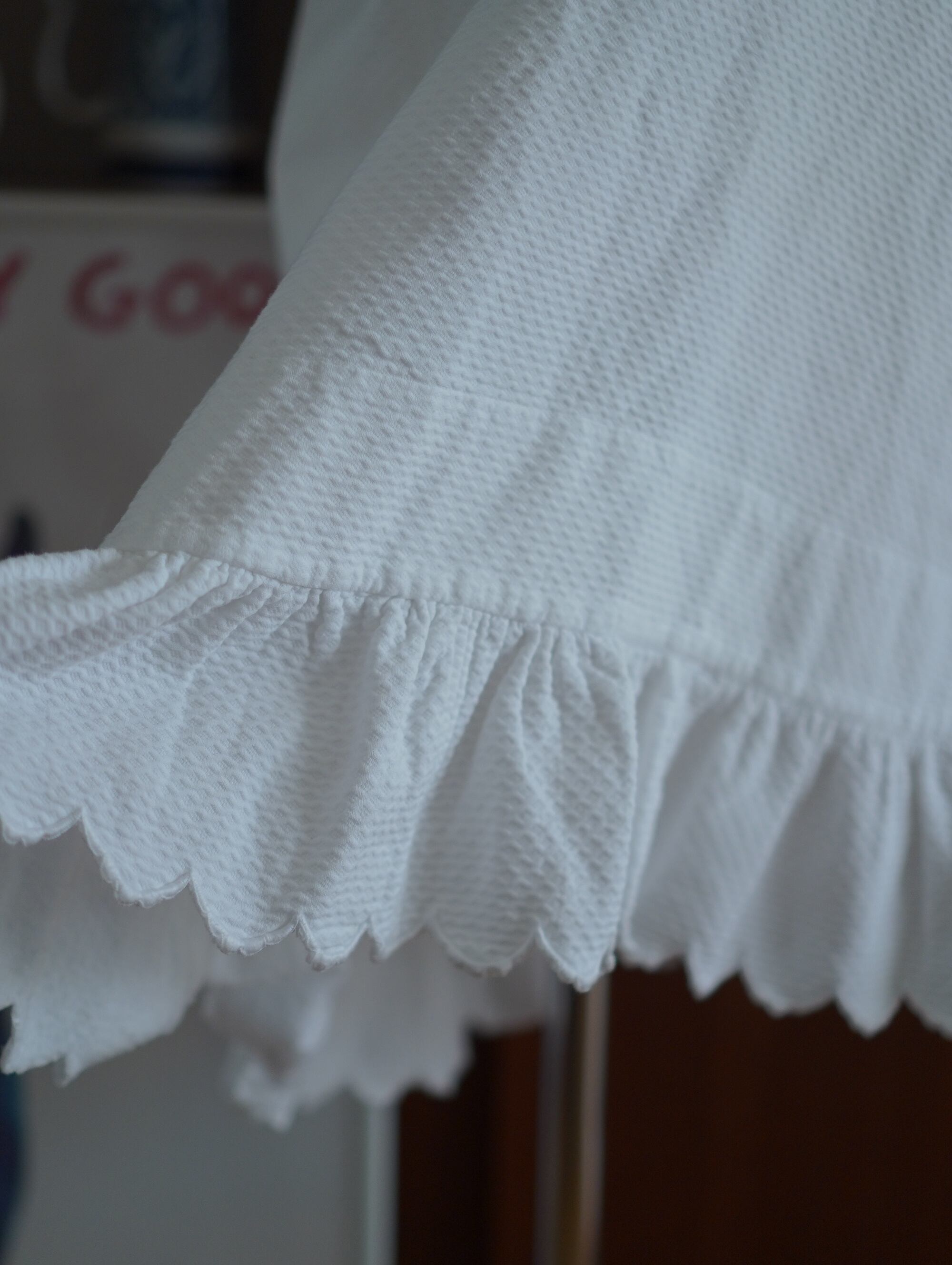 特に目立ったダメージはございませんが、肩ひもに使っているレースリボンはとても繊細なアンティークのため、お洗濯はやさしく手洗いでのケアをおすすめします。