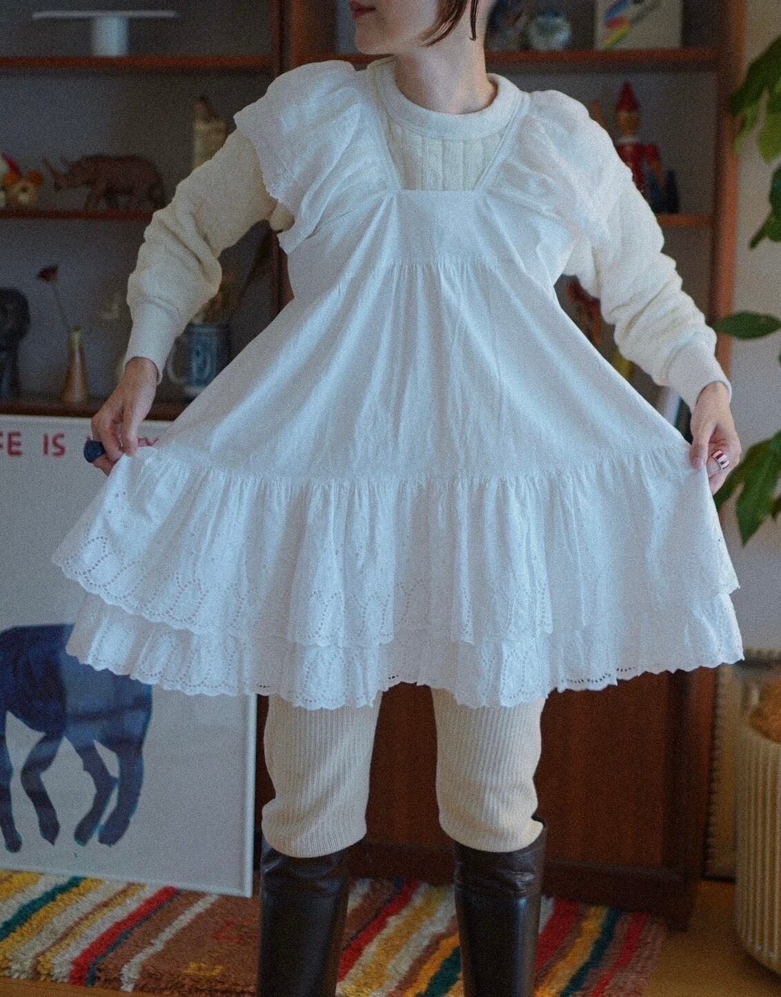 裾のふんわり重なる2枚仕立てのティアードデザインと裾のカットワーク刺繍がチャームポイント。動くたびに柔らかく広がるシルエットが、愛おしいです。胸元にはゴムが入っていないため、リラックス感のあるナチュラルな着心地に。スカートとしても着られるデザインなので、スタイリングの幅も広がります。-cutwork embroidery tiered french antique cotton dress – lace strap remake