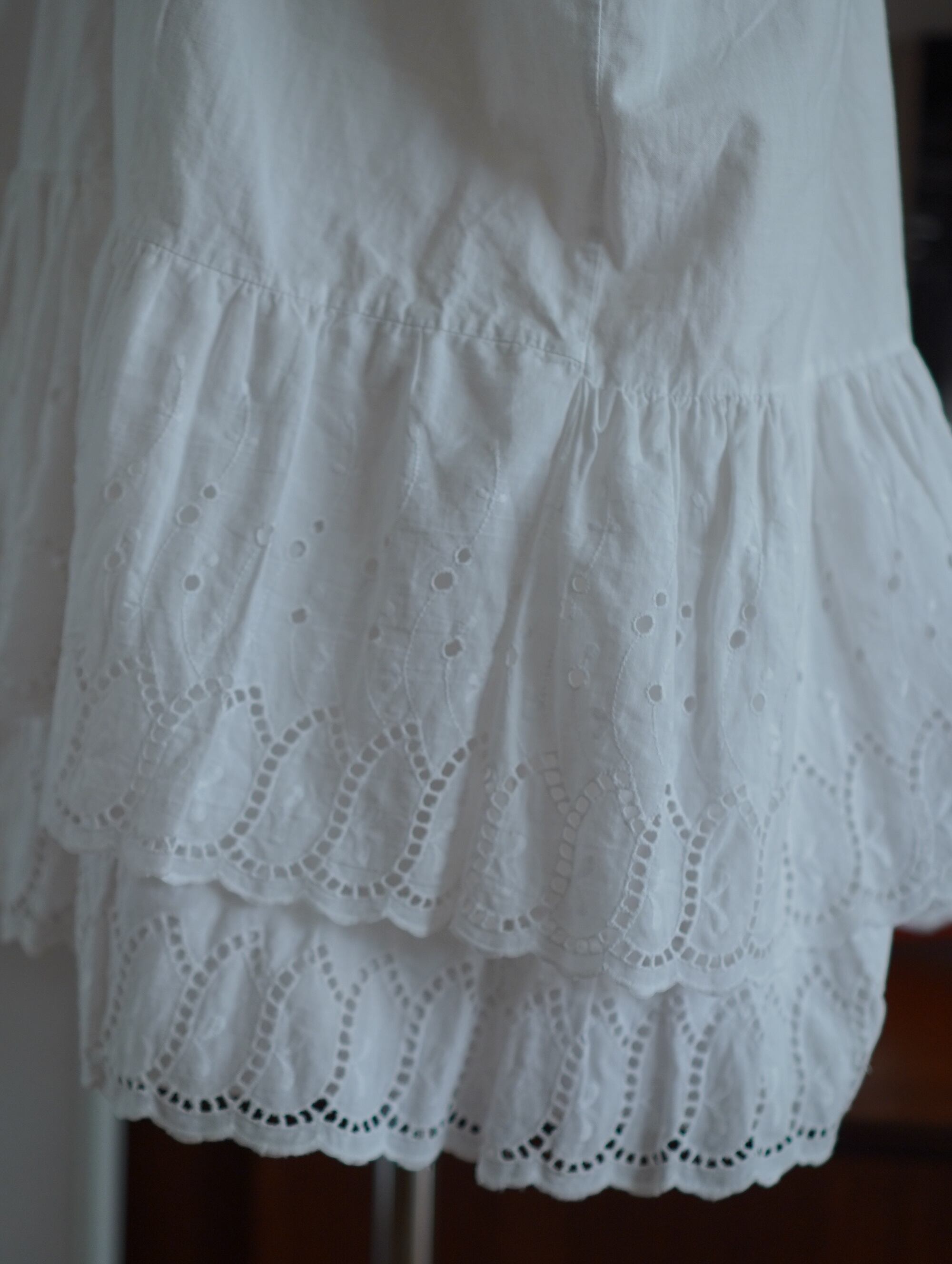 cutwork embroidery tiered french antique cotton dress – lace strap remake