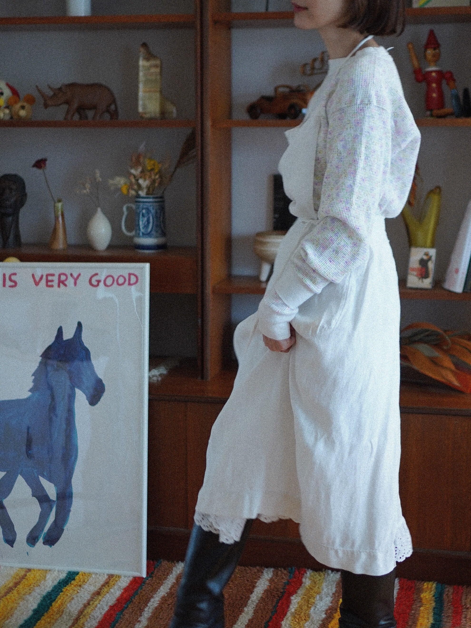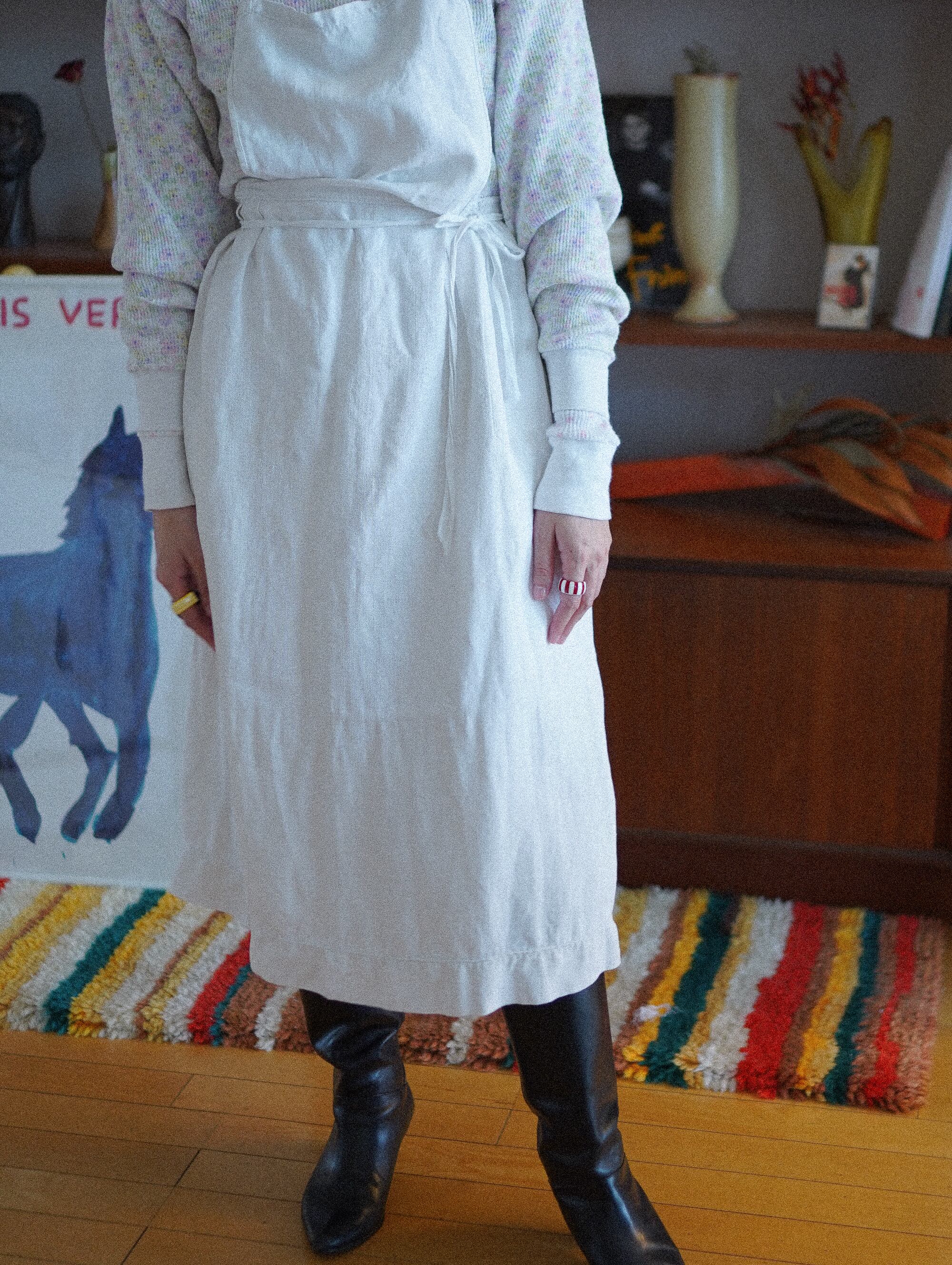100年以上の時を重ねたであろう、アンティークリネンのエプロンスカート。胸元のさりげないジグザグステッチや、ポケット端のレース装飾、ウエスト裏の赤いイニシャル"F,Y"の手刺繍。どこを切り取っても美しく、きゅんとときめくディテールが散りばめられています。裾には手縫いで施された波状の刺繍も。元はキッチンで纏われていた一着かもしれませんが、whoopiでは贅沢なスカートとしてご提案したい一枚。経年によって生まれたリネン特有の“くったり感”がたまらなく魅力的です。-antique linen apron skirt