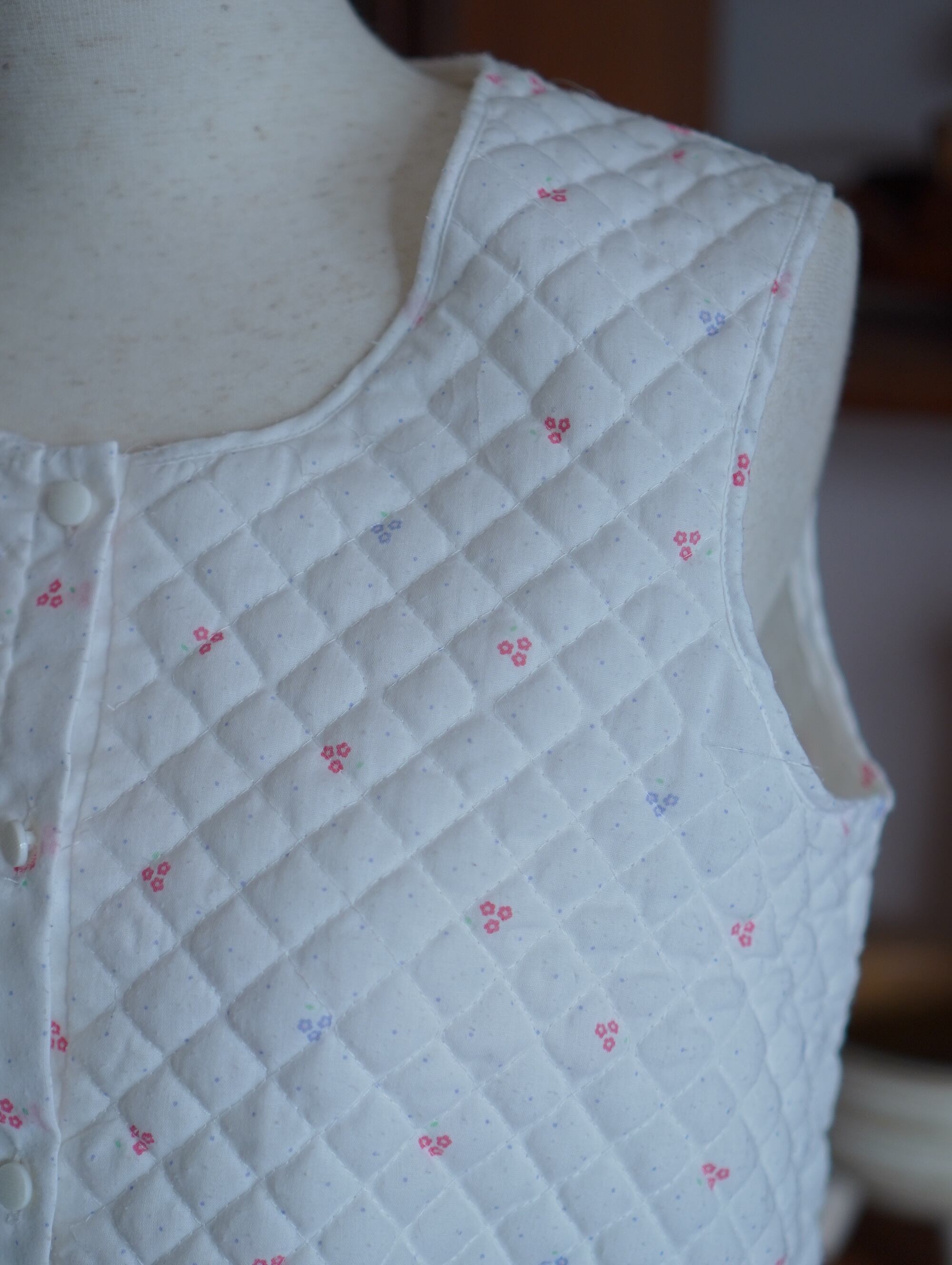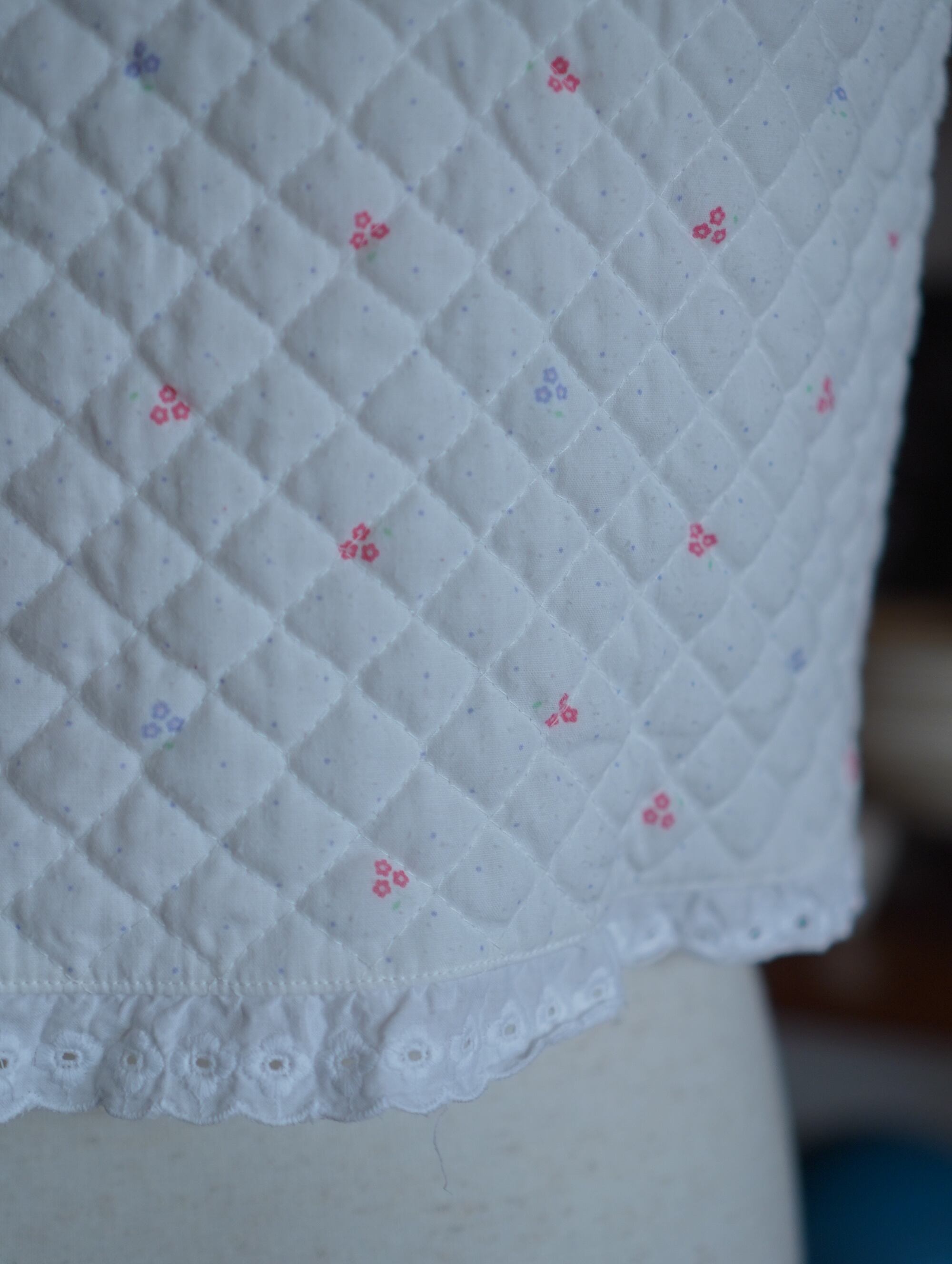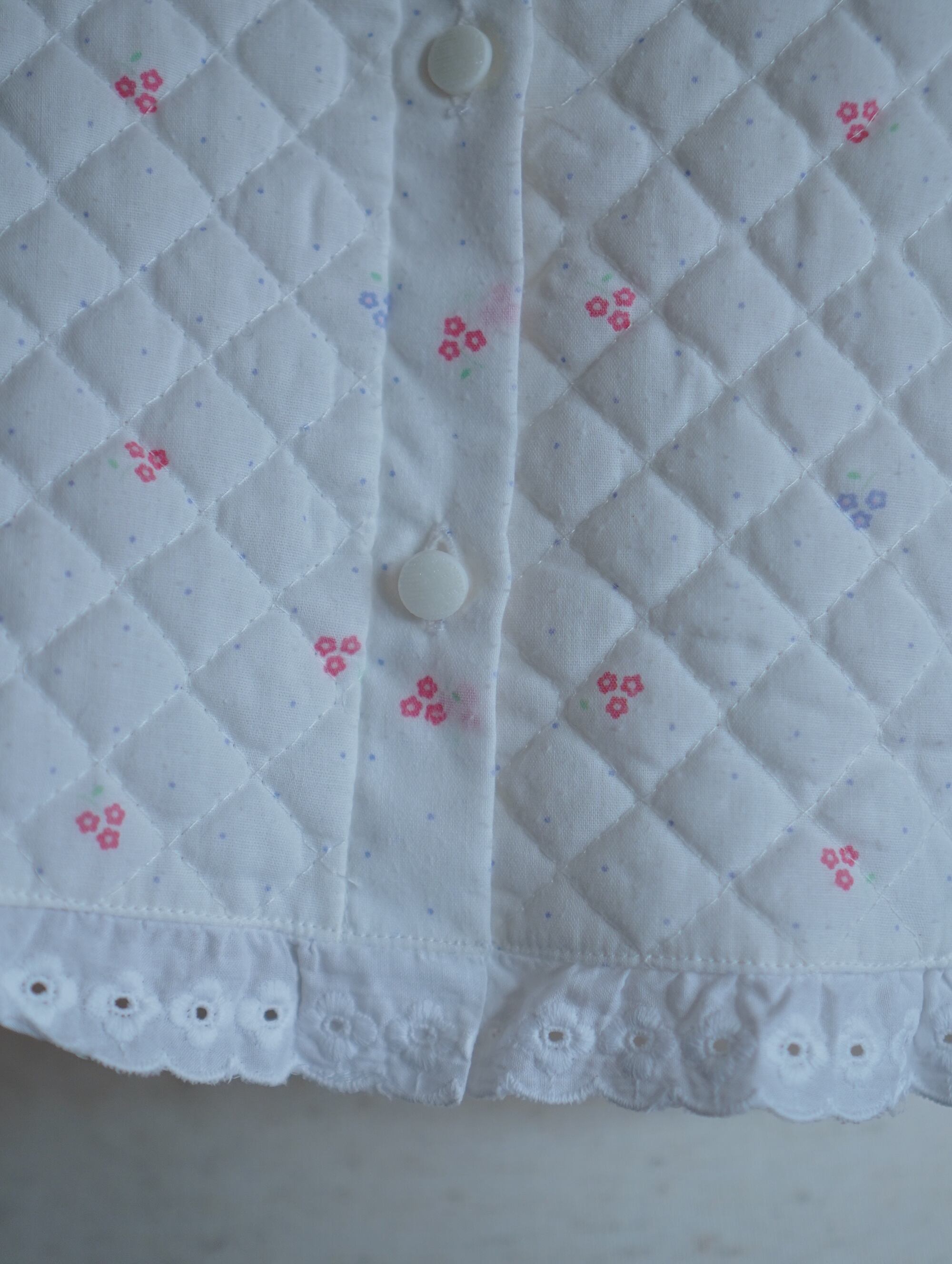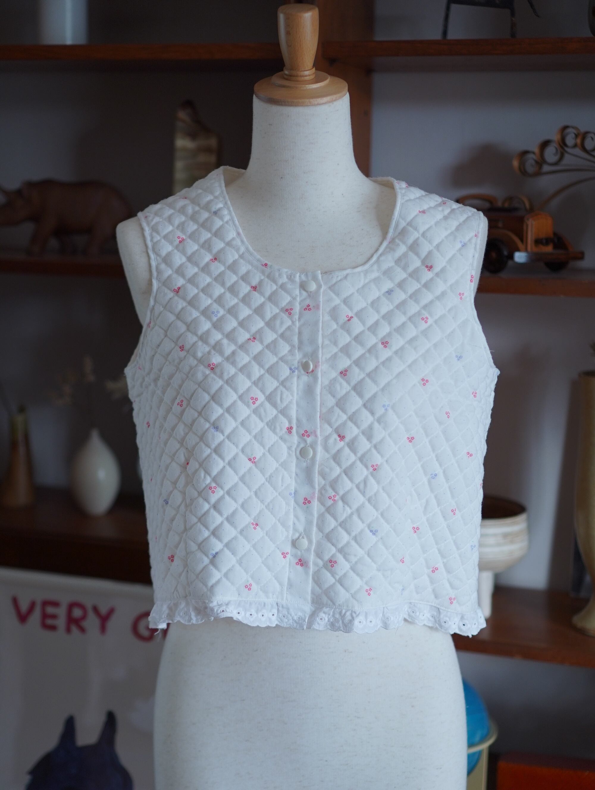 ぽこぽこと優しくキルティングされた、70s~80s頃のランジェリーベスト。小さな小花模様がチャームポイント。つるっとしたスナップボタンもキュートです。古いものならではの柔らかさと、少し儚げな雰囲気がとても愛おしい一枚。おうち時間にも、おでかけのレイヤードにも。ふわっと包まれるような着心地で、心まであたたまります。-70s~80s fleur quilted vest