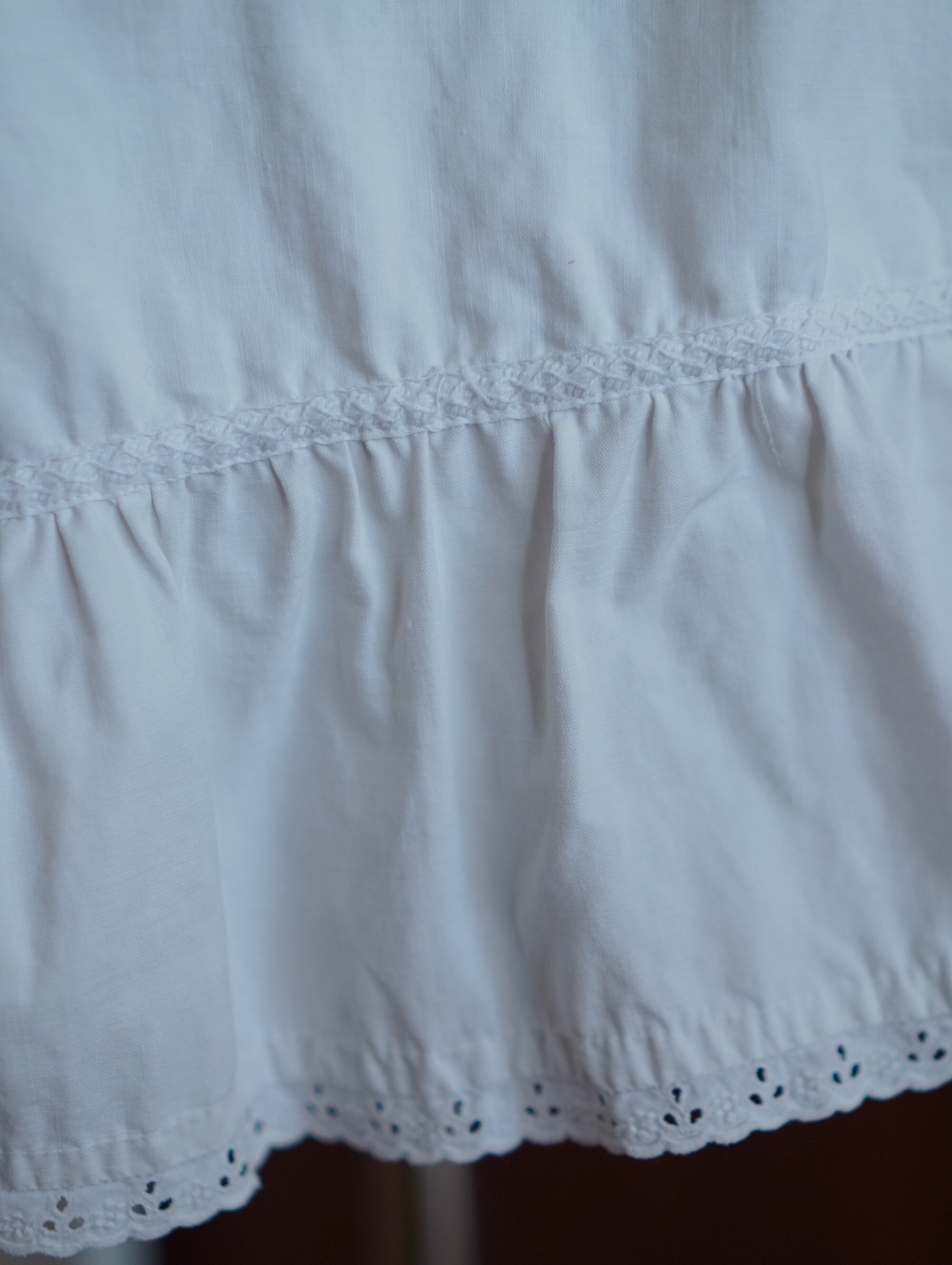 まるでペチコートのような、ふわりと広がるドロワーズ。19世紀末〜20世紀初頭のフランスで仕立てられた、当時のままのドロワーズ。裾に重ねられたギャザーフリル、細やかなピンタック、そしてウエストに入った“AS”の赤いクロスステッチがキュンポイント。軽やかで張りのあるコットンです。-antique cotton drawers with red monogram