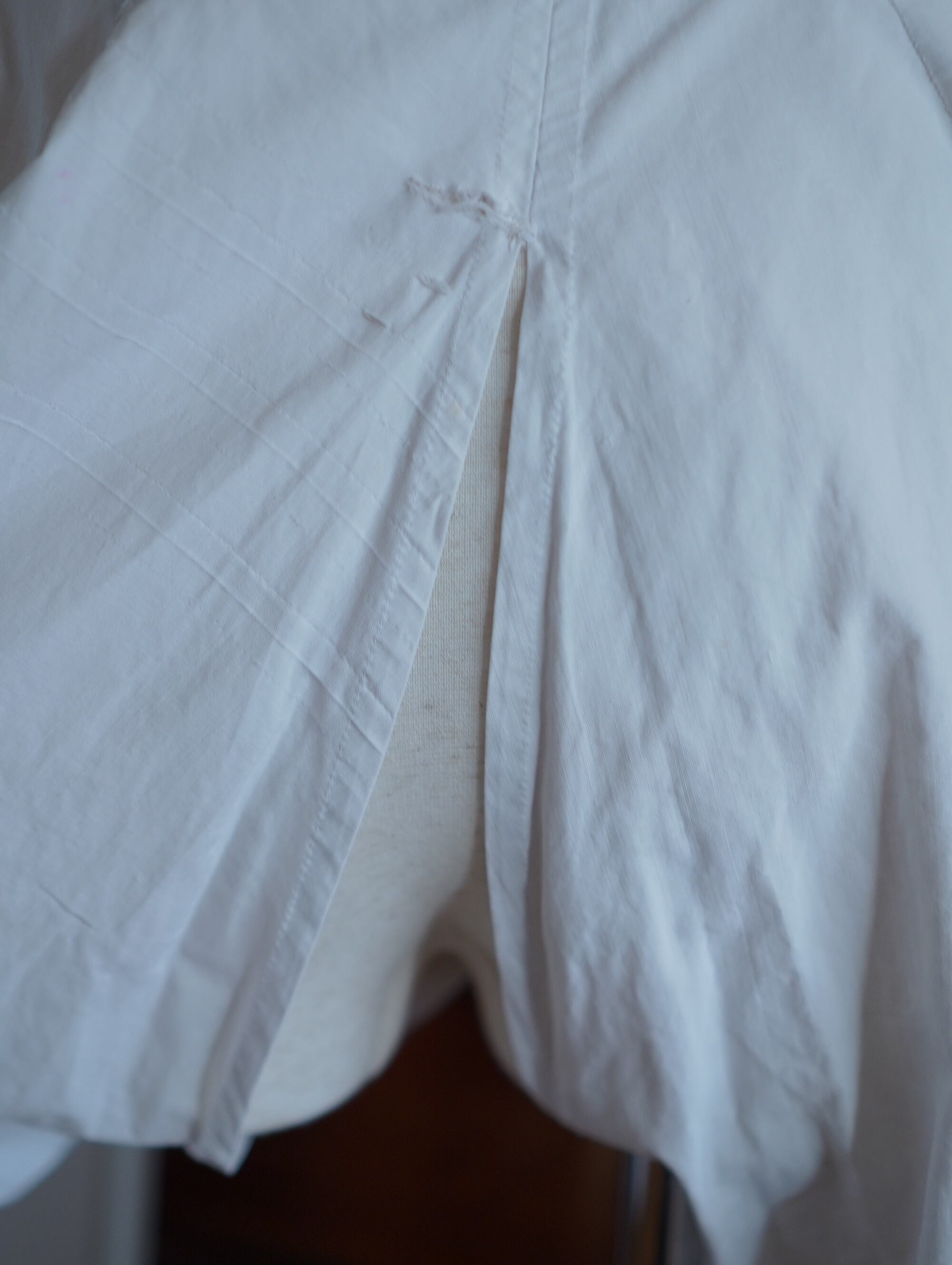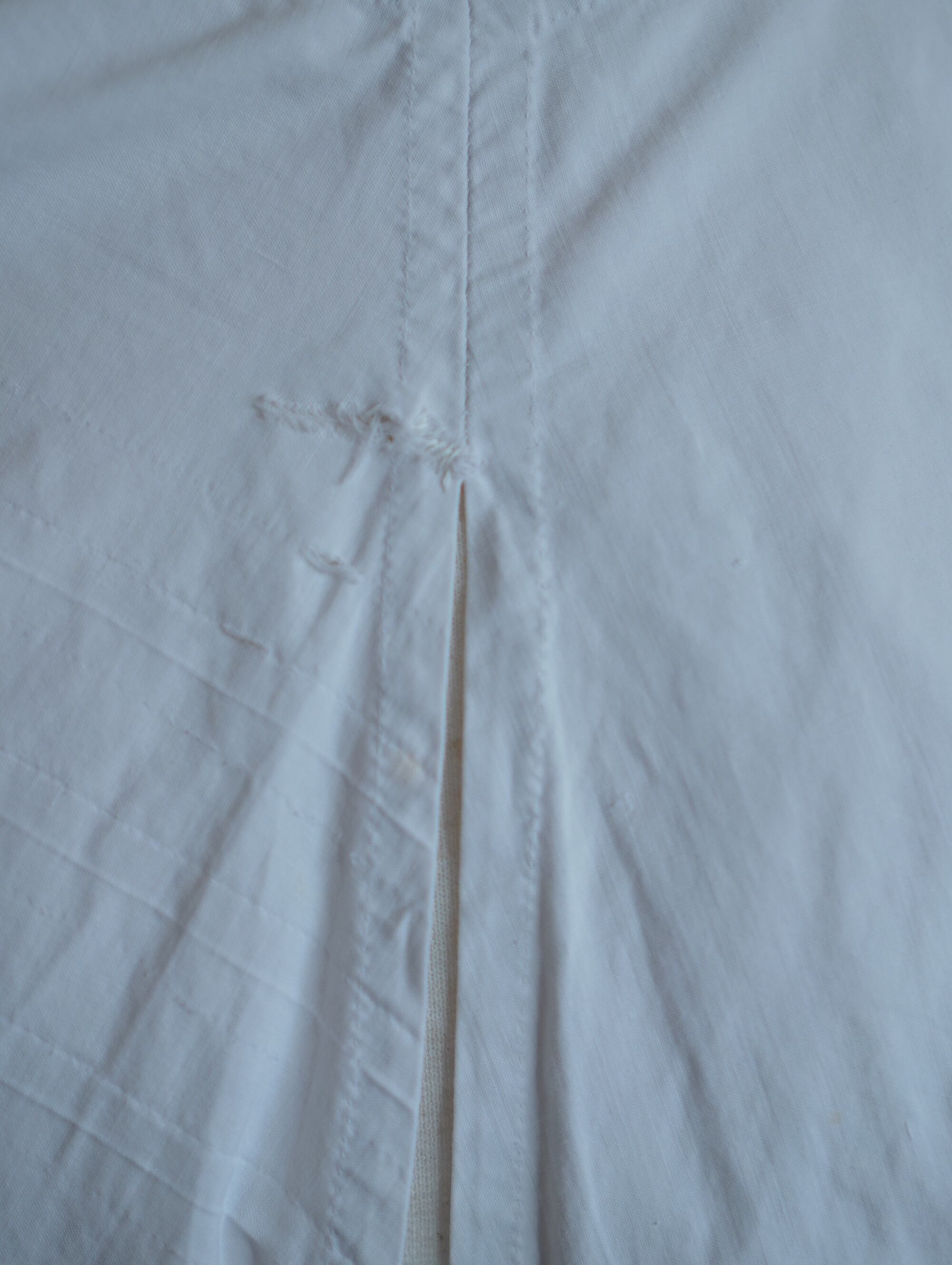 後ろ側の縫い目に破れとほつれが見られます(17∼18枚目にてご確認いただけます。)。裾に錆が一か所ございます(19枚目にてご確認いただけます。)着用には支障ありませんが、アンティークらしい風合いと物語を感じられるディテールとしてお楽しみいただける方におすすめいたします。