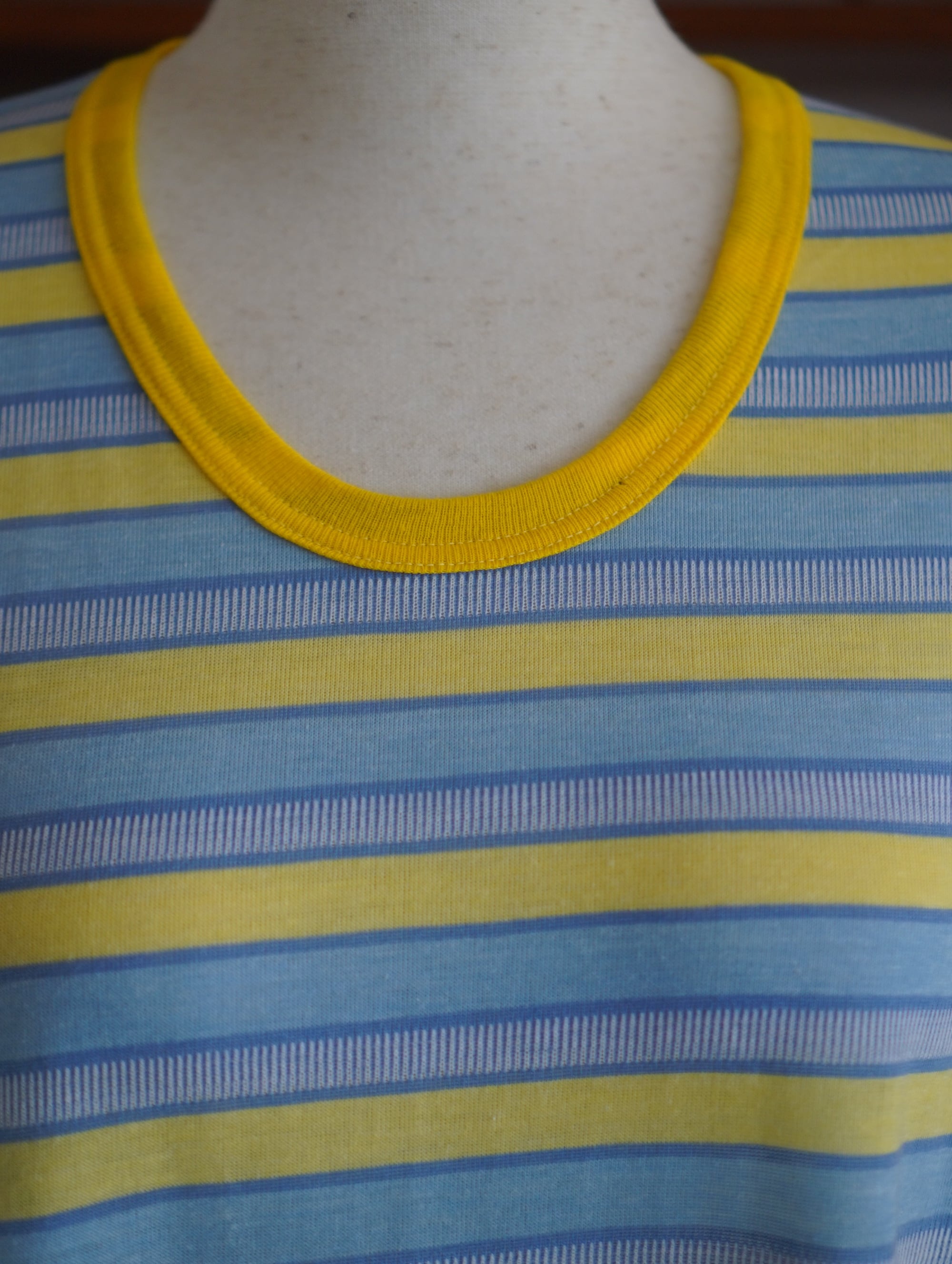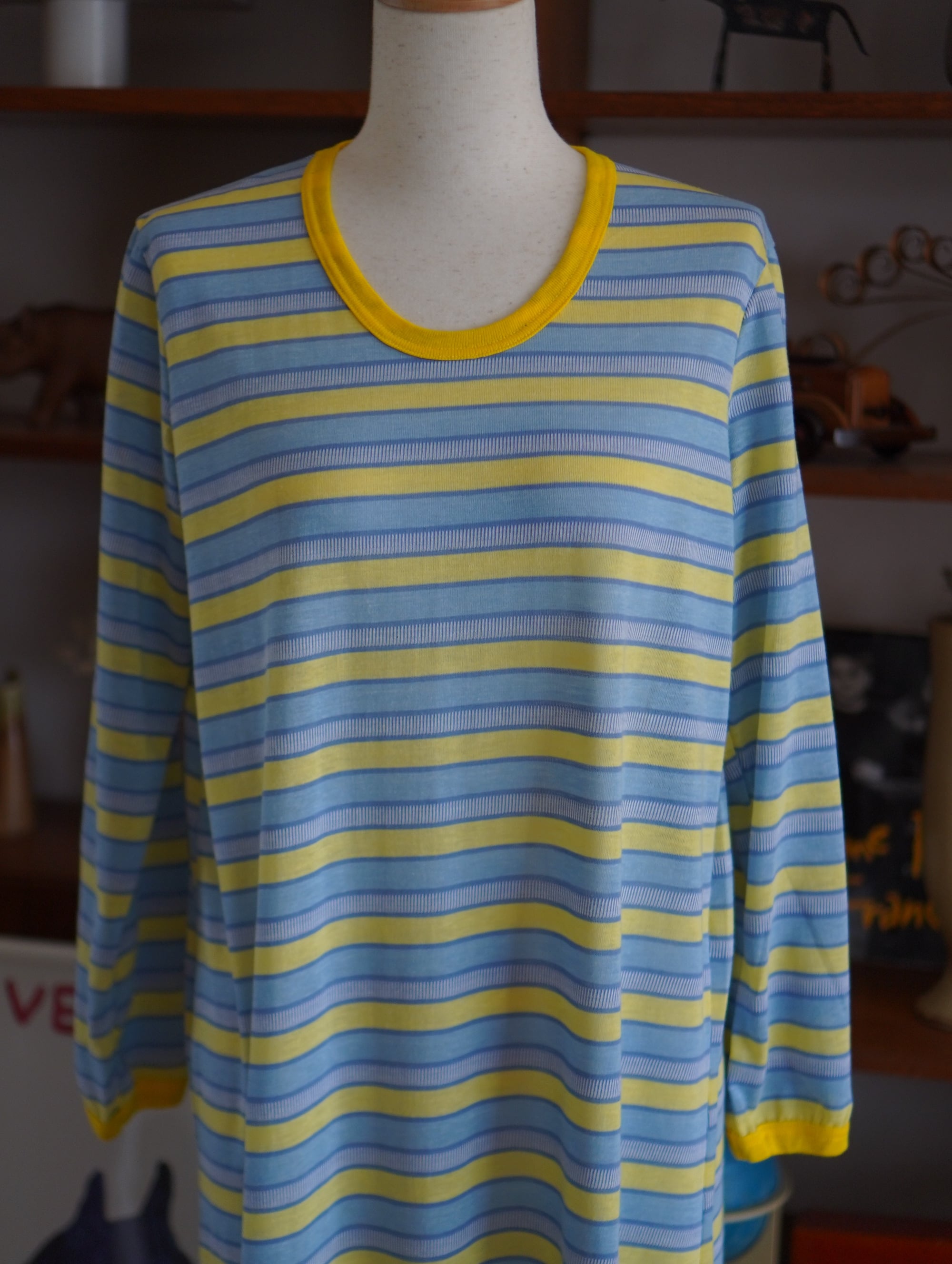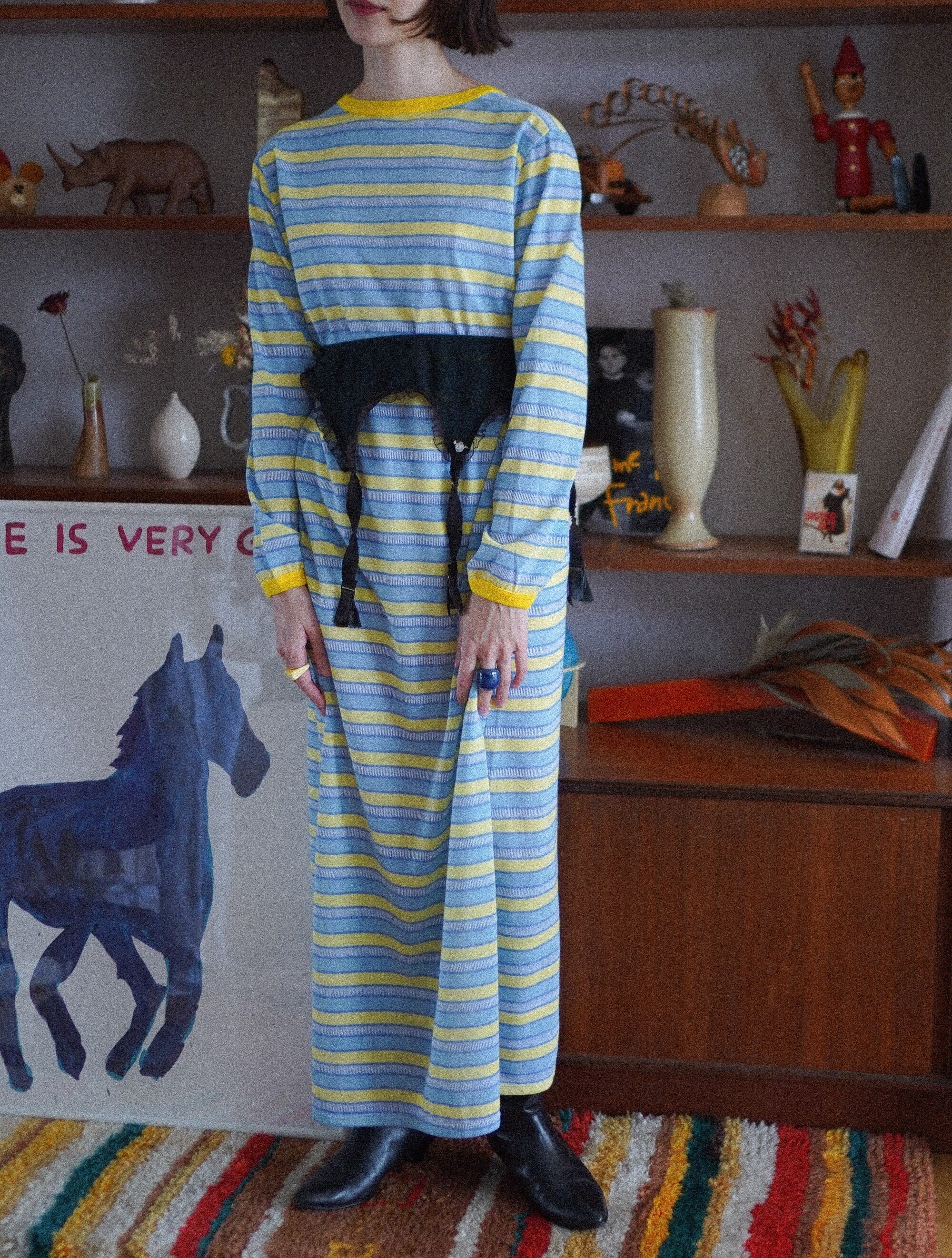 パステルカラーのイエローと空色のストライプに、きゅっと引き締まるレモンイエローの襟元と袖口がチャームポイントのヴィンテージのルームドレス。元気が出るカラーリングにきゅんとします。タグは読み取れない状態ですが、縫製や生地の雰囲気から80's頃のヨーロッパ製かと思われます。さらりとした肌触りのコットン素材で、リラックス感のある着心地が魅力です。太陽に当たるとほんのり透け感があり、軽やかさも演出してくれます。ファーベストと重ねたりしても楽しそうです。-vintage striped night dress