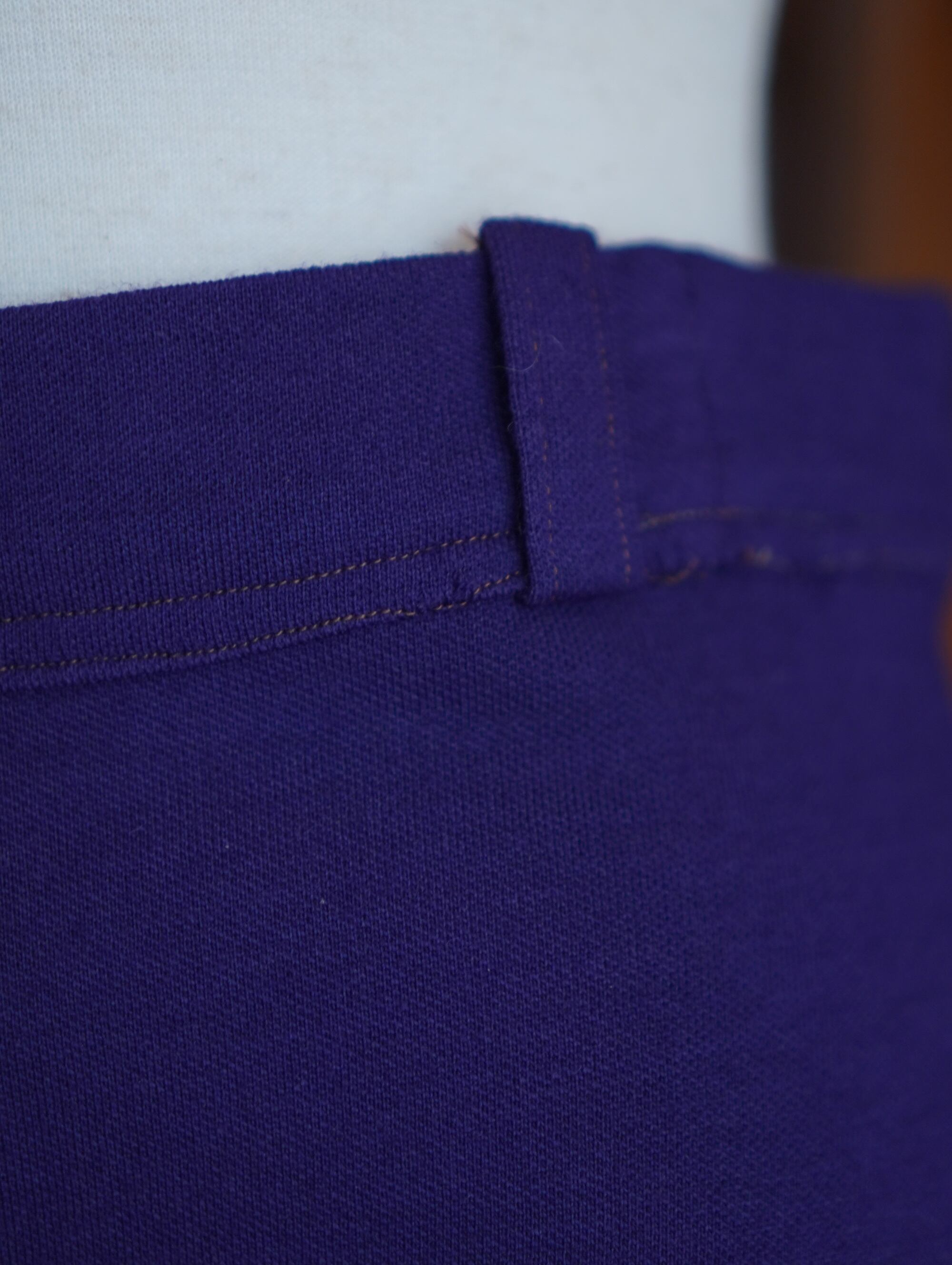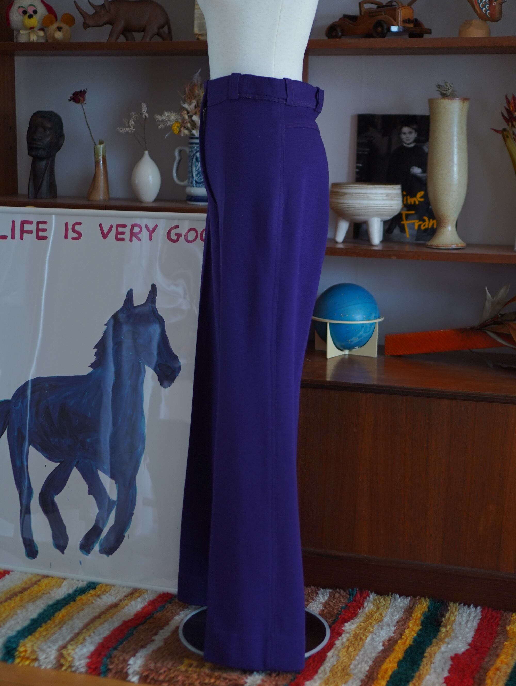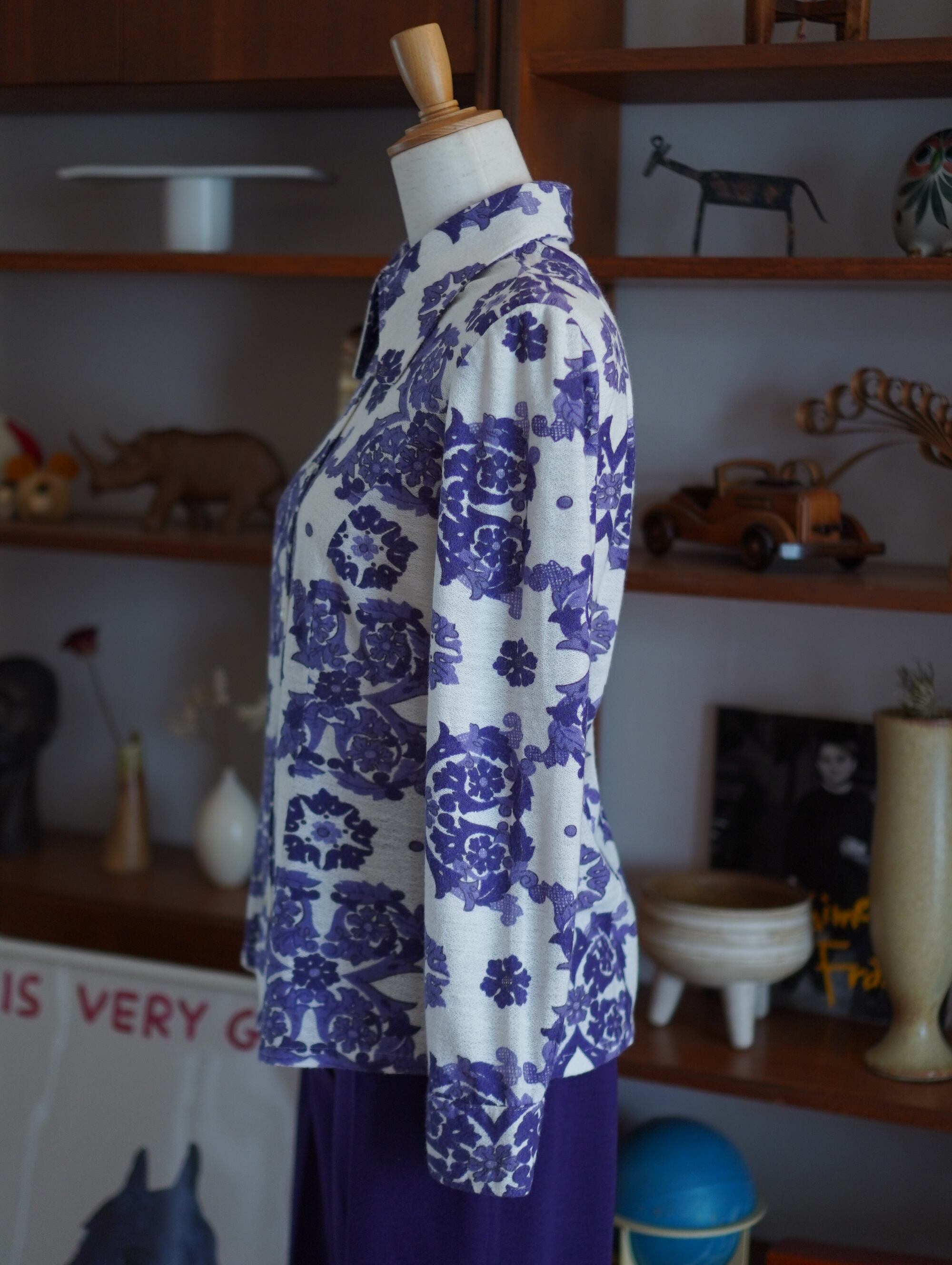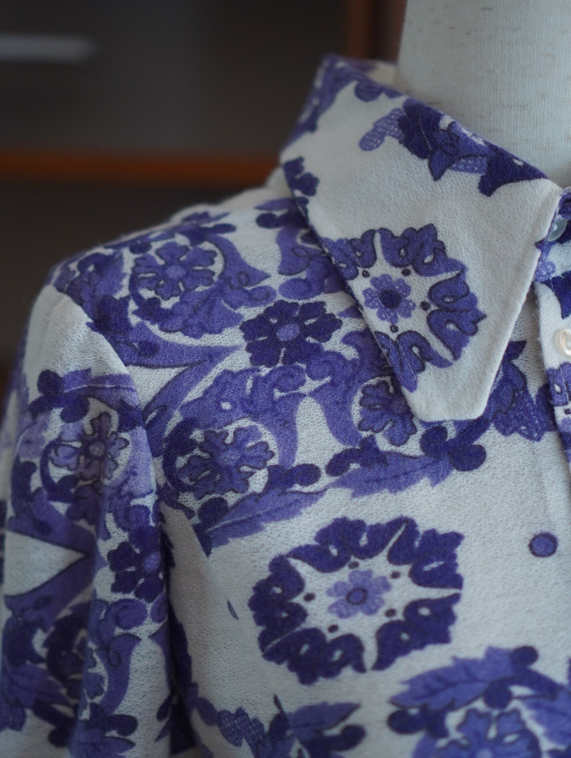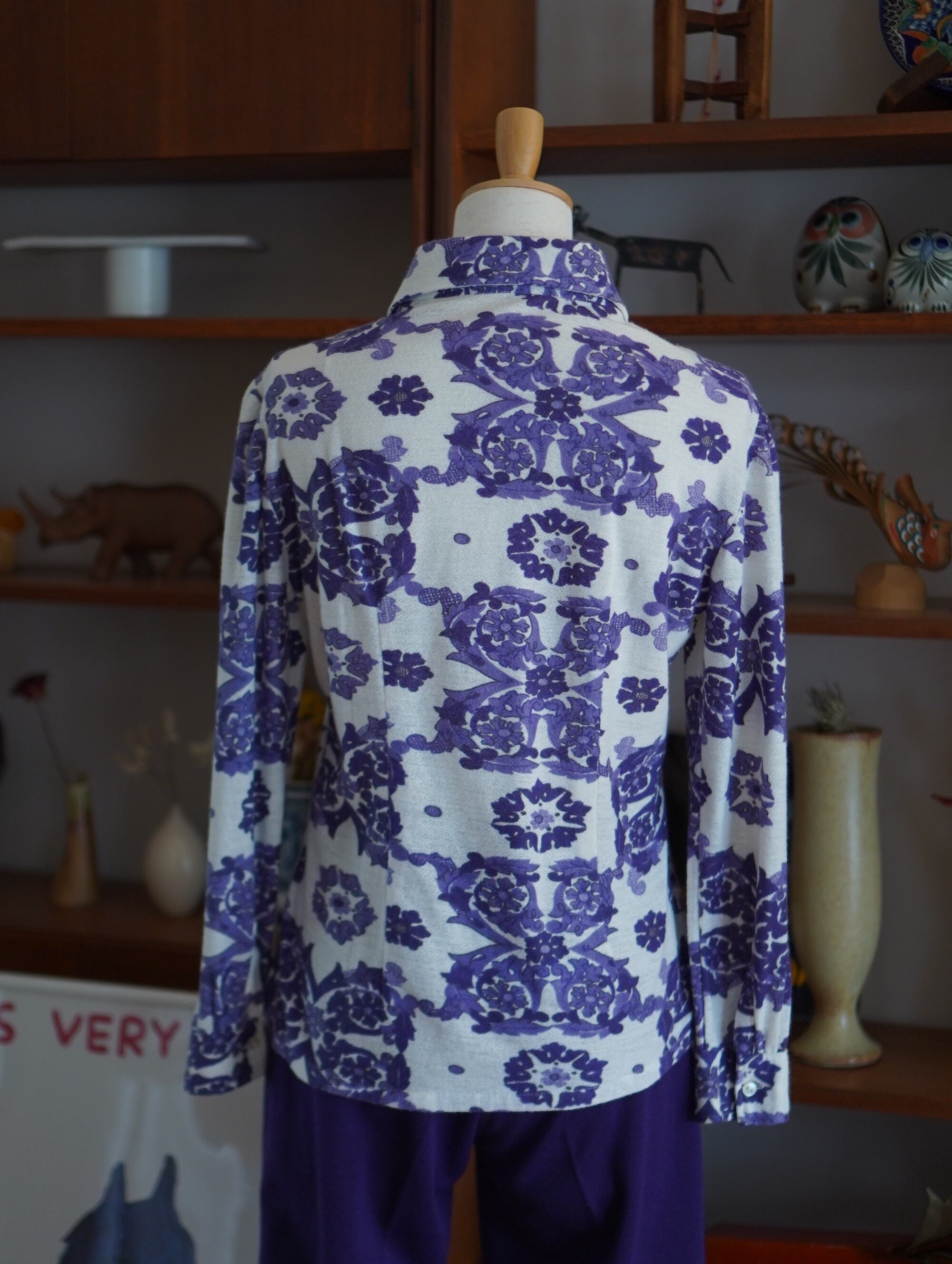 60〜70年代頃に仕立てられたと思われる一点もののヴィンテージのハンドメイドセットアップ。上下共にこだわりの詰まったつくりが魅力です。トップスは大ぶりなフラワーモチーフが大胆に描かれた、存在感抜群の総柄デザイン。少しざらりとした風合いの柔らかい生地に、立体感のある紫の花模様が浮かび上がるように染められています。ボトムスはハイウエスト&フレアシルエットがとても美しく、脚を長く見せてくれる魔法のような一本。フロントジップやボタンまわり、裏側の丁寧な始末まで、ハンドメイドならではの美しさが感じられます。セットアップで着るのはもちろん、それぞれ別でも着回しきくので、たっぷり楽しめる一着。-vintage handmade set