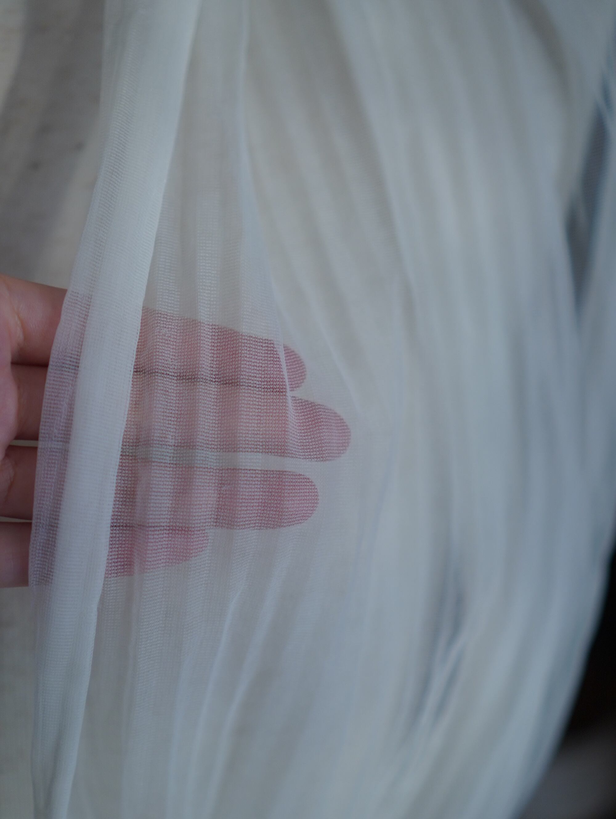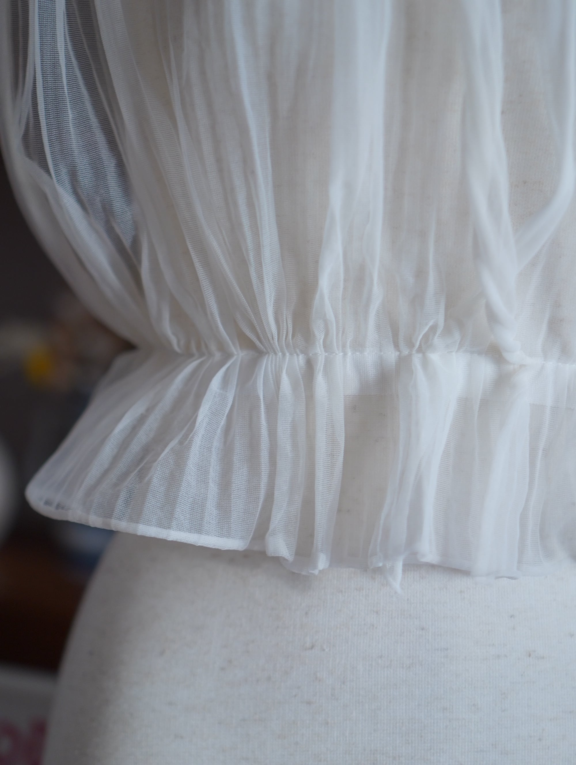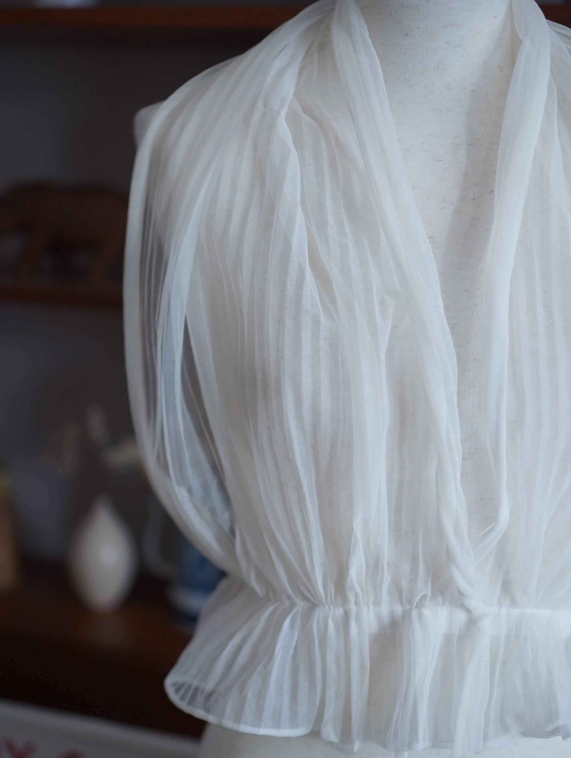 ふわっと軽いチュール素材のヴィンテージトップス。やさしく透ける質感と、くしゅっと寄せられたギャザーがどこかバレリーナのような、キュートな雰囲気です。後ろはリボンで軽く結ぶタイプなので、インナーにキャミソールを合わせてさらっと羽織ったり、ワンピースの上から重ねても◎ふだんのスタイリングにちょっとロマンチックな空気を添えてくれる一枚。カジュアルなスウェットやカットソーに重ねても楽しそうです。/vintage tulle tie-back top