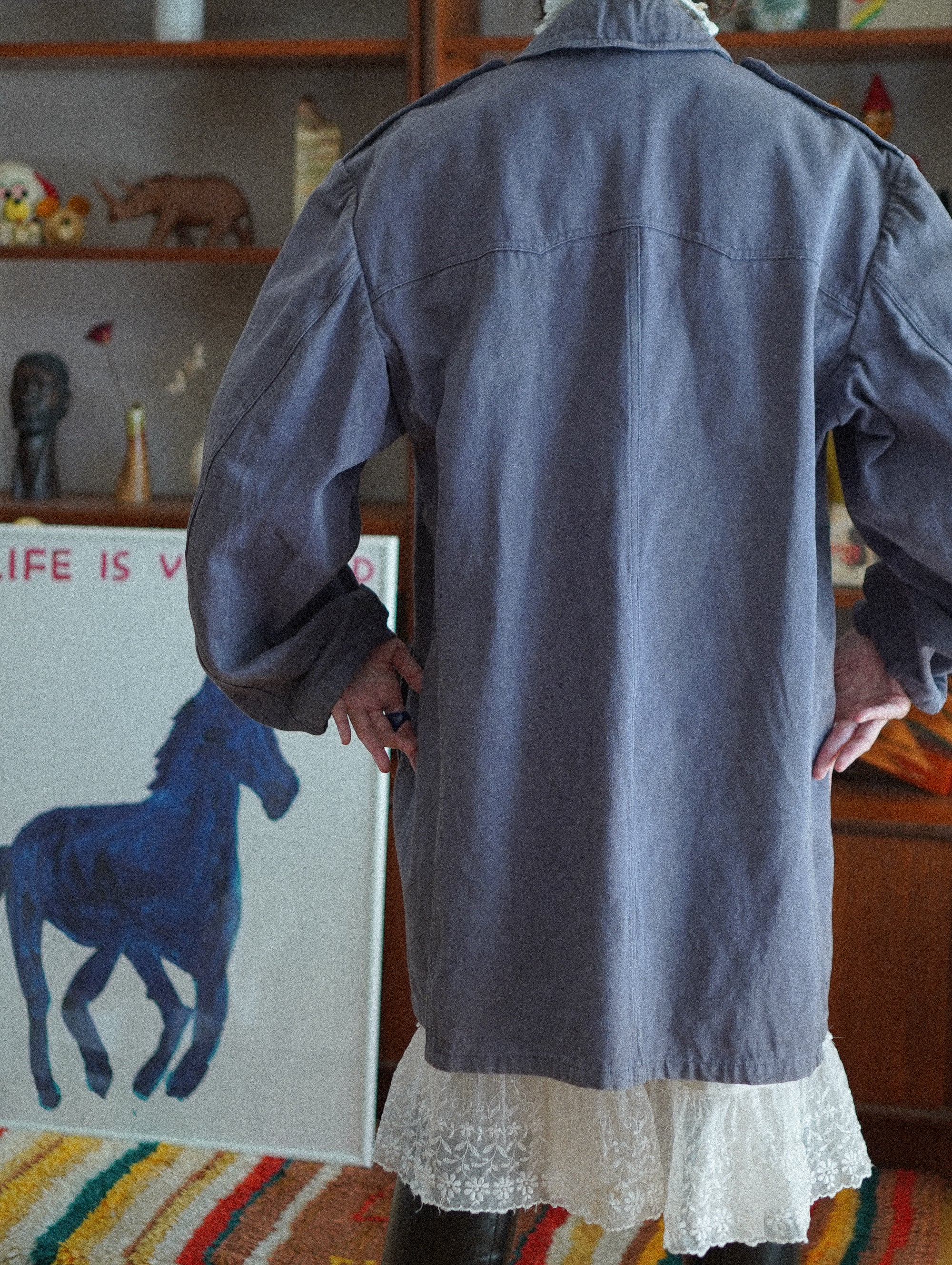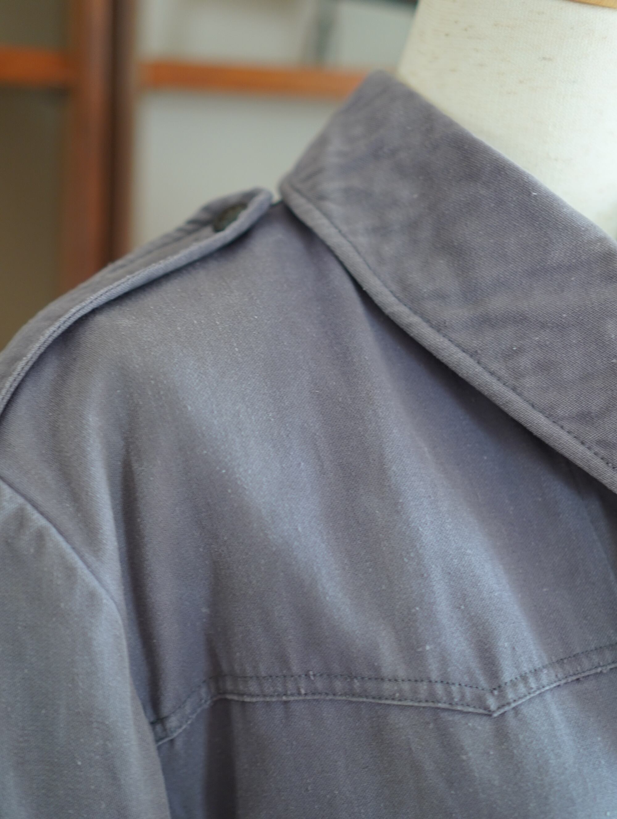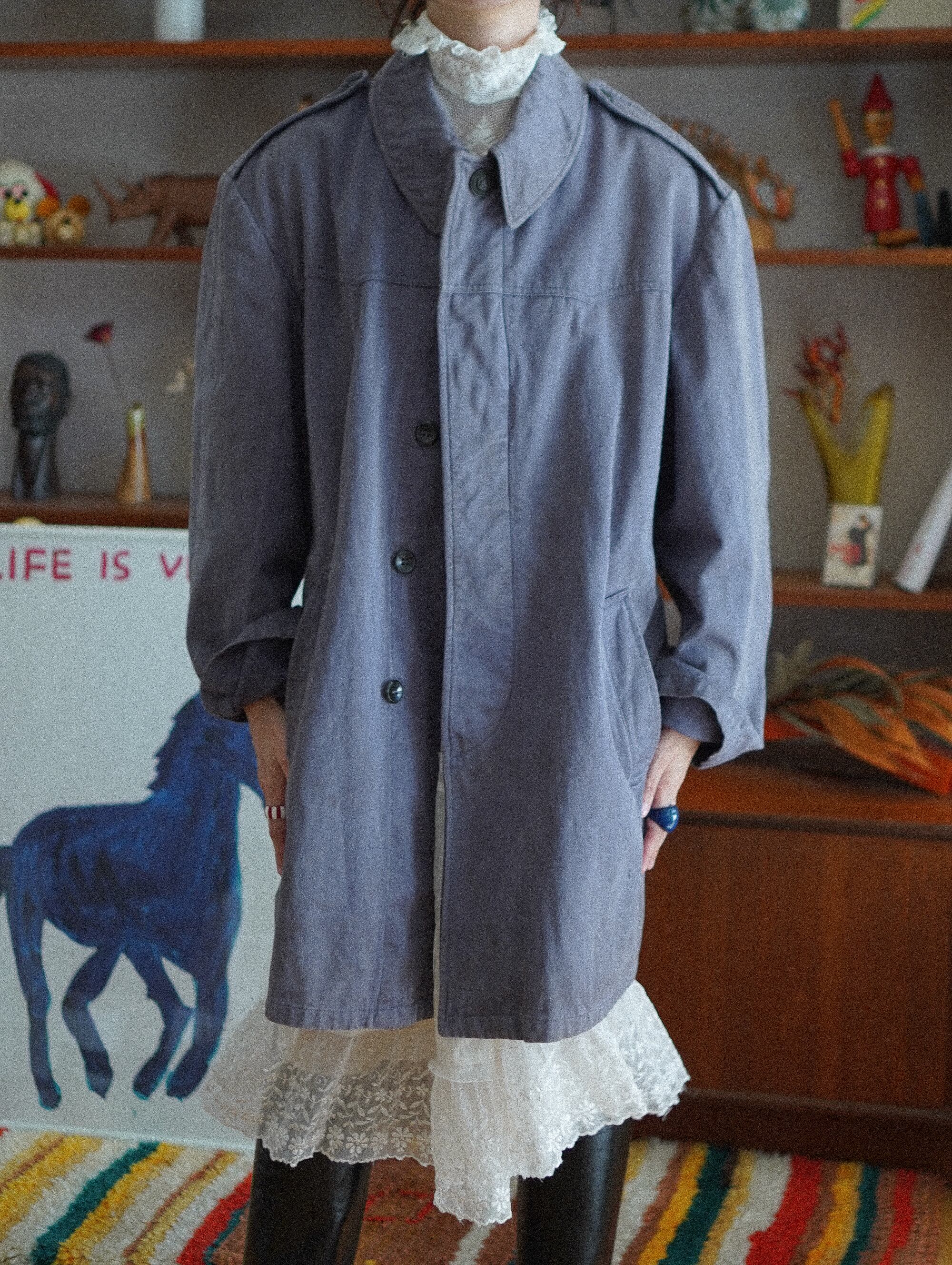ハンガリー軍で実際に使用されていた、1972年製のベルト付きミリタリーコート。青みがかったチャコールグレーのような絶妙な色味と、厚手でしっかりと包んでくれるようなコットンの風合いが魅力的です。襟元のメタルボタンにはハンガリー人民共和国の国章が刻まれており、当時の背景を物語るディテールに胸が高鳴ります。ウエストをキュッと締めてワンピース風に着るのもおすすめですし、前を開けてラフに羽織るだけでも、シルエットが綺麗なのでさまになります。古着ならではのエッセンスと、モードな空気をあわせ持った一着です。/hungarian military belted jacket –1970s
