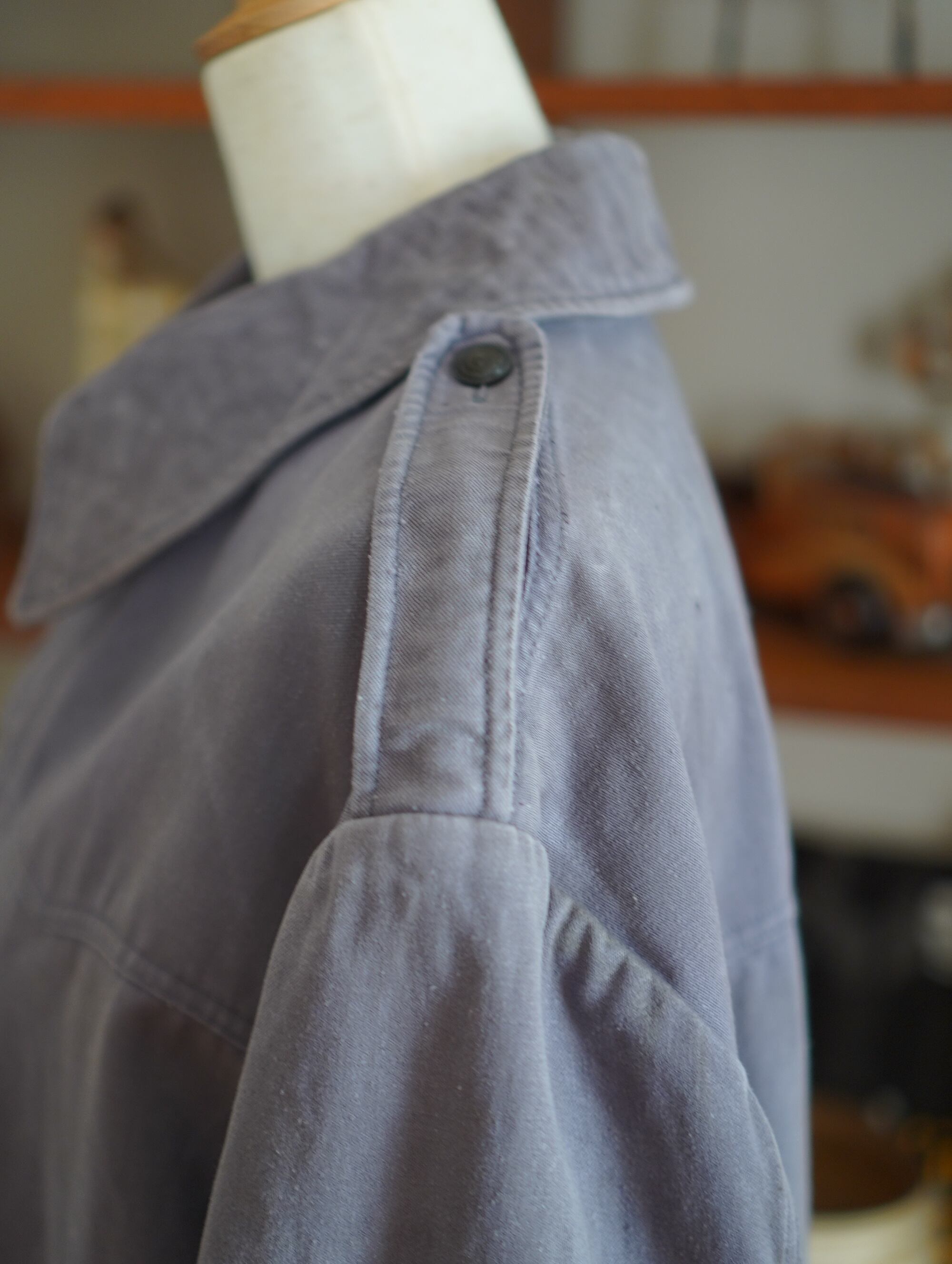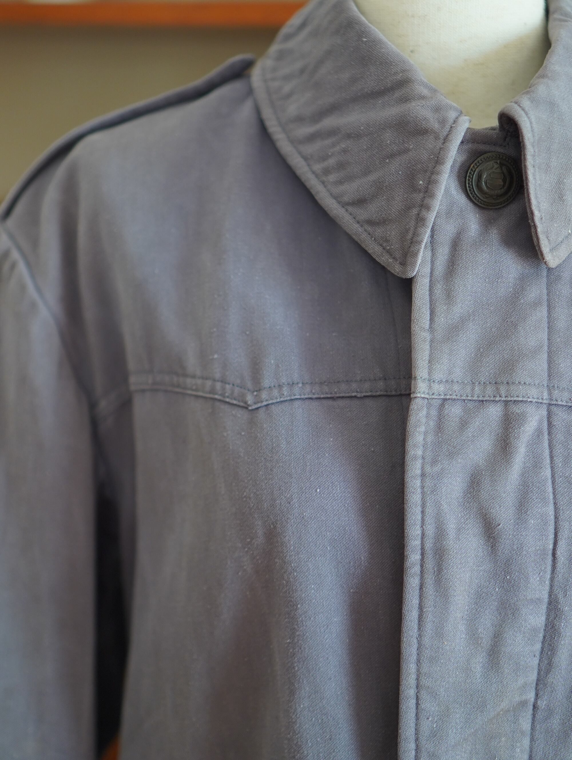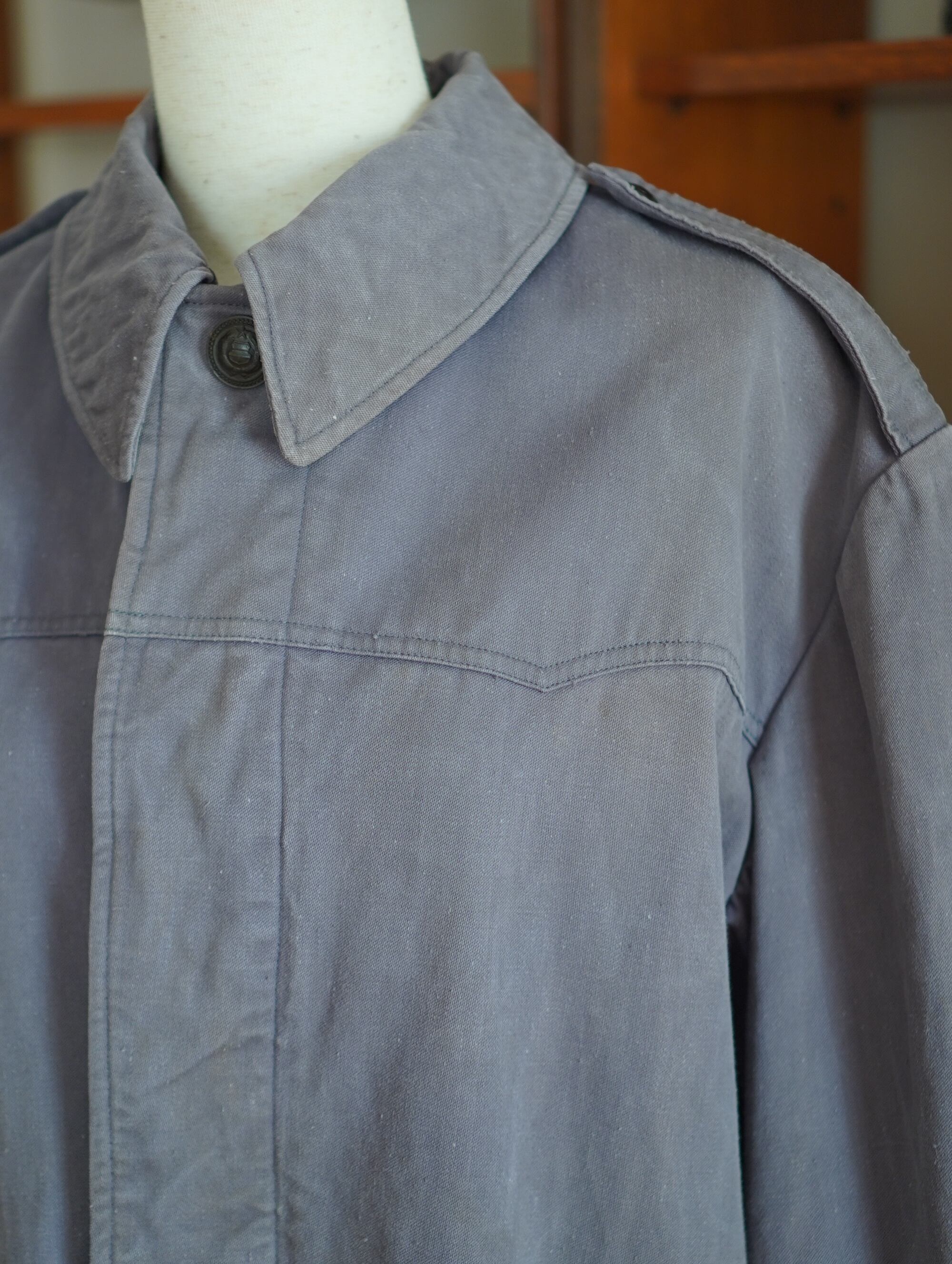 ハンガリー軍で実際に使用されていた、1972年製のベルト付きミリタリーコート。青みがかったチャコールグレーのような絶妙な色味と、厚手でしっかりと包んでくれるようなコットンの風合いが魅力的です。襟元のメタルボタンにはハンガリー人民共和国の国章が刻まれており、当時の背景を物語るディテールに胸が高鳴ります。ウエストをキュッと締めてワンピース風に着るのもおすすめですし、前を開けてラフに羽織るだけでも、シルエットが綺麗なのでさまになります。古着ならではのエッセンスと、モードな空気をあわせ持った一着です。/hungarian military belted jacket –1970s