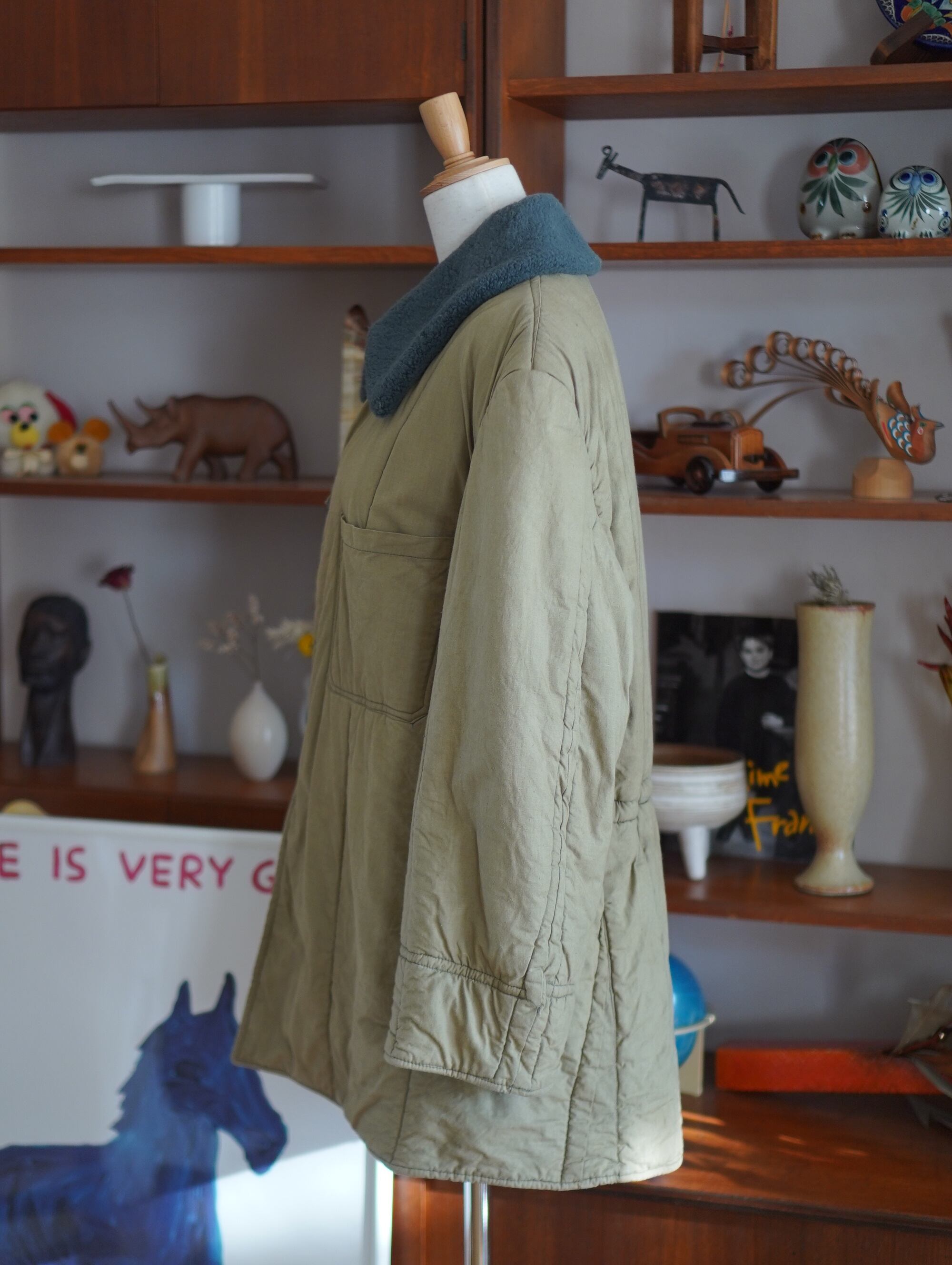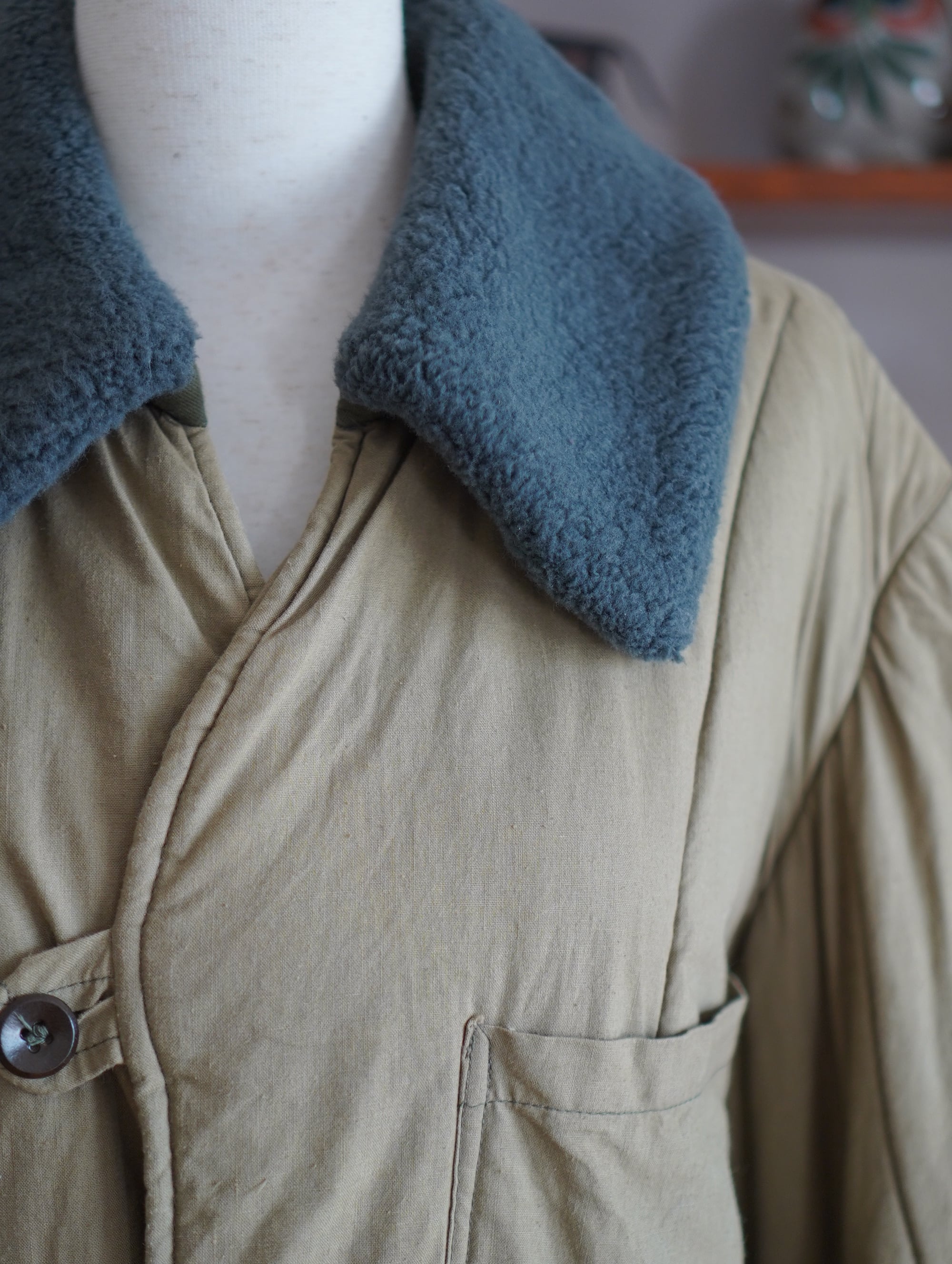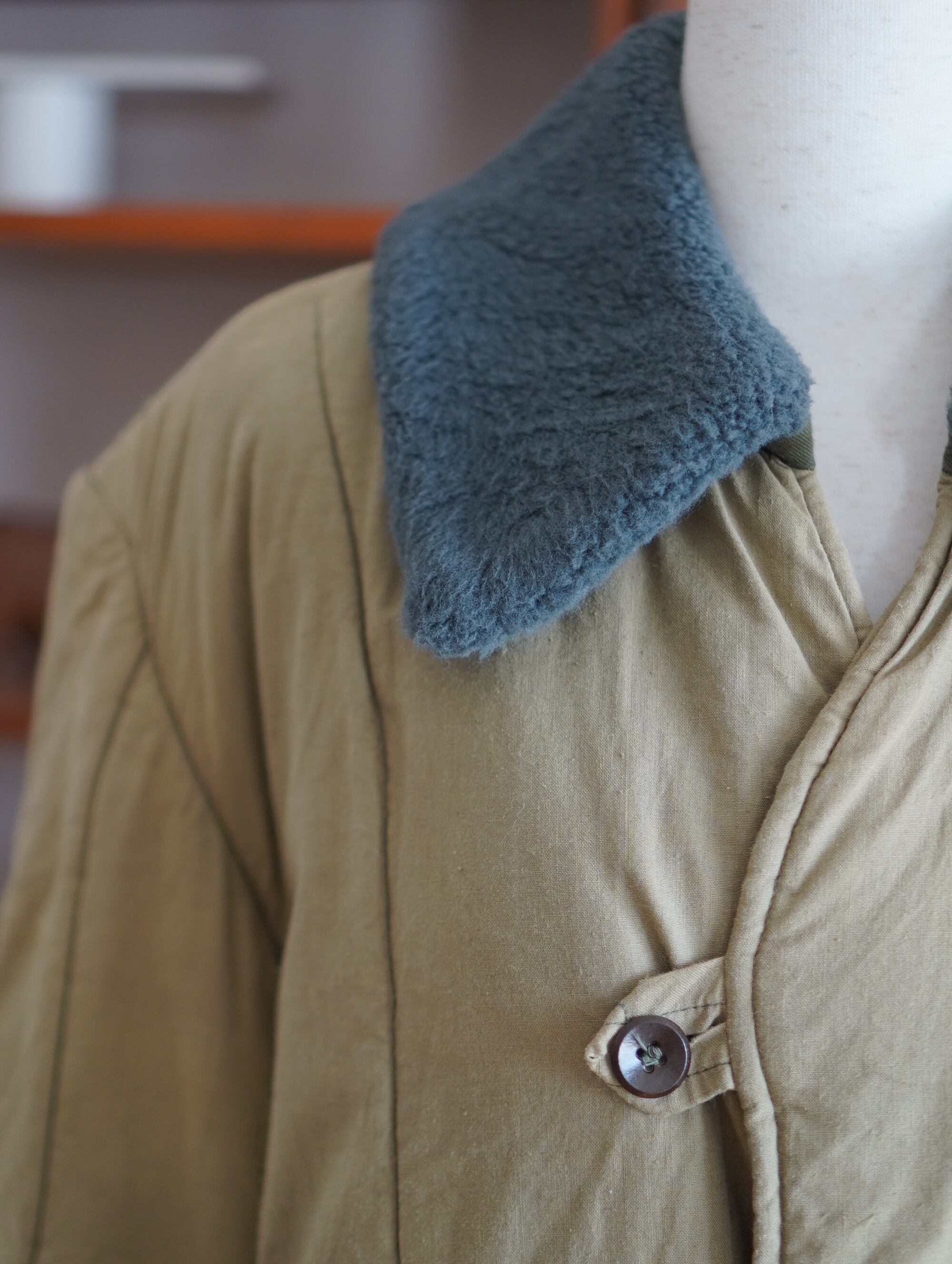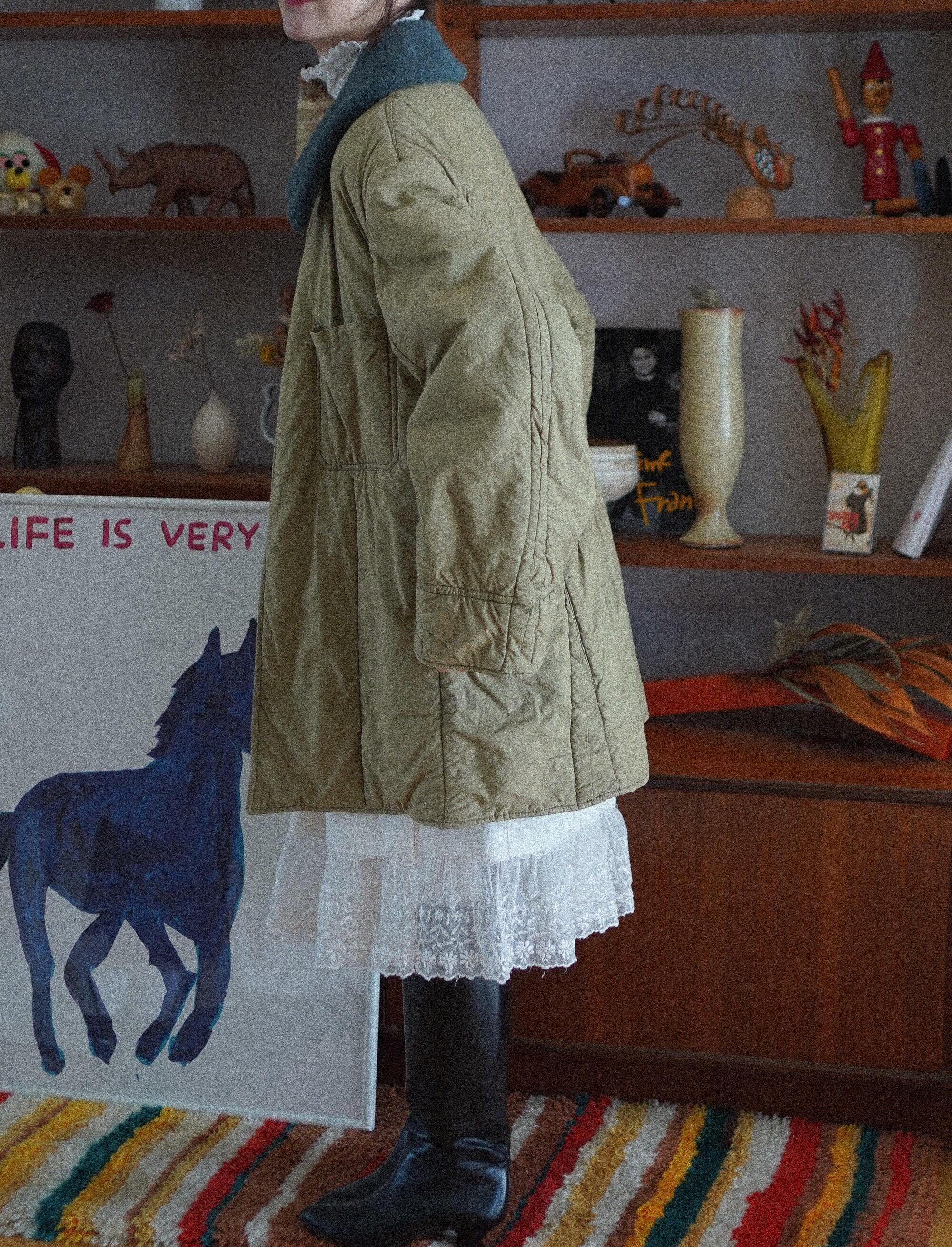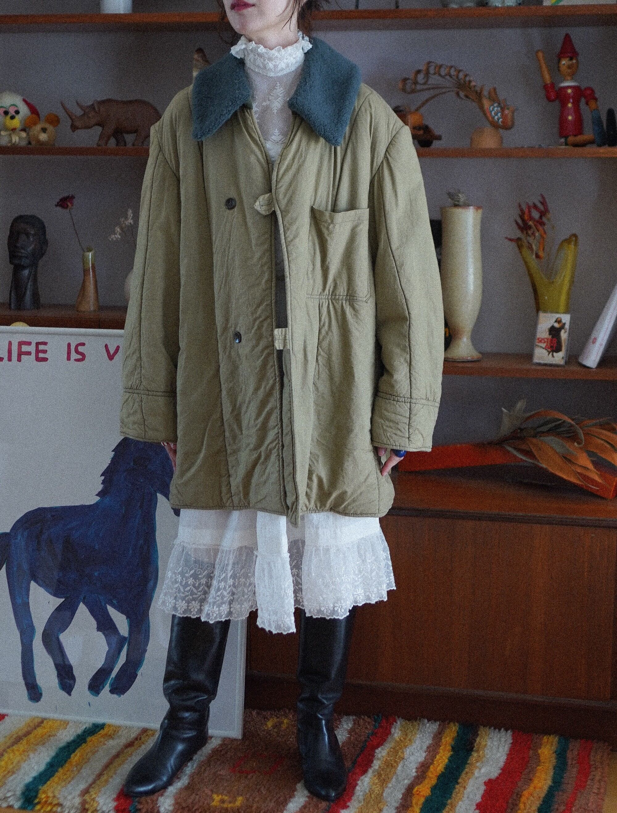 全体的に少し色褪せたカーキのボディと、青みがかったモコモコの襟のコントラストが絶妙。フロントは大きめのボタンが2つだけ付いており、そのシンプルさがこの一枚の無骨な美しさを惹きたてています。ウエストの内側にはドローコード付きでぎゅっと絞ってシルエットを変えても、そのままストンと羽織っても◎、儚いレースとの相性も良いです。