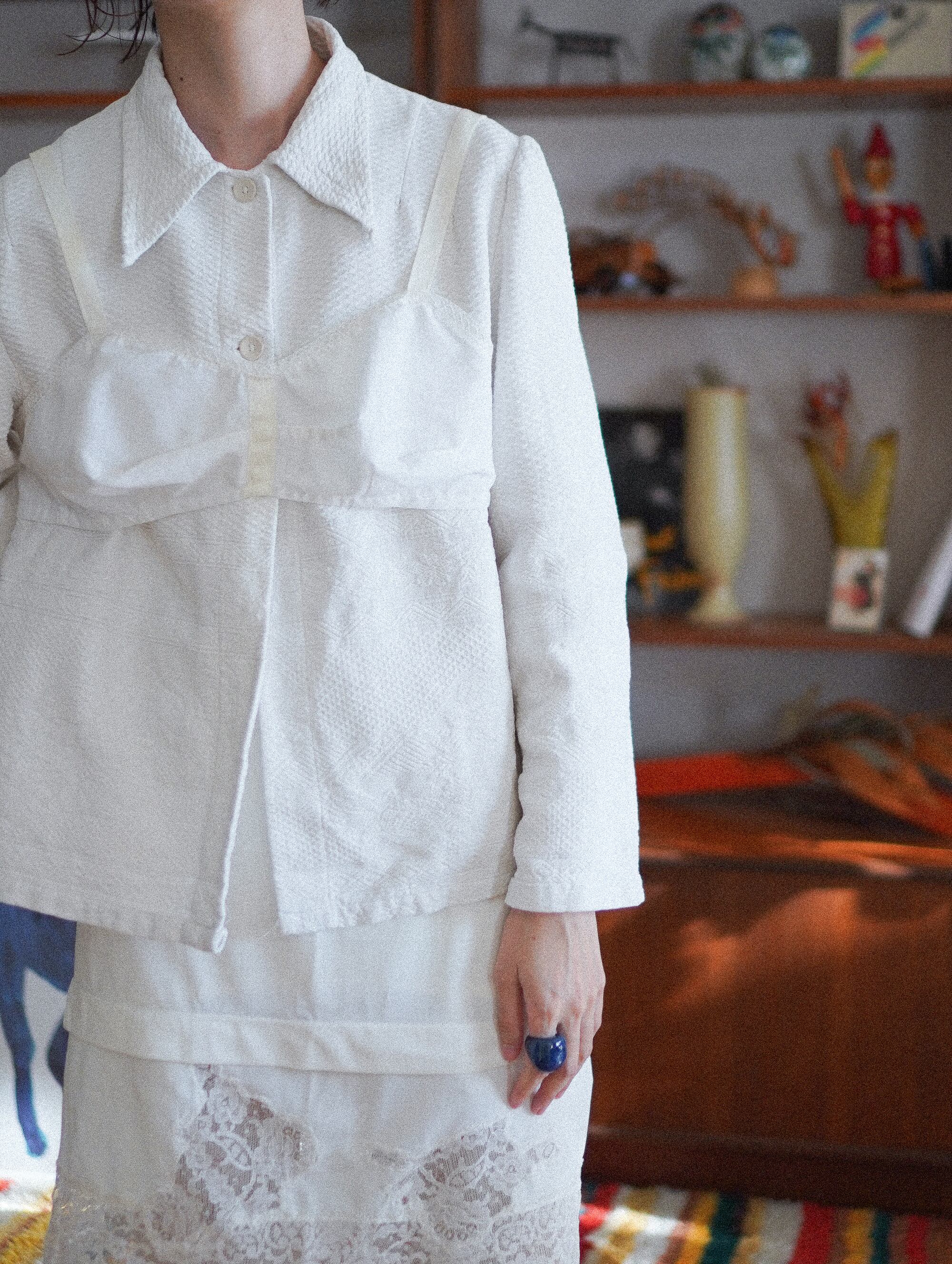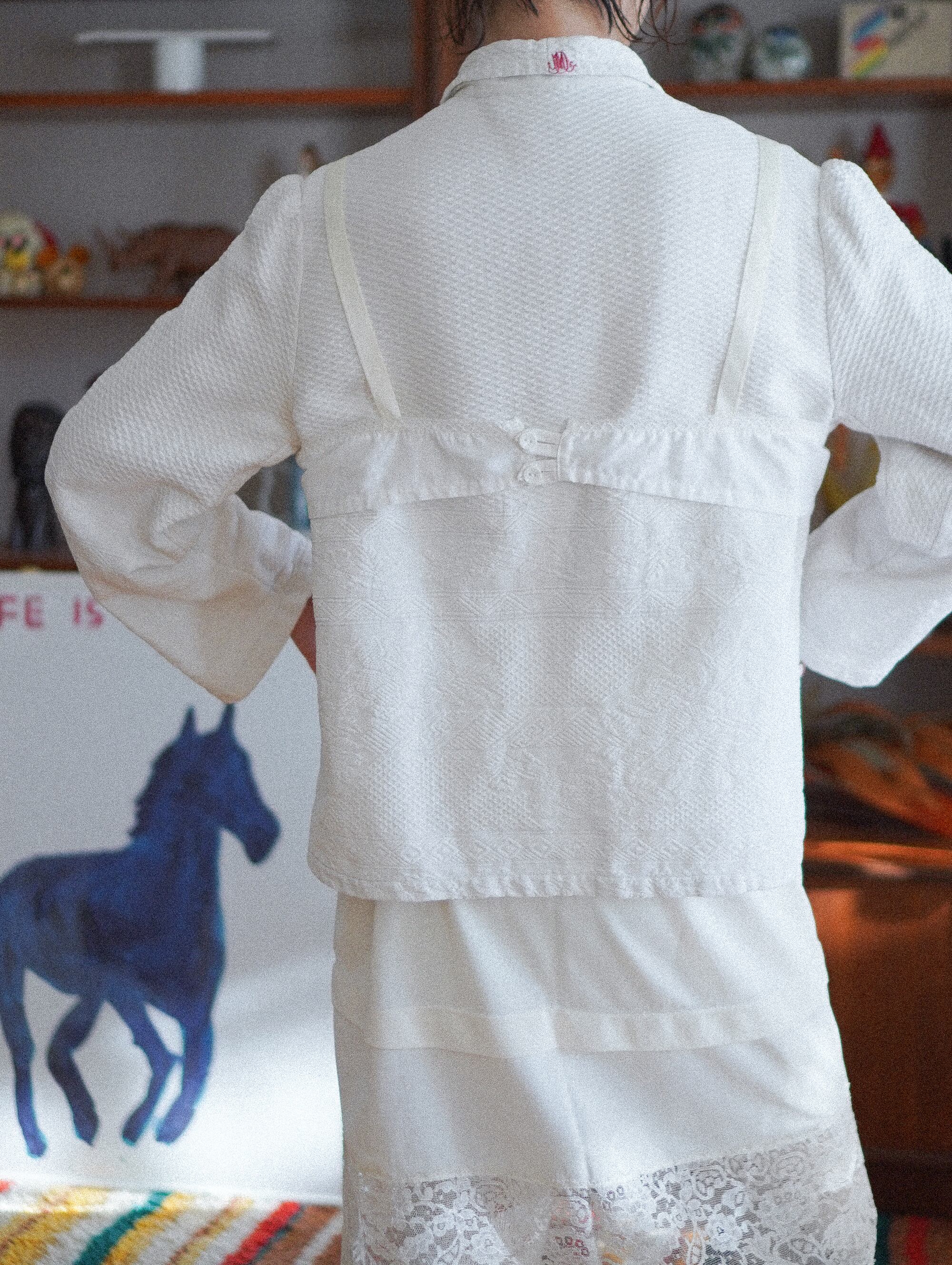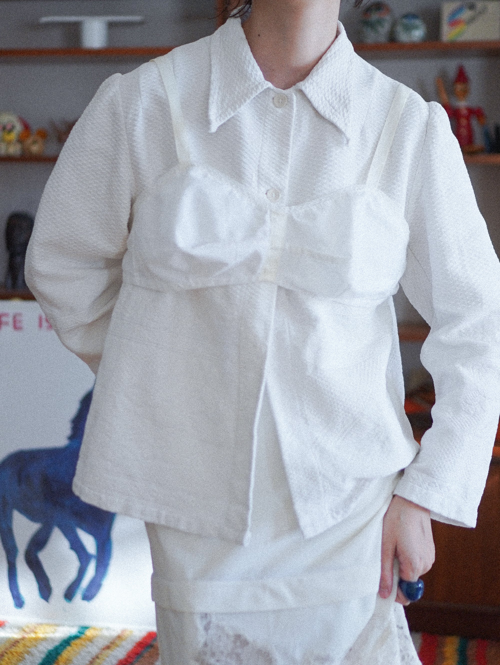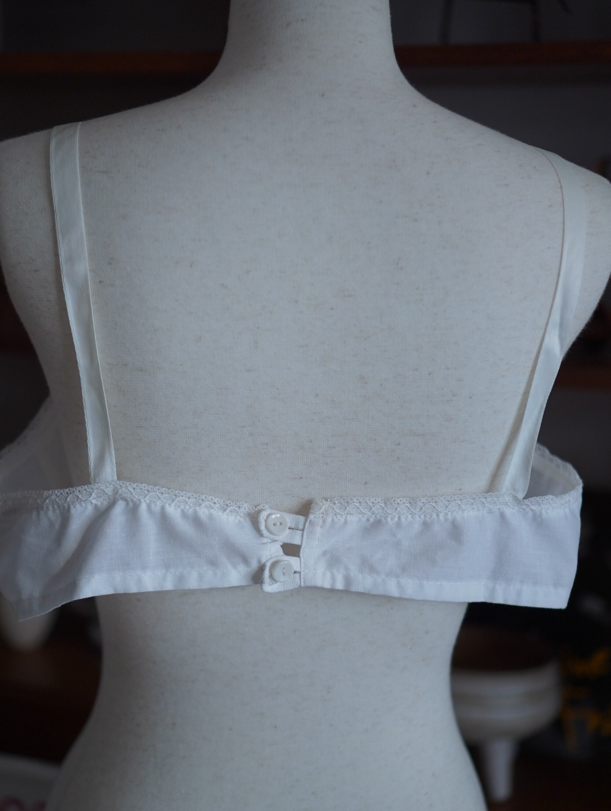 シンプルなカットに、やわらかな白のコットン。控えめにあしらわれたレースがチャームポイントなヴィンテージブラです。カップ部分はほどよい立体感があり、見た目の可憐さに反して、しっかり胸を包んでくれるつくり。ストラップもコットン製で、やさしい肌あたりです。ランジェリーとしてはもちろん、透け感のあるトップスやワンピースのインナーとして“見せてもかわいい”アイテムです。ハンガリーで出会った、小さくてやさしい宝もの。-vintage cotton bralette