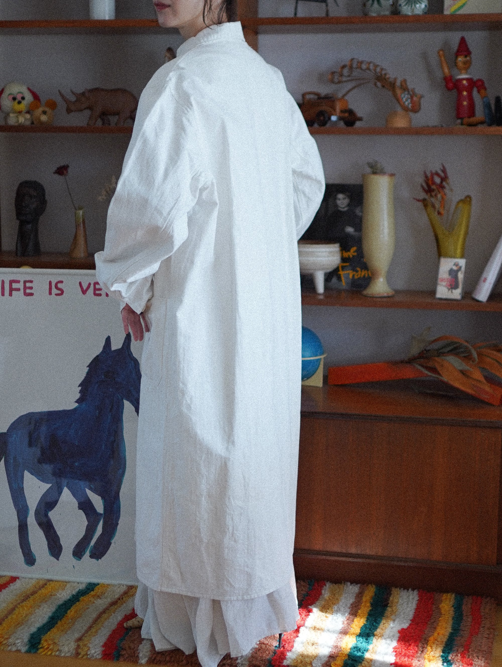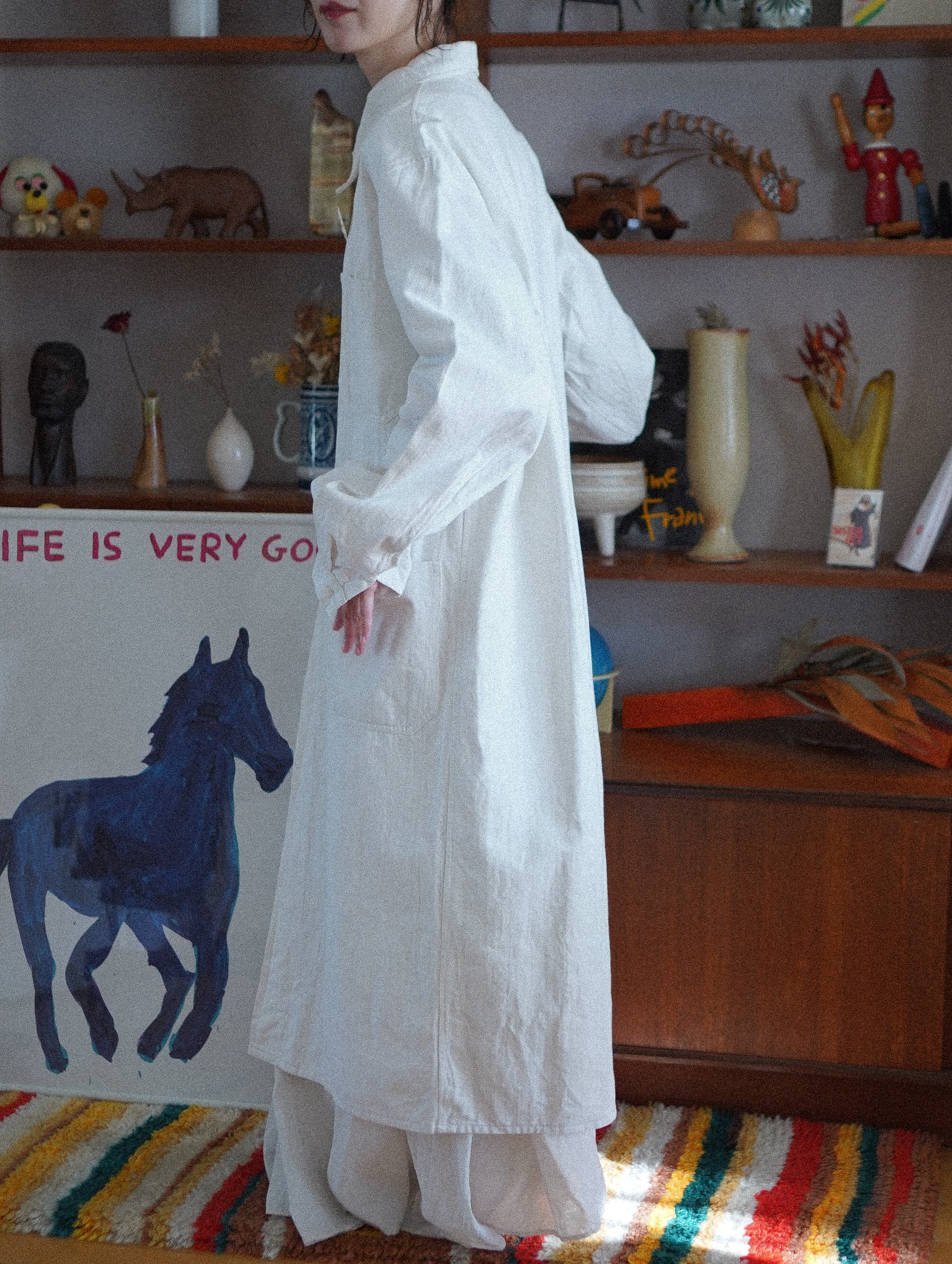 1950~60s頃にハンガリーで使われていた、病院用のヴィンテージコート。厚手のしっかりとしたコットン生地に、クラシカルな丸襟、無駄のないポケット配置、機能性を重視しながらも、佇まいが美しい一着です。当時の医療従事者が着ていたもののようですが、ミリタリーのような空気感もあり、ワークコートとしても◎。あえてワンピースのようにざっくり羽織ったり、ベルトでウエストマークしても素敵です。-hungary vintage medical coat