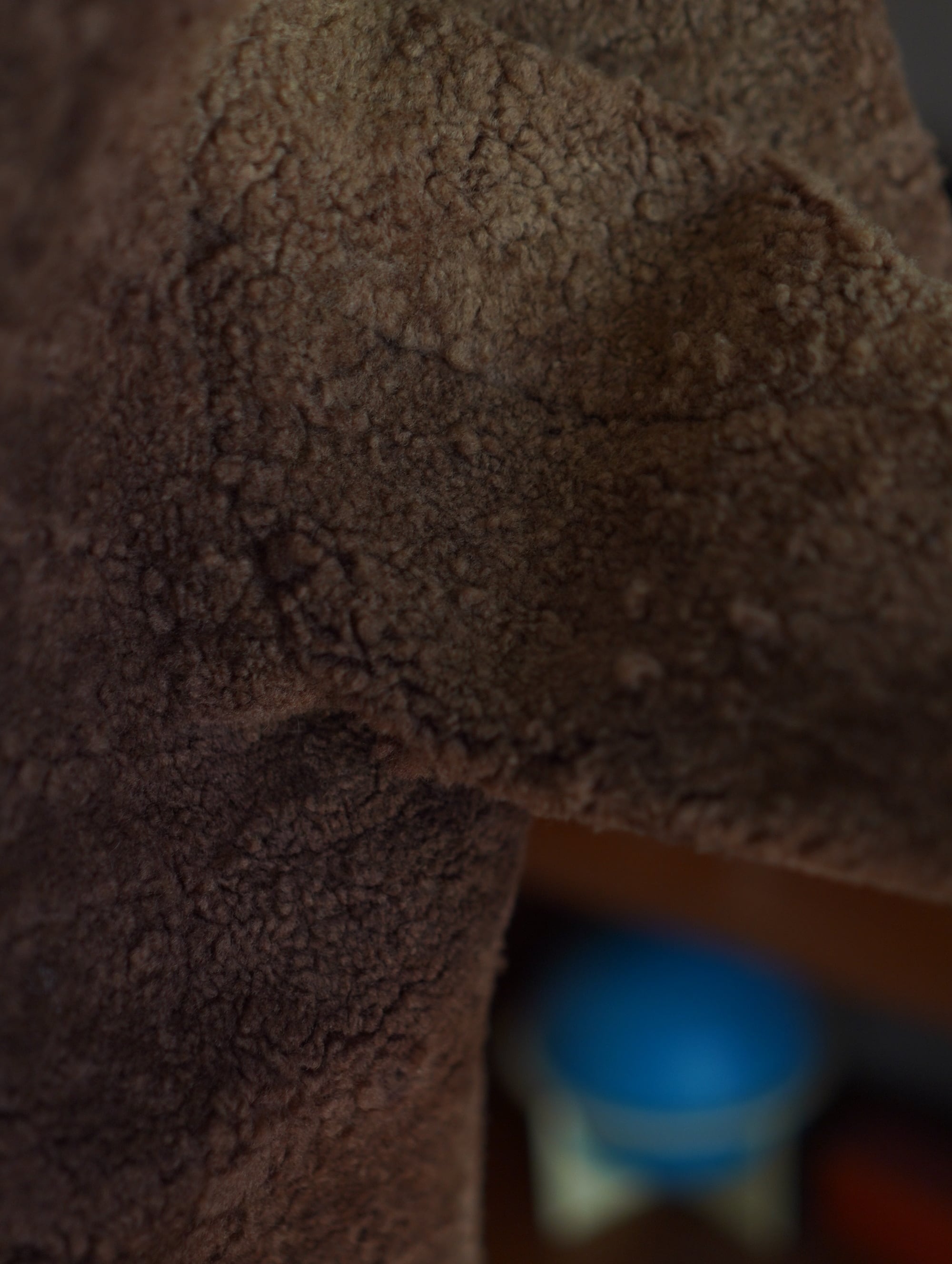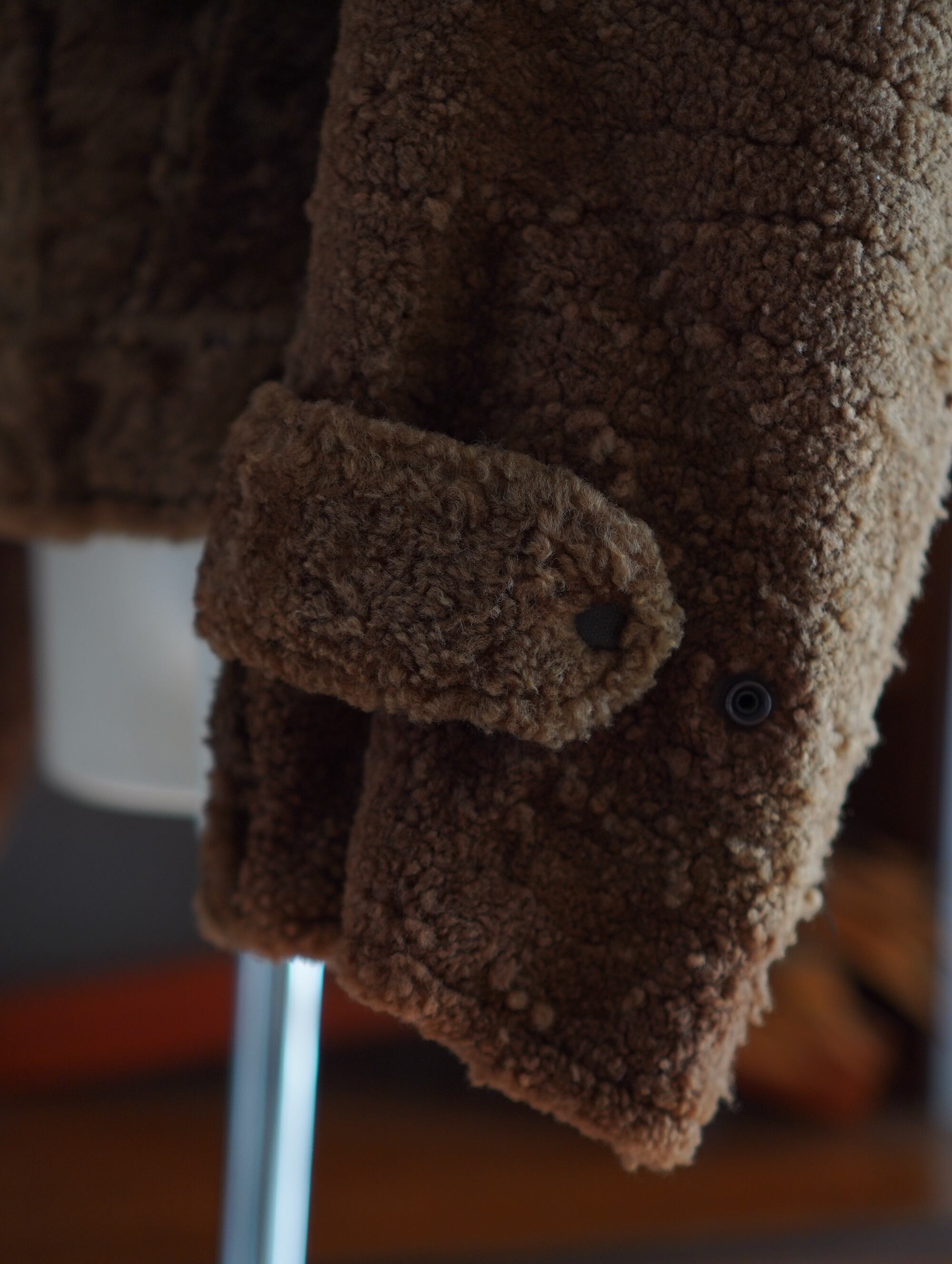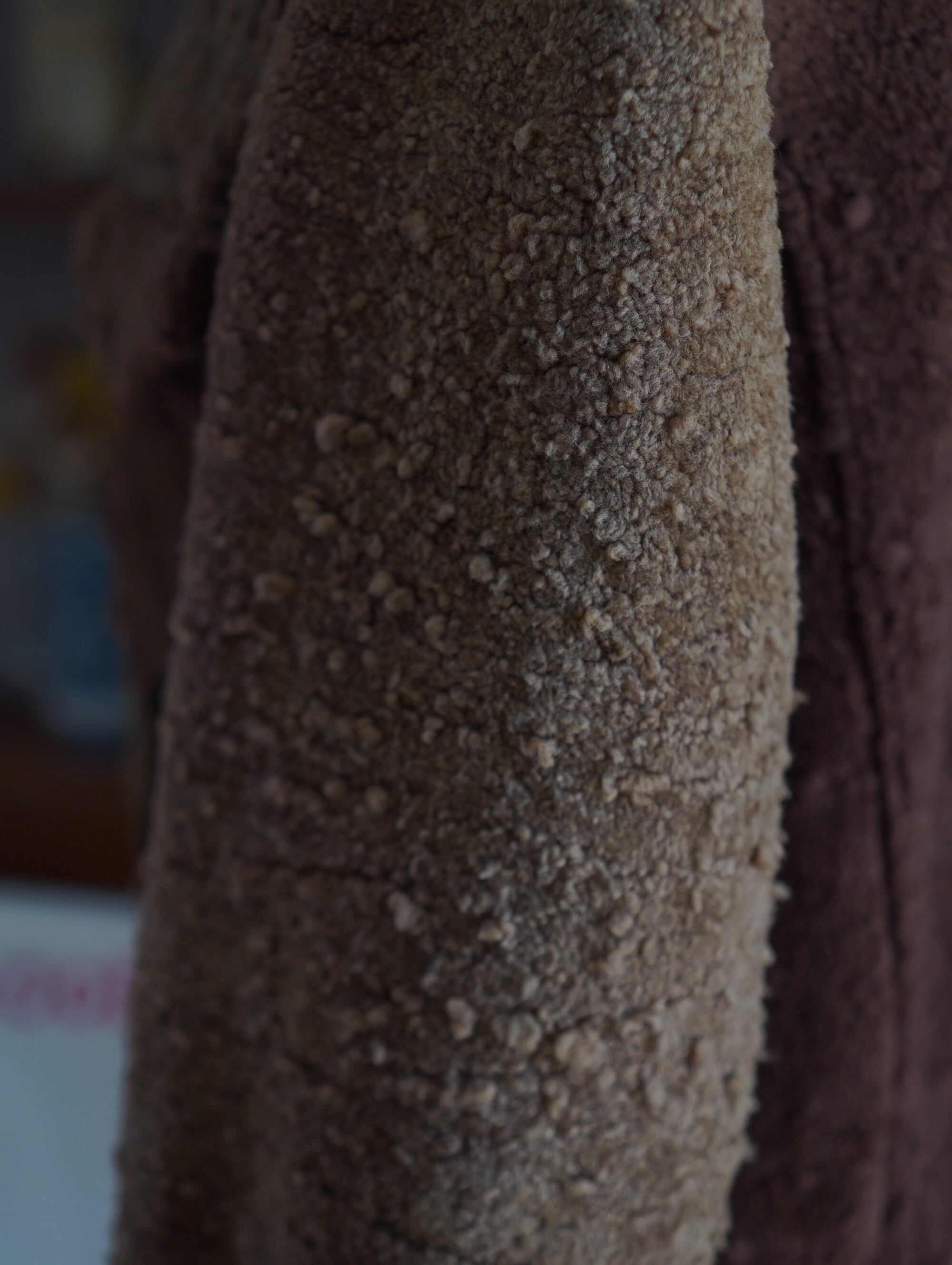 誰かのために特別に仕立てられた、ドイツ製の80's∼90'sリアルムートンジャケット。毛足のある面と、なめし面のバランス、ボリューム感のある襟や、袖先のベルトや大きめのポケットなど、機能的なディテールもさりげなく効いています。がっしりとした厚みのあるムートン素材ですが、実際に羽織ると重さが分散されて、想像よりも負担なく着られます(軽いわけではないですが、この密度なら納得の着心地です)。素材は表側がふかふかのシアリング、内側はスエード面を活かした一枚仕立て。裏地がなくてもあったかい、ムートンのうれしいところです。