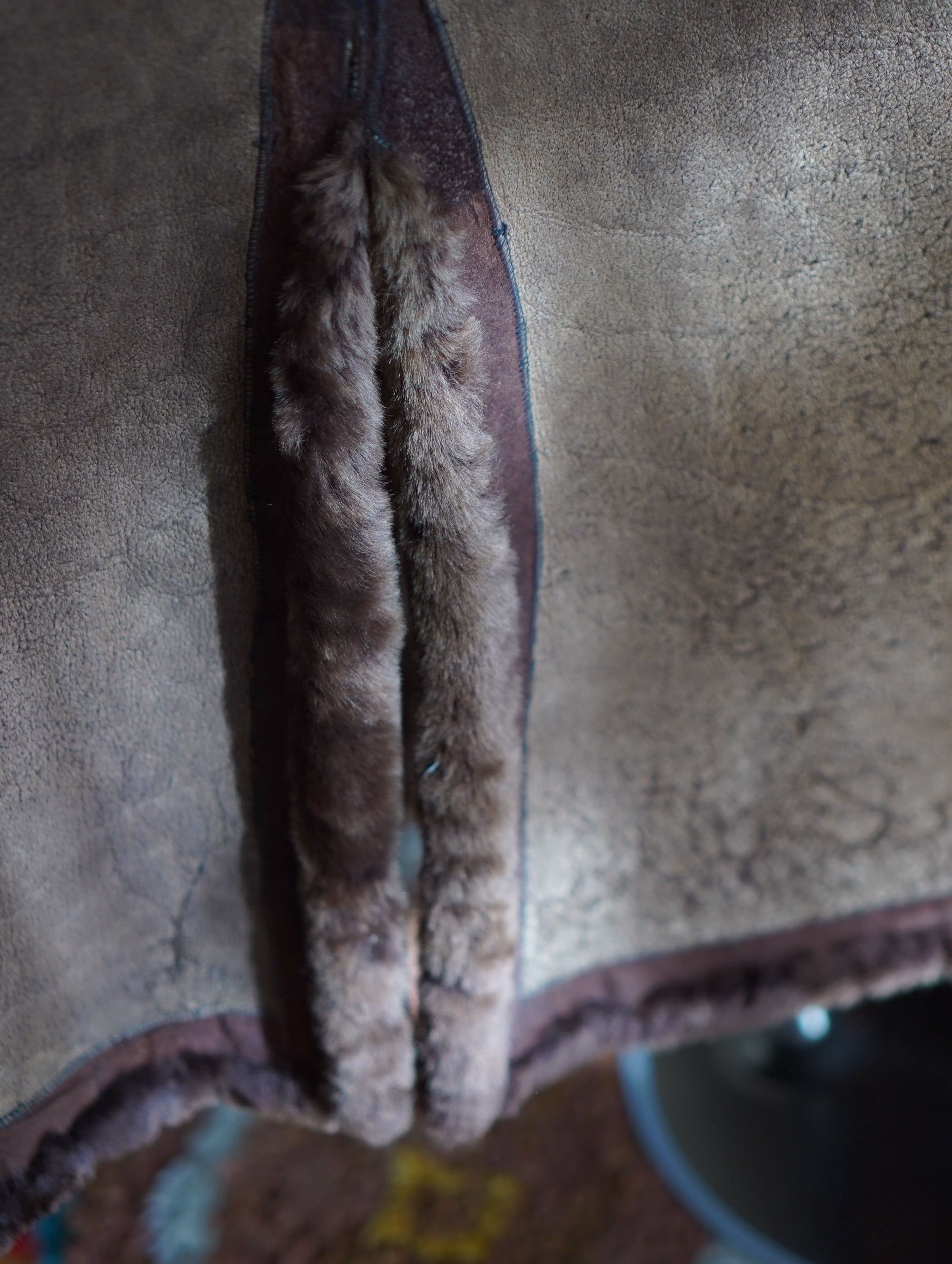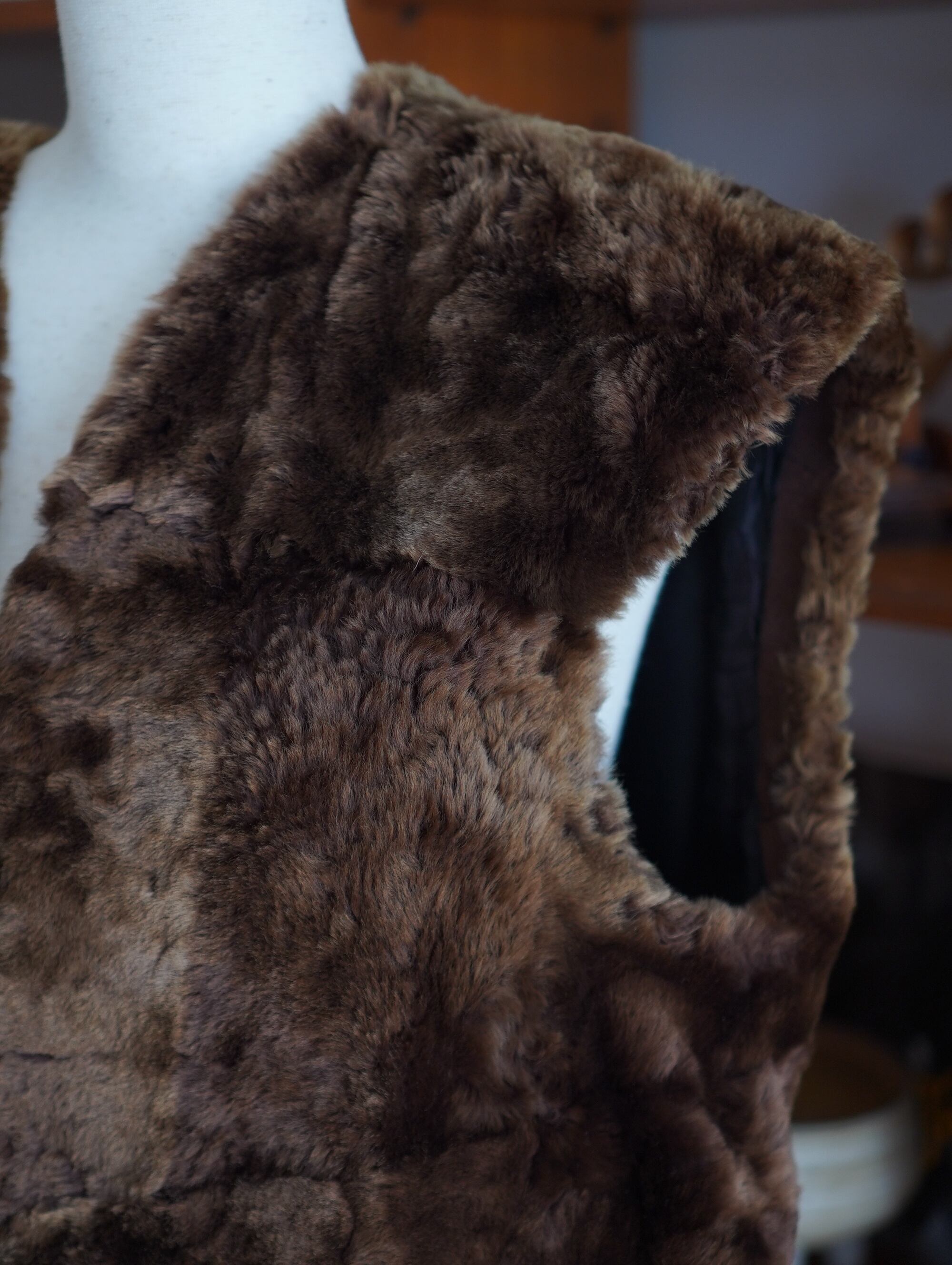 リアルムートンならではのずっしりとした質感と、深みのあるダークチョコレートブラウンの色味が印象的な、ロング丈のベストコート。なかなか出会えない特別な一着です。裏側はスエード面が活かされており、1枚仕立てのシンプルさがムートンそのものの美しさを惹きたてます。袖がない分、全体の重さは程よく分散されており、見た目ほど重たくは感じません(ただし「軽やか」ではないので、しっかりとした存在感があります)。身体を包み込むようなフォルムと、縦長のシルエットが美しく、ラフなニットやカットソーの上に羽織るだけで、ぐっと雰囲気が出ます。シンプルな装いにプラスするだけで、“ただ者じゃない”ムードを添えてくれる1着。後ろまで贅沢にリアルムートンが使用されており、厚みと密度のあるファーは、ヴィンテージならではの風格とぬくもりを感じさせます。-"chocolate searling vintage long vest