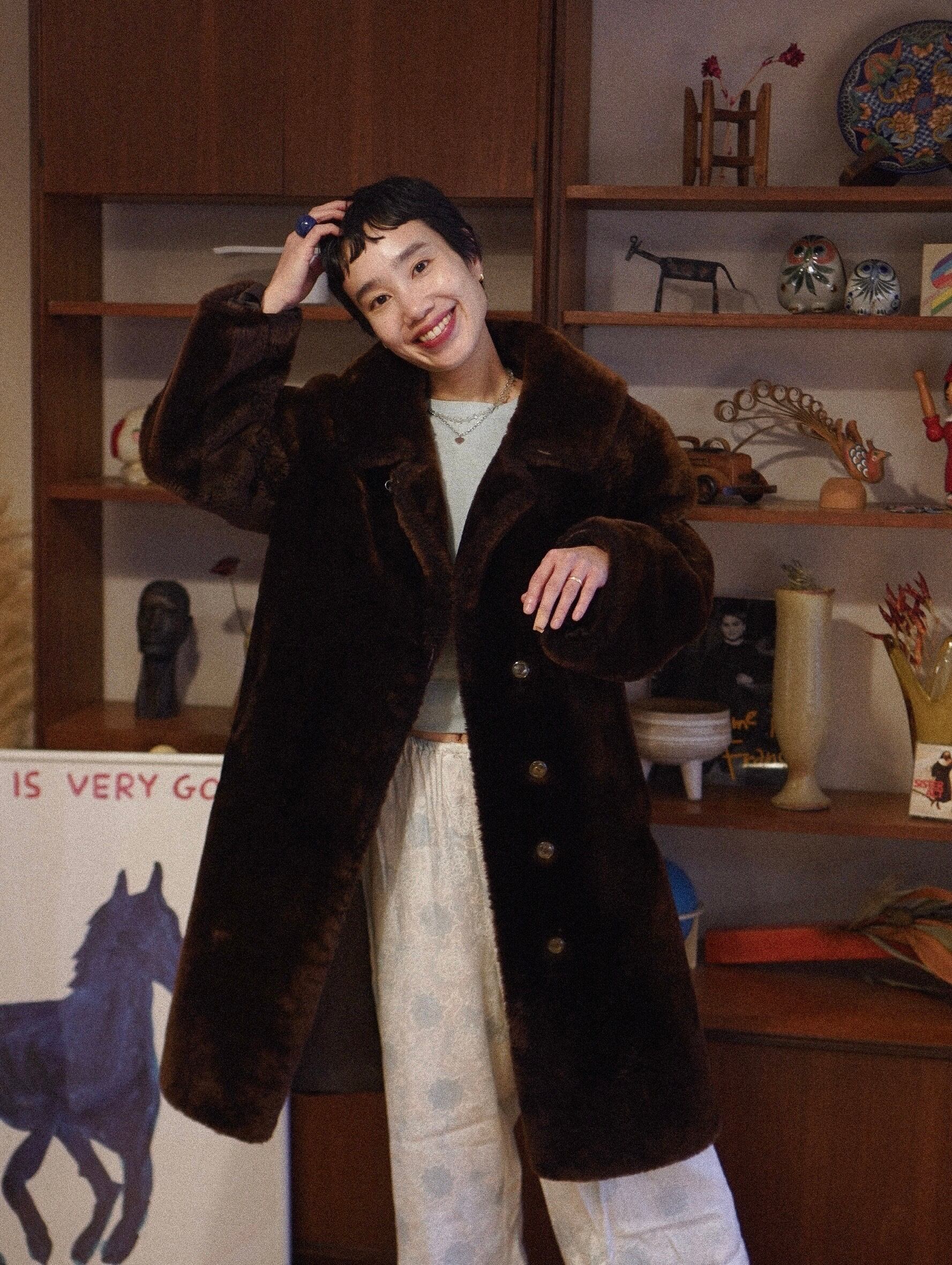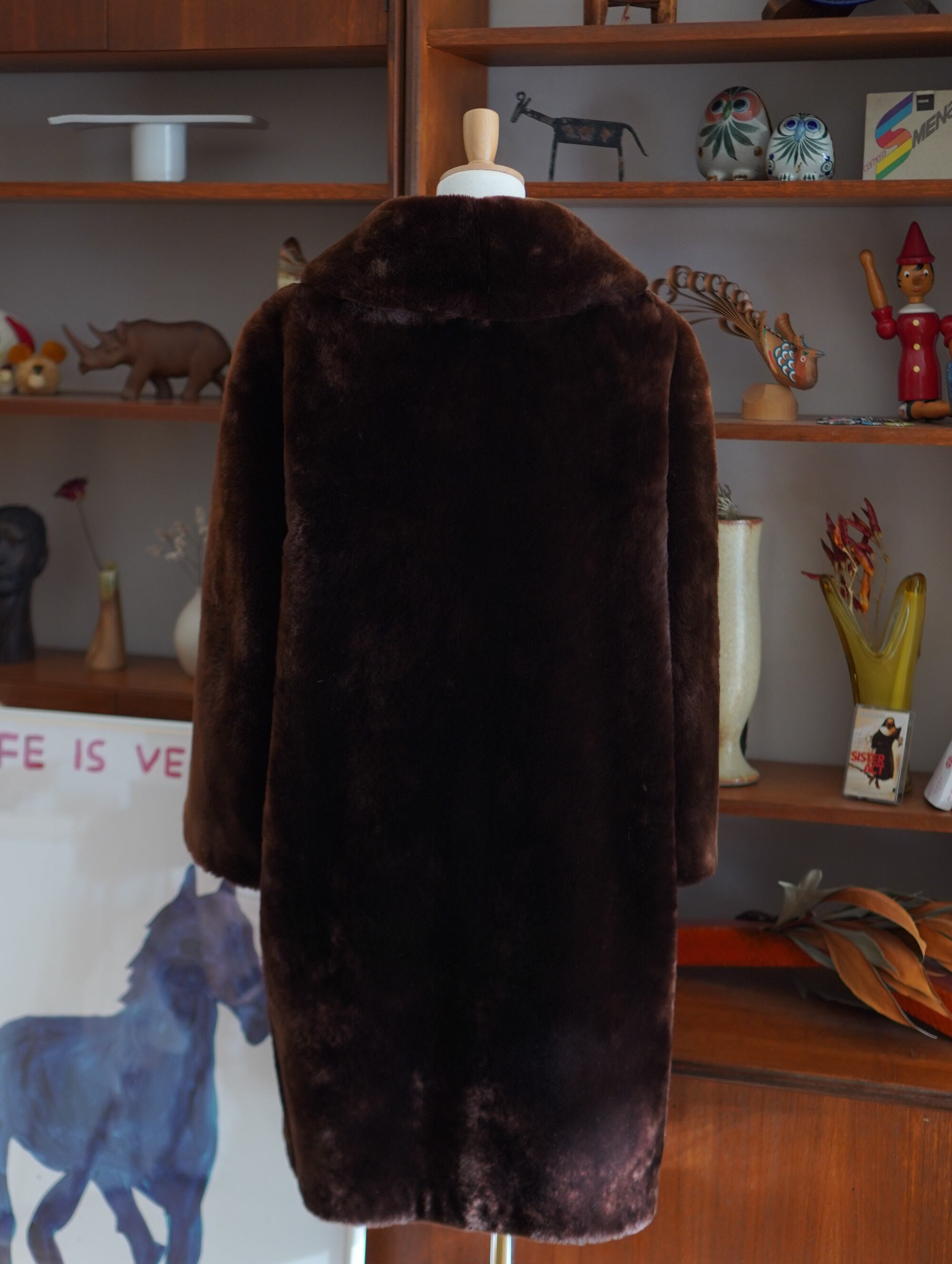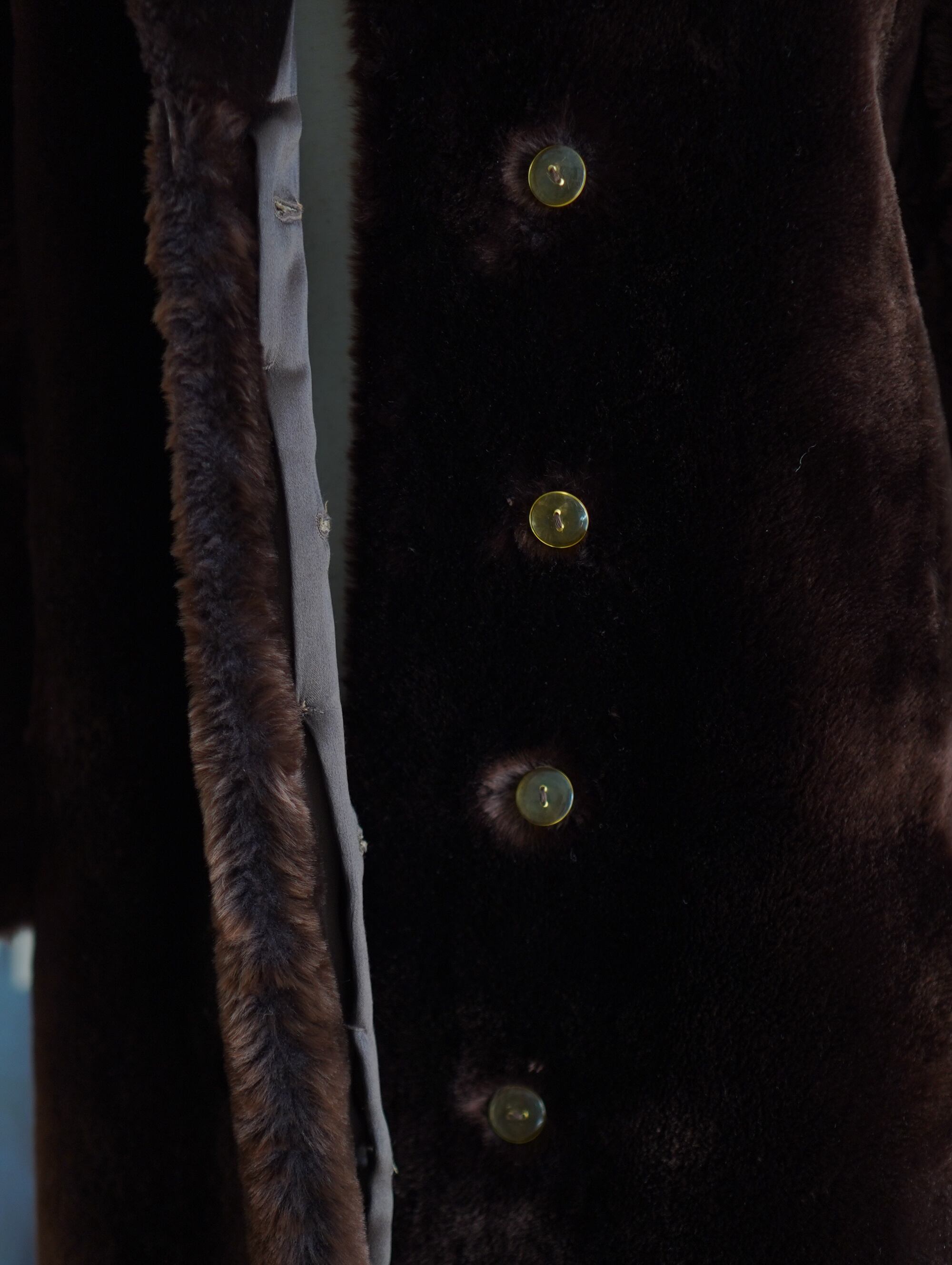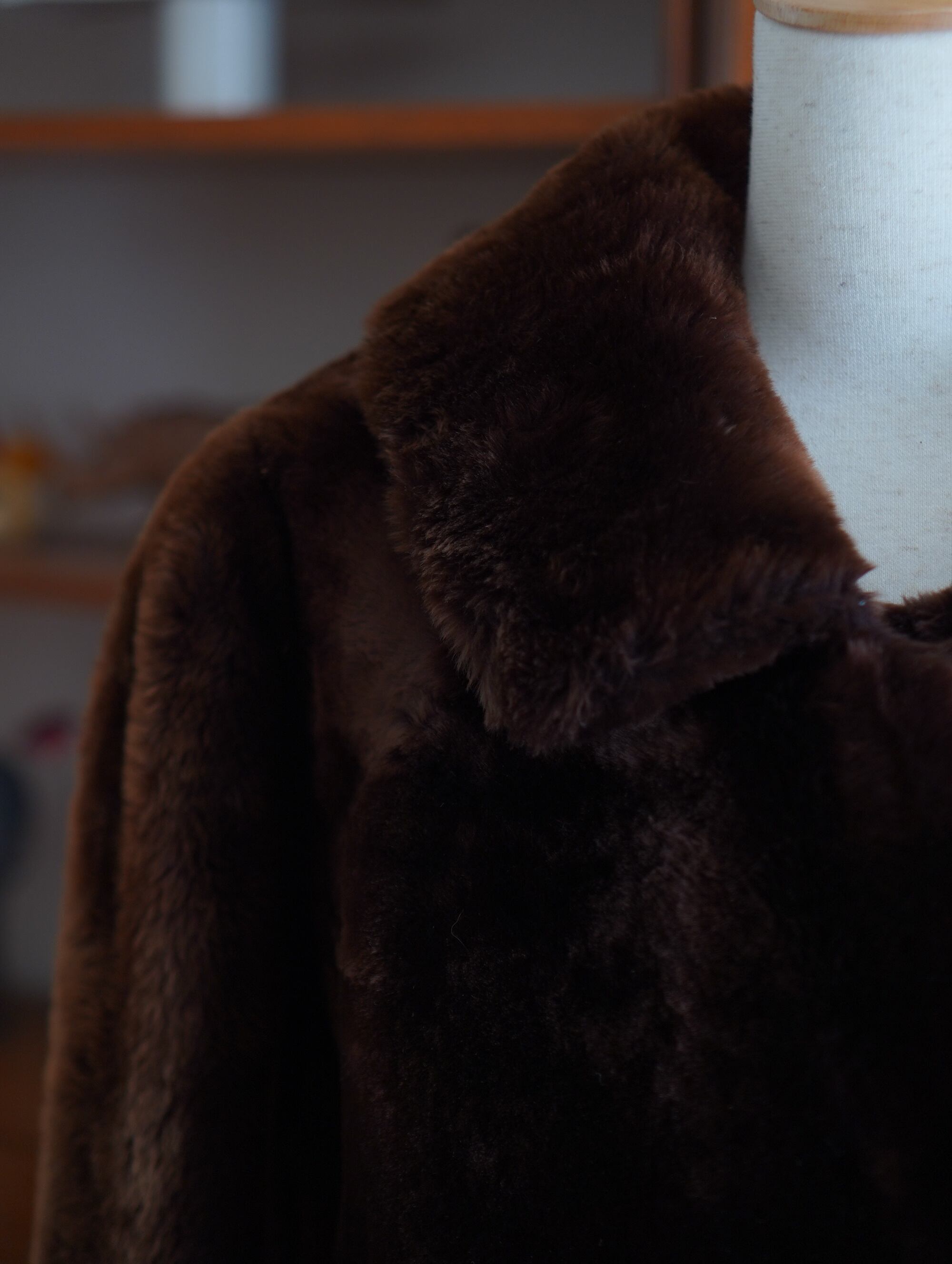 しっかりと重みのある一着。でもそれ以上に、リアルファーだからこその驚くほどの暖かさが全身を包み込みます。ダークブラウンの深みのあるカラーと、しっとりと光沢のある毛並み。上品さと迫力を兼ね備えた、まさに冬の主役級コートです。クリアな、くすんだイエローの古いボタンがチャームポイント。クラシカルな佇まいの中に個性が光ります。裏地まで丁寧に仕立てられており、肌触りの良さも格別。ぬいぐるみに包まれてるような、ぬくーっとした暖かさで心も温まります。-vintage real fur long coat in deep brown