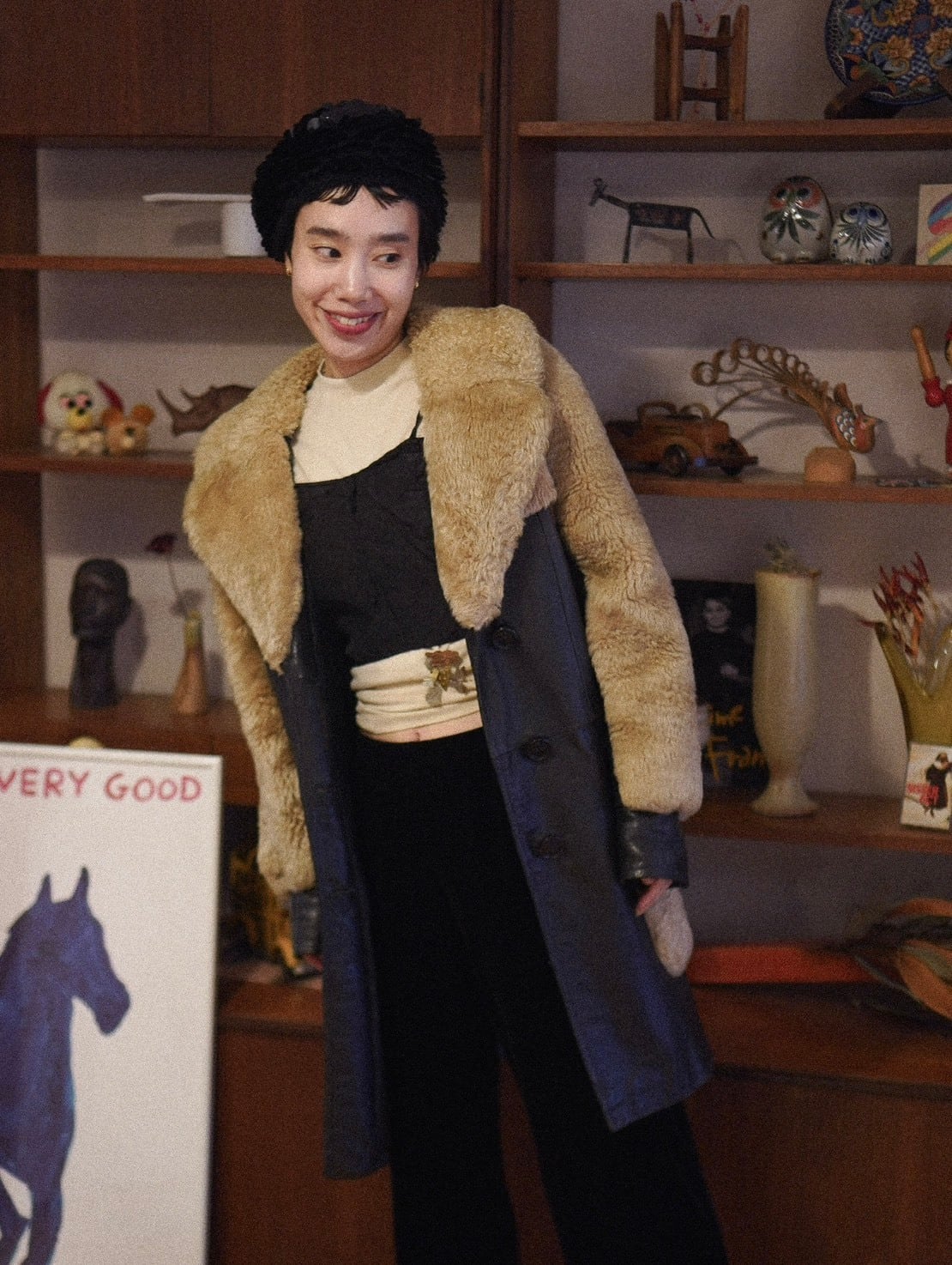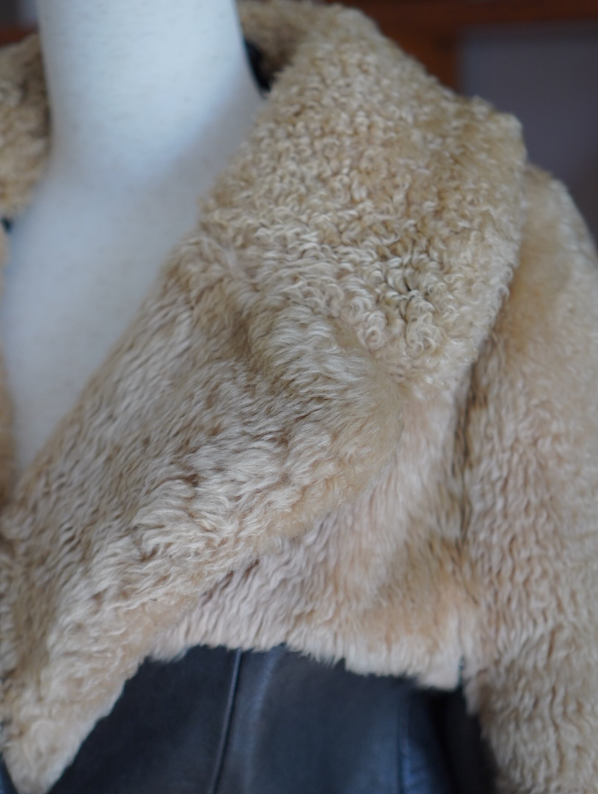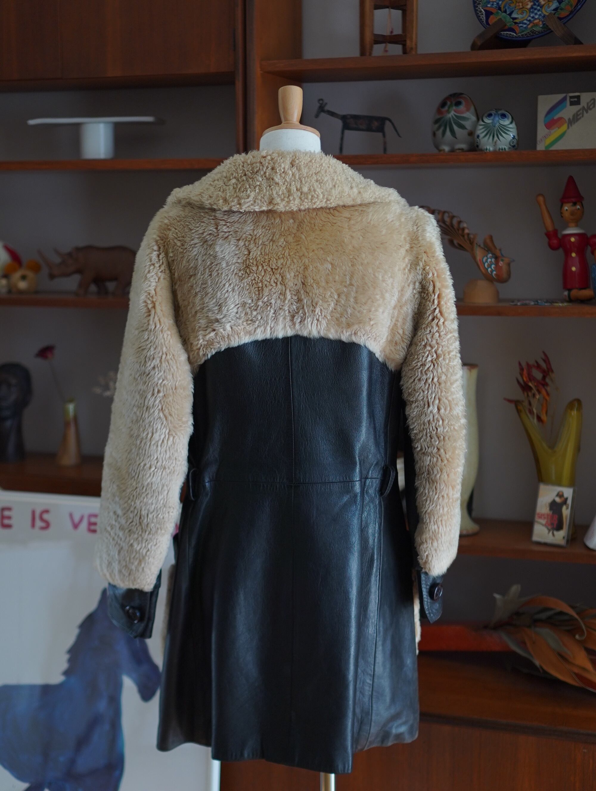 ハンガリー製、80's~90's頃のムートンコート。ブランドは「elegant MAJUS RUHAGYAR」。リアルムートンのふわふわ感と、しっとりとしたブラックレザーのコントラストが唯一無二です。上半身を包み込むようなボリュームと、下半身はすっきり落ちるシルエットで、重さが全体に分散されて、着ると意外なほど軽やか。首回りやポケットにもムートンがたっぷりあしらわれていて、暖かくて心強いです。ウエストがきゅっとなるシルエットが上品です。人と被らない主役級の一着。/hungarian vintage "elegant MAJUS" real shearling & leather long coat with belt