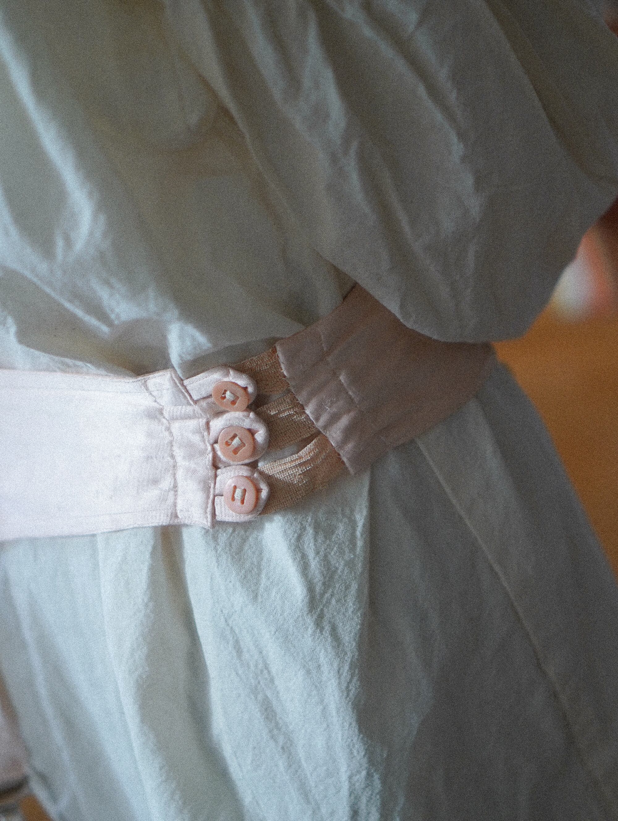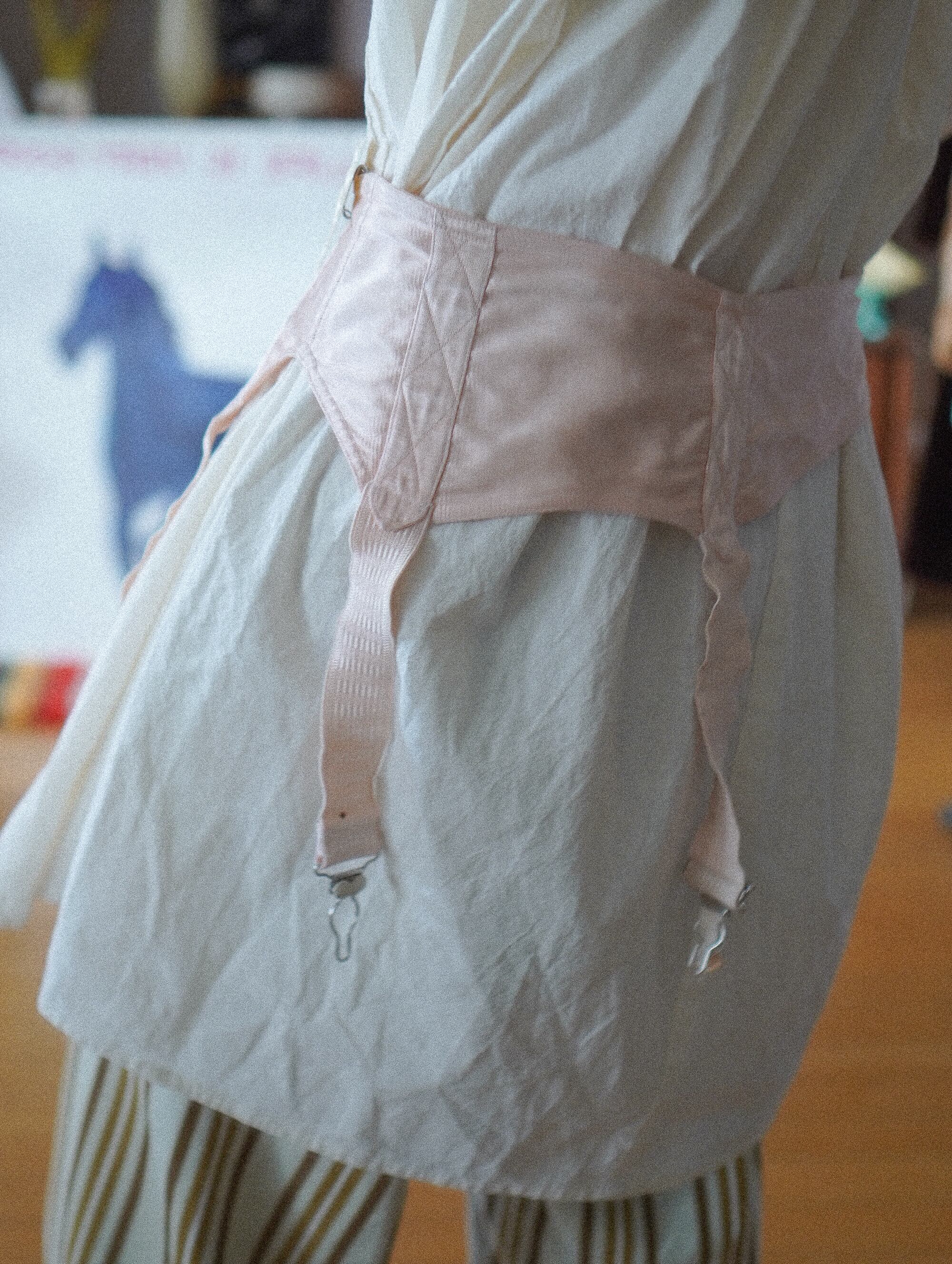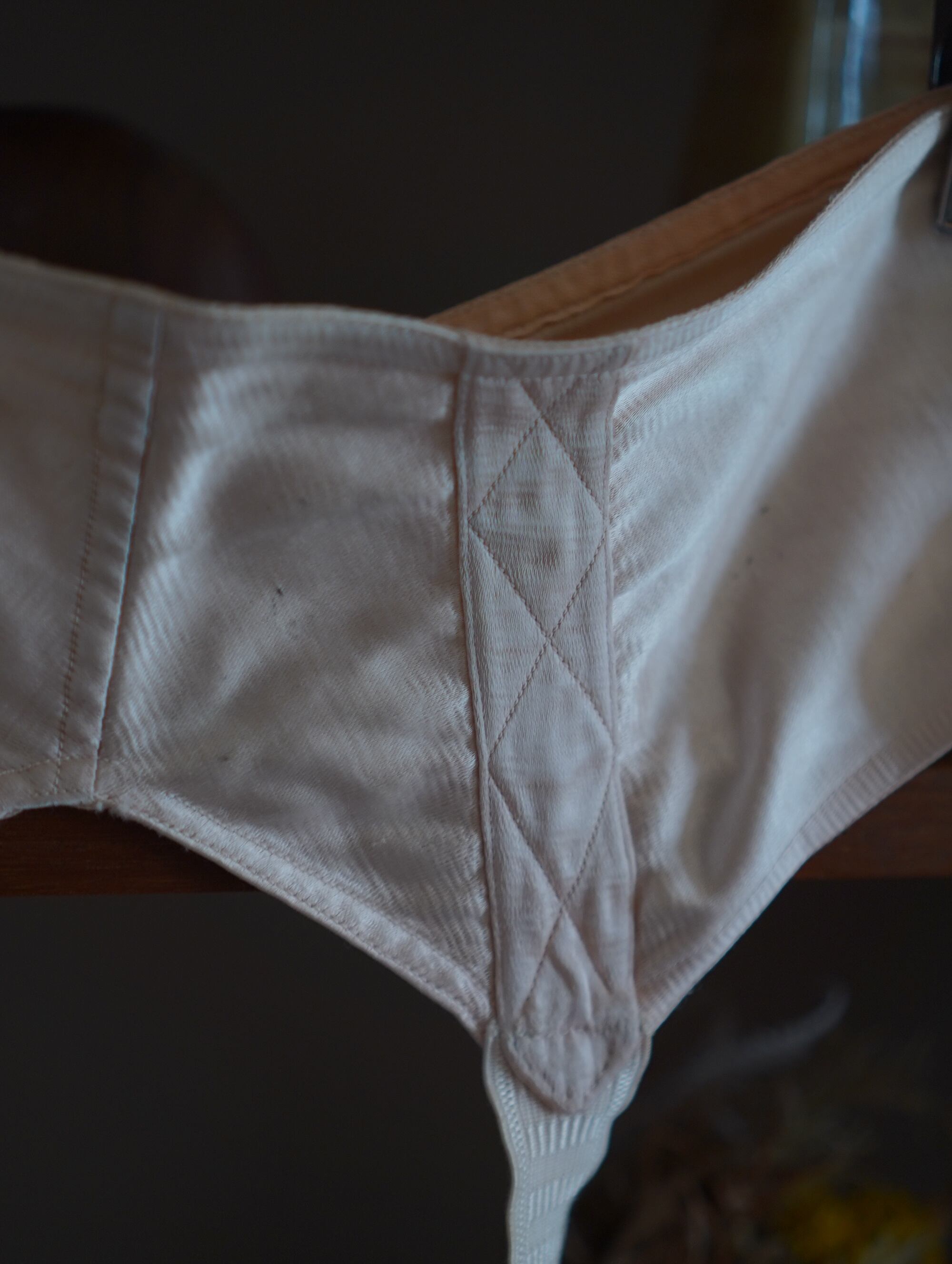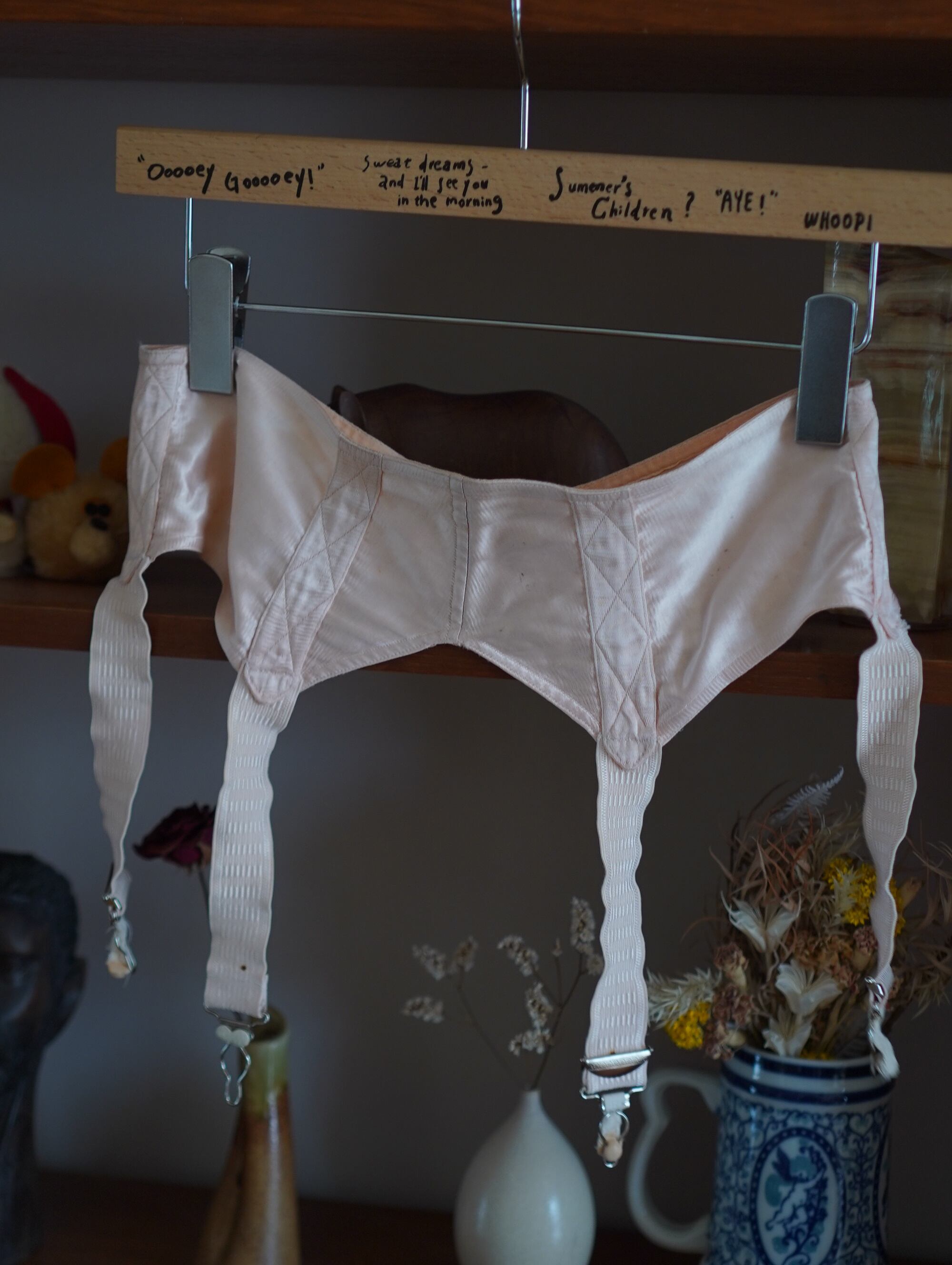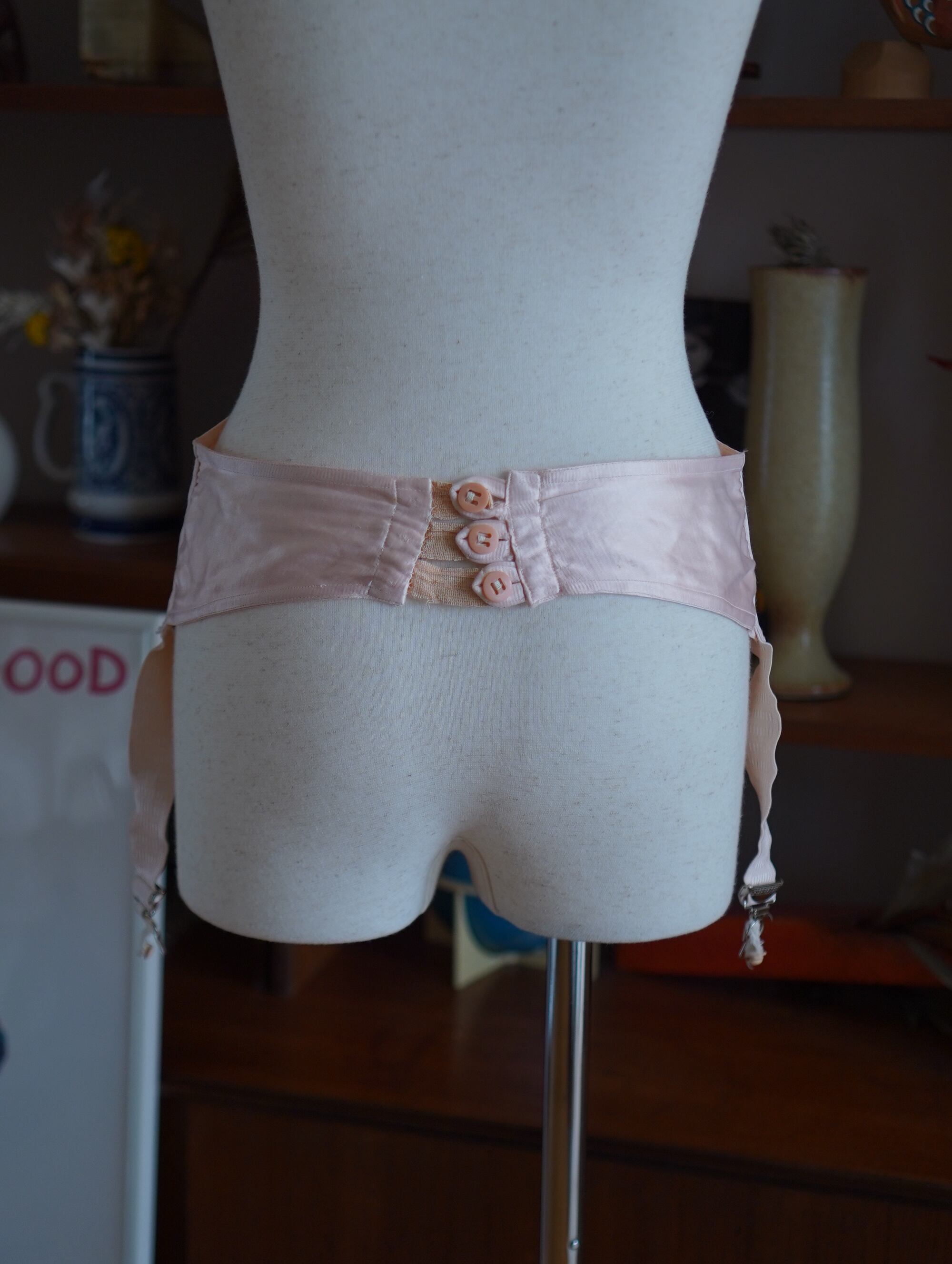 つやっとしたスモーキーピンクの色合いがとびきりキュートな、1930〜40年代頃のガーターベルト。高級感のあるサテン地で、ハンガリー語のタグがキュンポイント。くすみがかった落ち着いたピンクが甘すぎず、ちょっぴり色っぽい空気もまとっています。ウエストをぐるりと包む幅広のシルエットに、昔のままの金具やボタンがついていて、古いものならではの雰囲気がたっぷり。ランジェリーとしてはもちろん、ボトムの上からベルトみたいに合わせるコーデもおすすめです。いつもの服に、ちょっとした“ときめき”をプラスしてくれる一着です。/1930s~40s hungarian satin garter belt-smoky pink
