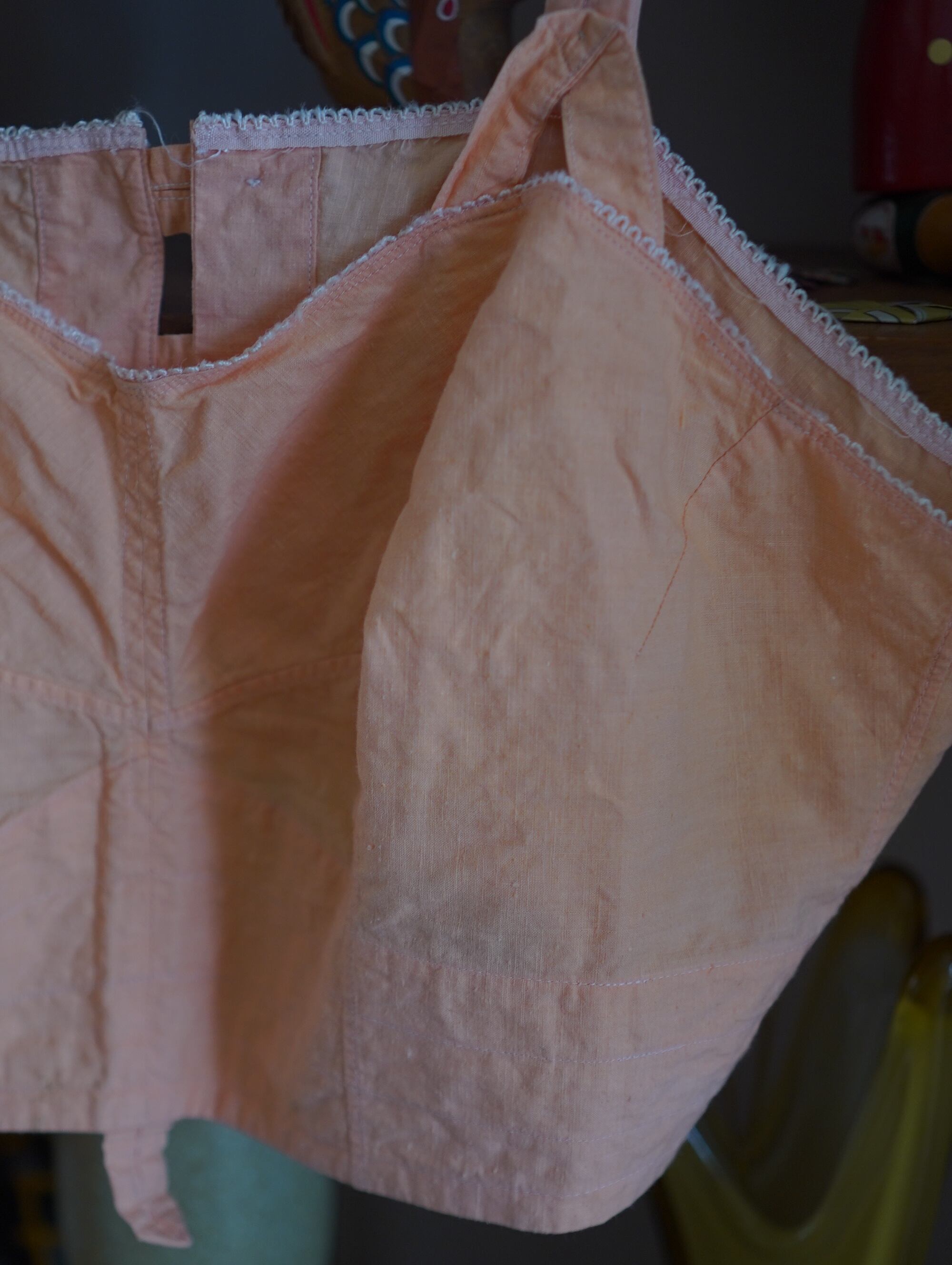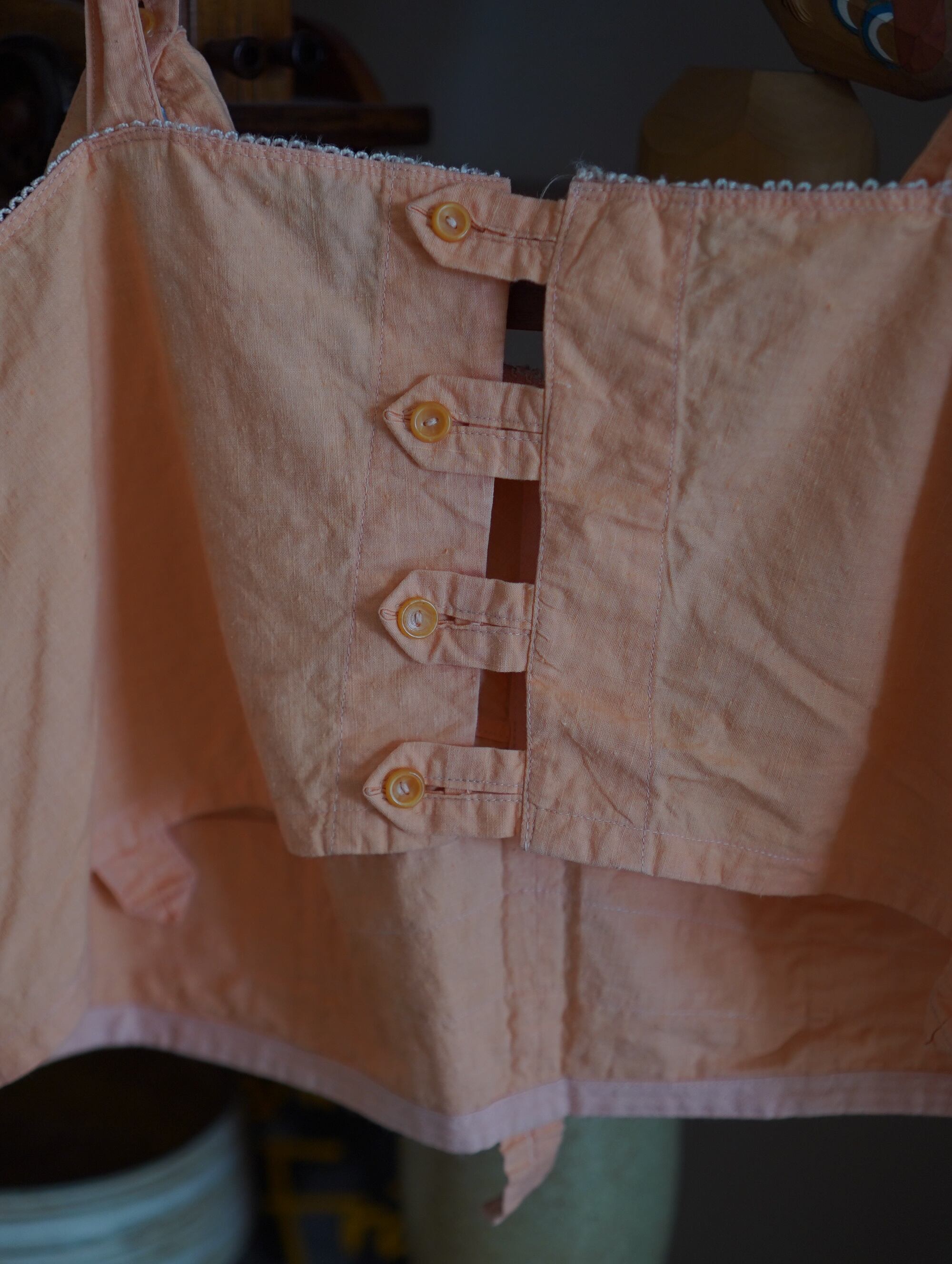 やさしいピーチピンクと愛らしいフォルムがキュートな、1930〜40年代ごろのヴィンテージブラトップ。薄手のコットンで、軽やかな着心地です。儚い雰囲気が最高にたまらない一着です。大き目なブラウスやニット、スウェットの上から重ね着するのもおすすめです。肩ひもはボタンで調整&取り外しも可能です。さりげないふちのレースもキュンポイントです。/1930s∼40s vintage cotton bra top-peach pink
