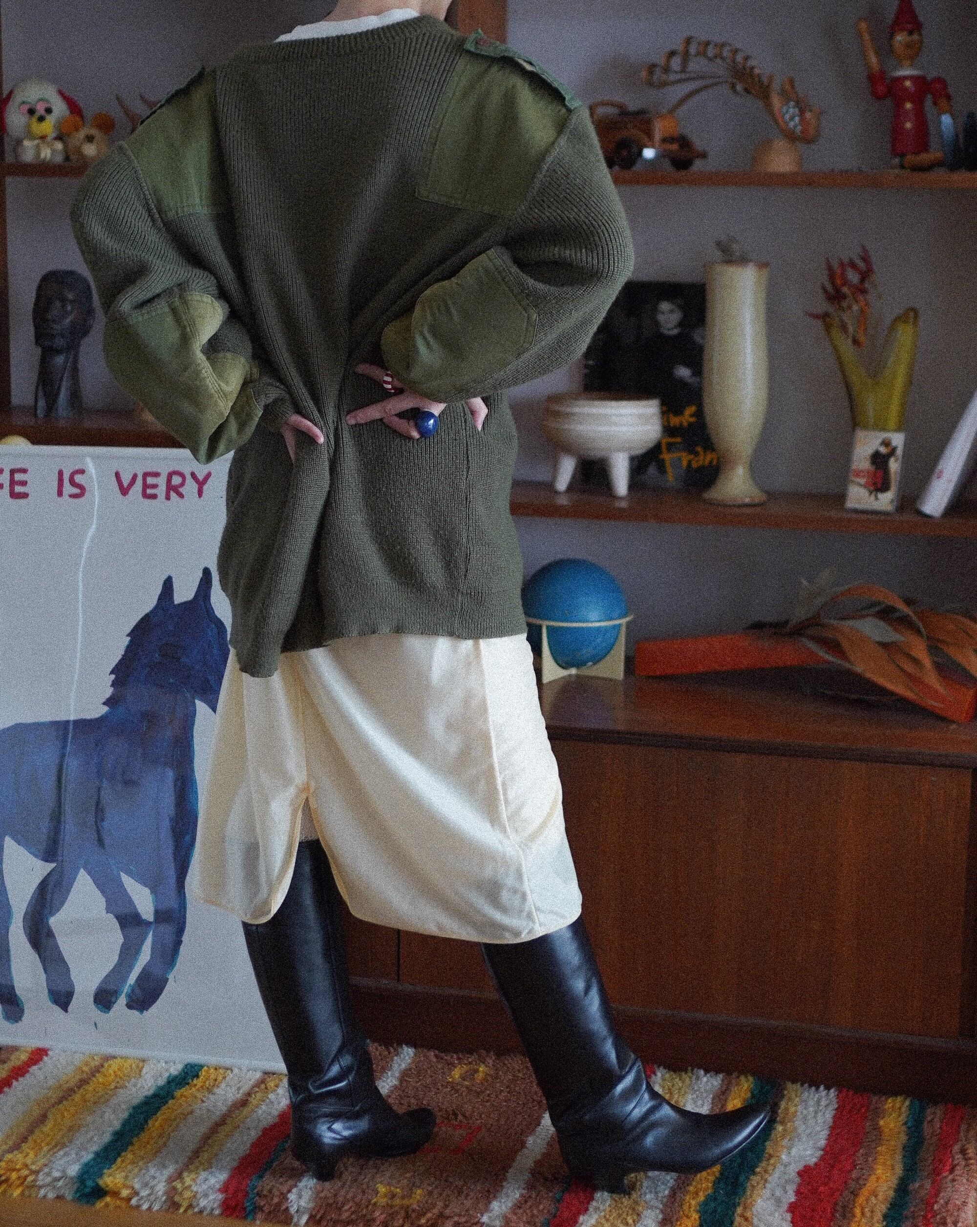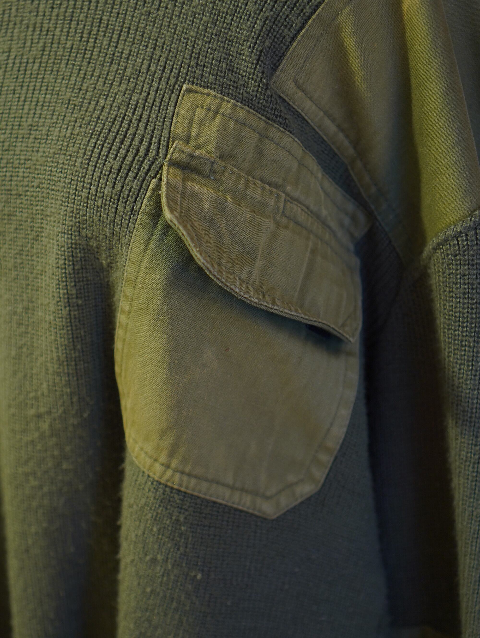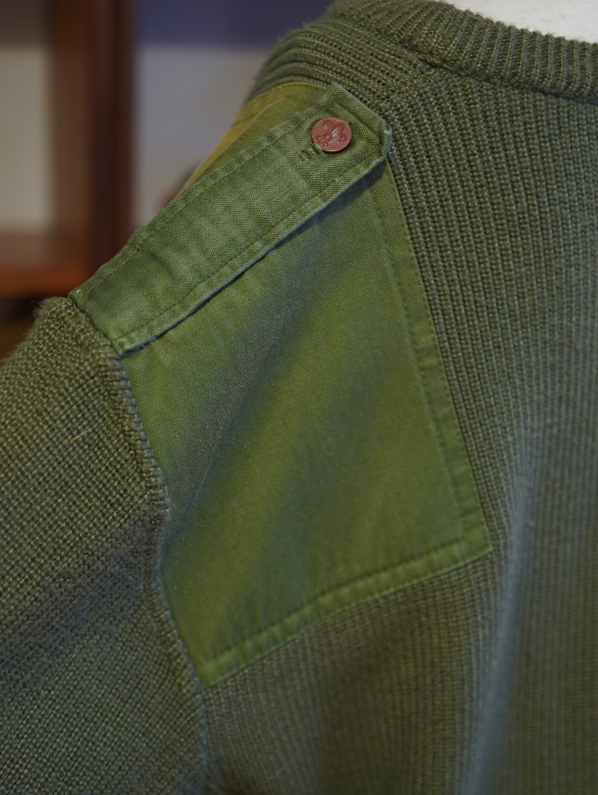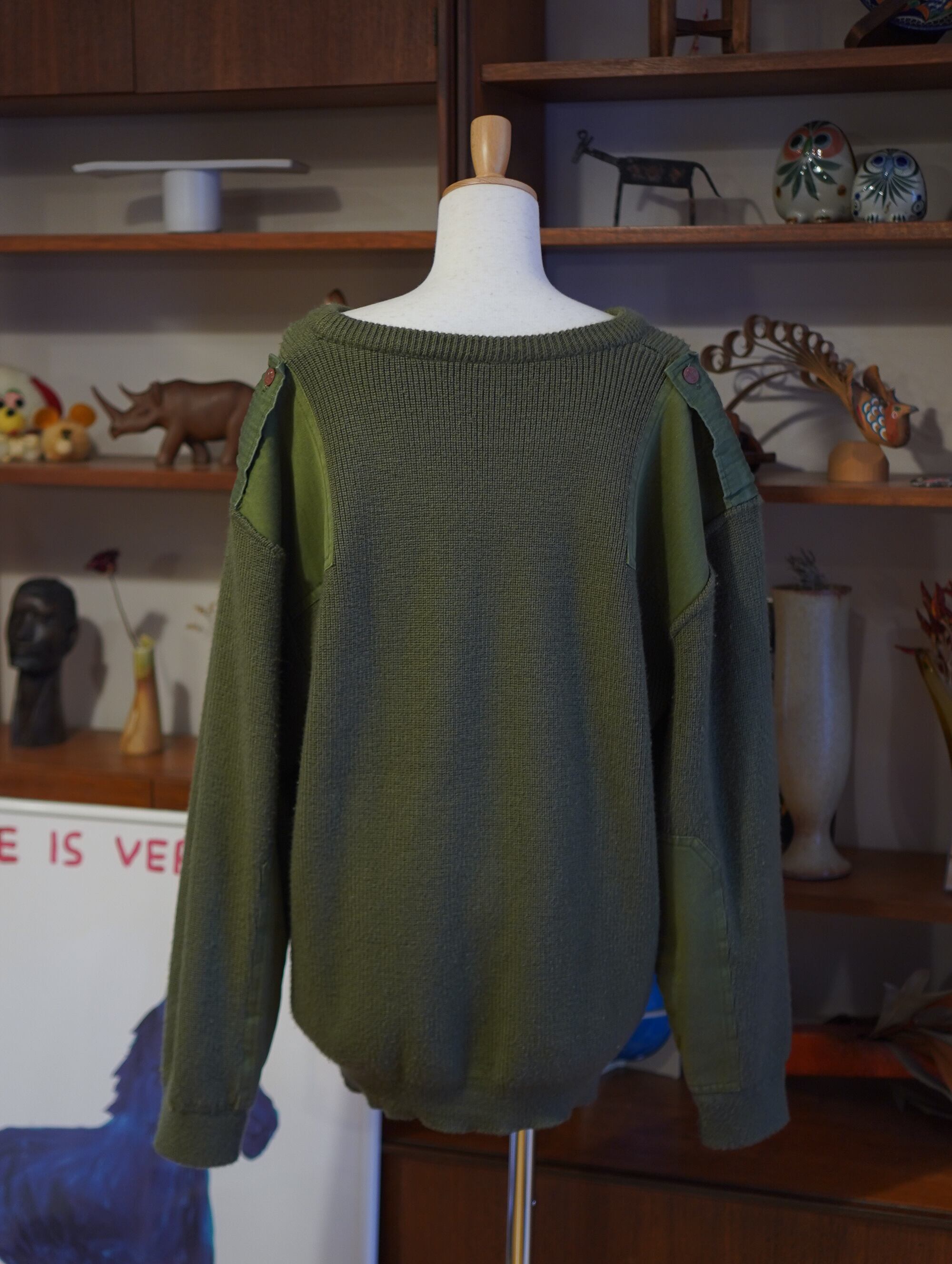 ハンガリー軍のヴィンテージプルオーバー。無骨なオリーブグリーンのニット地に、同系色のミリタリーパッチが大胆に縫い付けられた、モード感漂う1枚です。胸ポケットや肘当て、すべて本来の軍仕様を活かしたディテール。ガサッとした生地の感じや、古いボタンの刻印も、時代を感じる渋さがたまらなくかっこいいです。ゆるっと着用いただけて、甘めのスカートと合わせるのもおすすめです。/hungarian army knit pullover