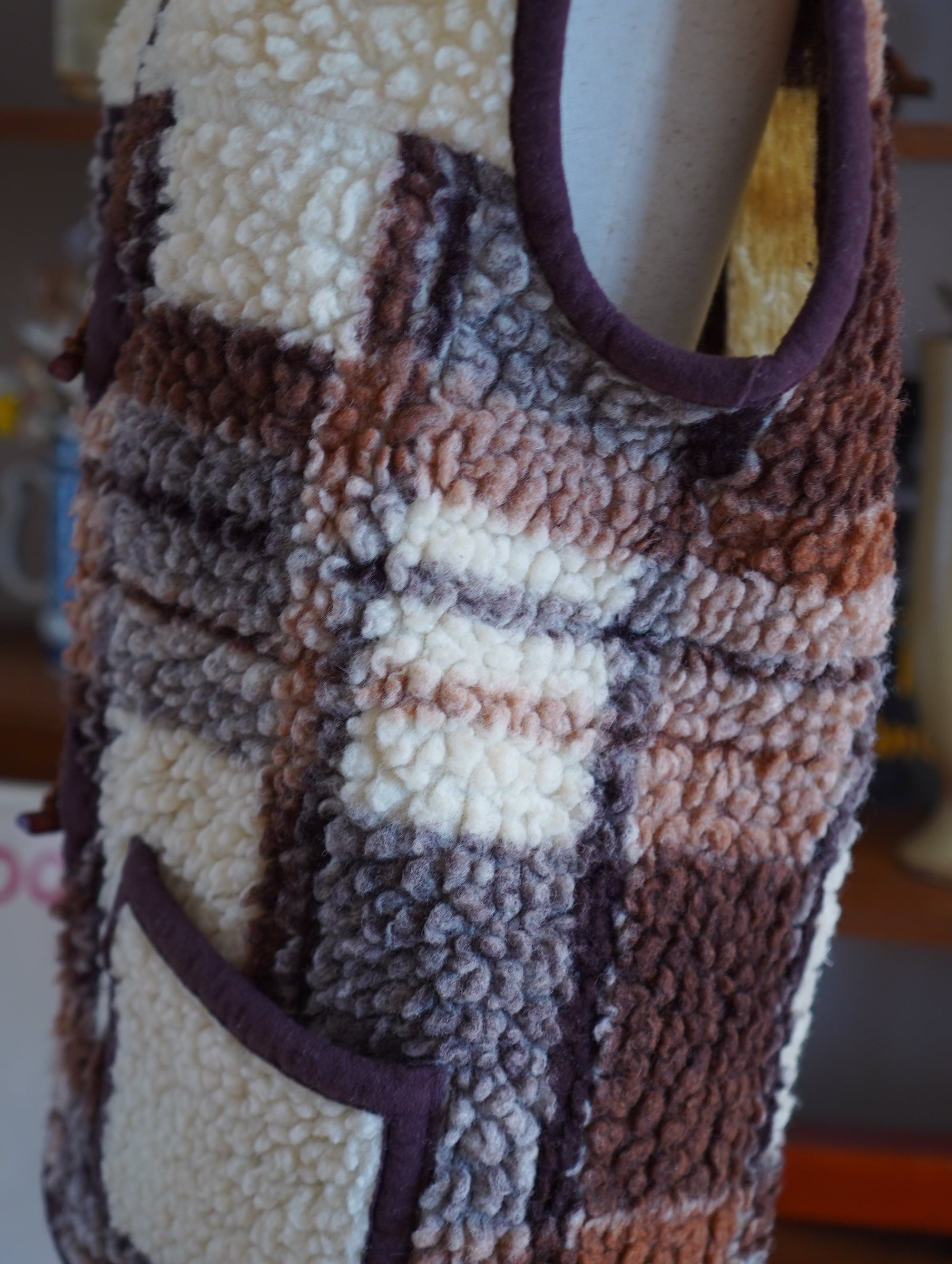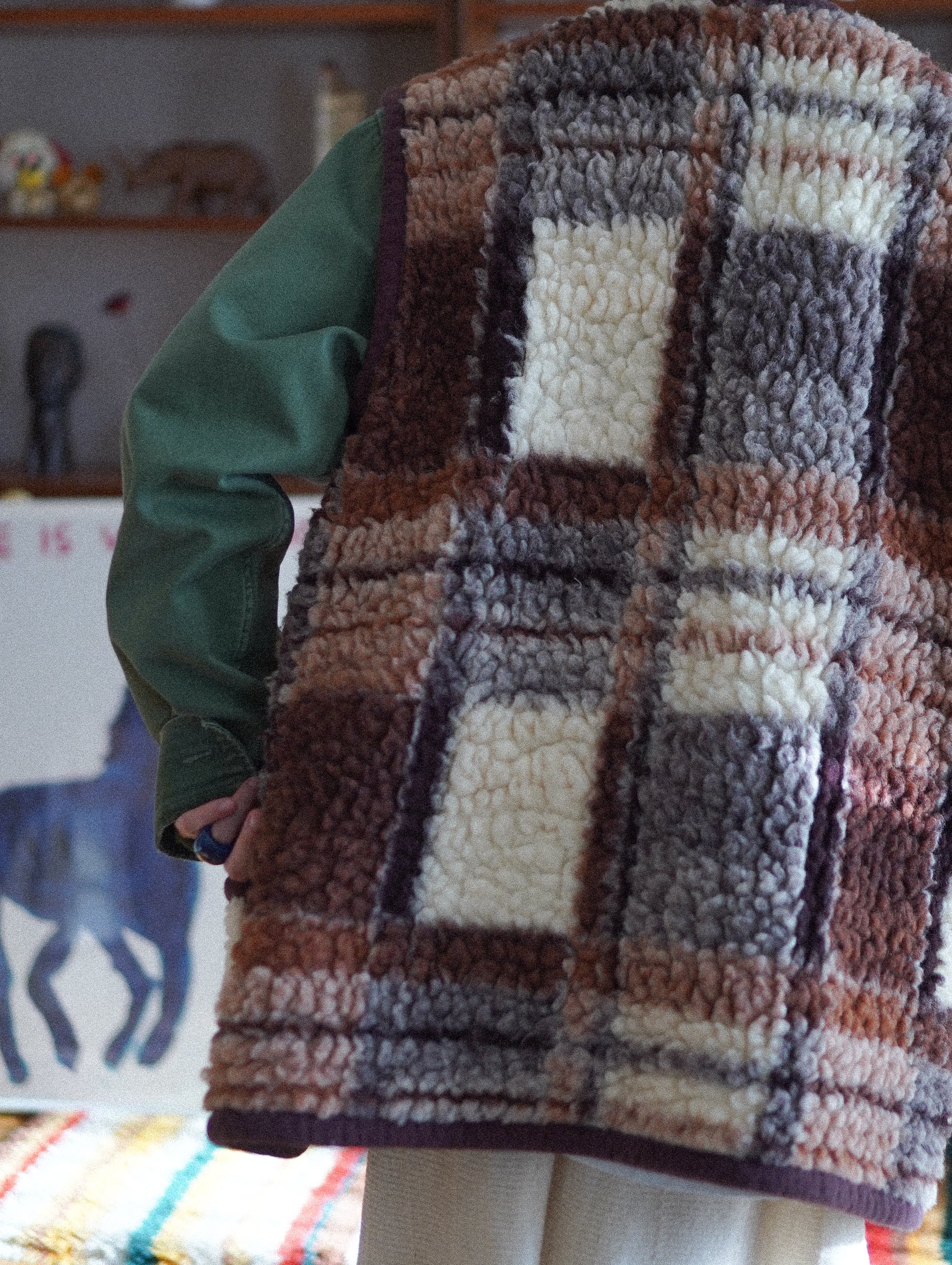ポーランド発「ALWERO(アルベロ)」のウールベスト。もこもことした立体感がたまらない、100%ウールのフリース素材で仕立てられています。ミルクのようなアイボリー、チョコブラウン、グレー、そして淡いモカカラーがミックスされた、唯一無二のチェック柄。ぽってりしたパッチポケットや、トグルボタンのディテールも愛おしいポイント。ミリタリージャケットの上に重ねても、ワンピースに羽織っても、スタイリングがぐっと冬らしくなる一着。/"ALWERO" wool vest