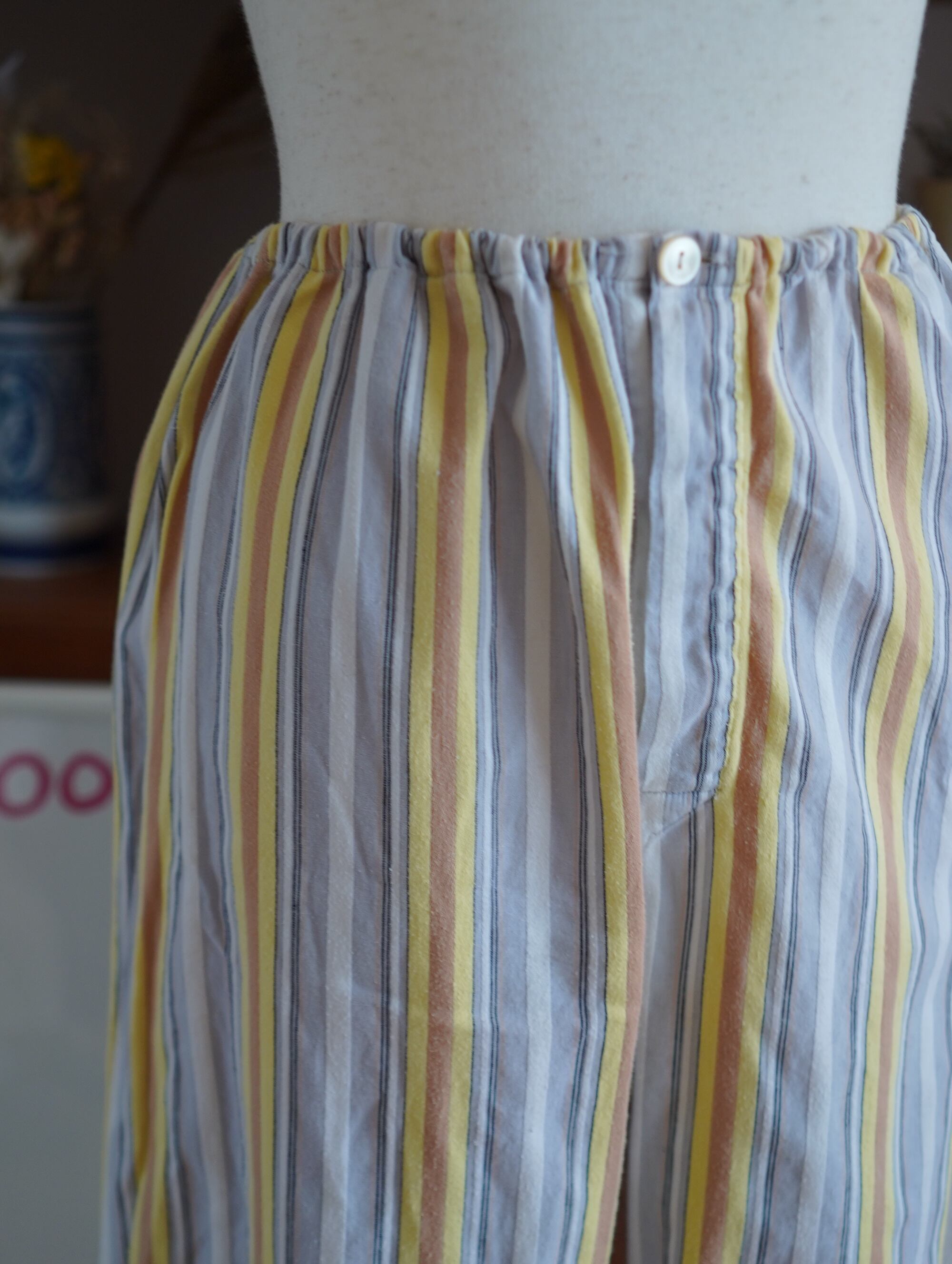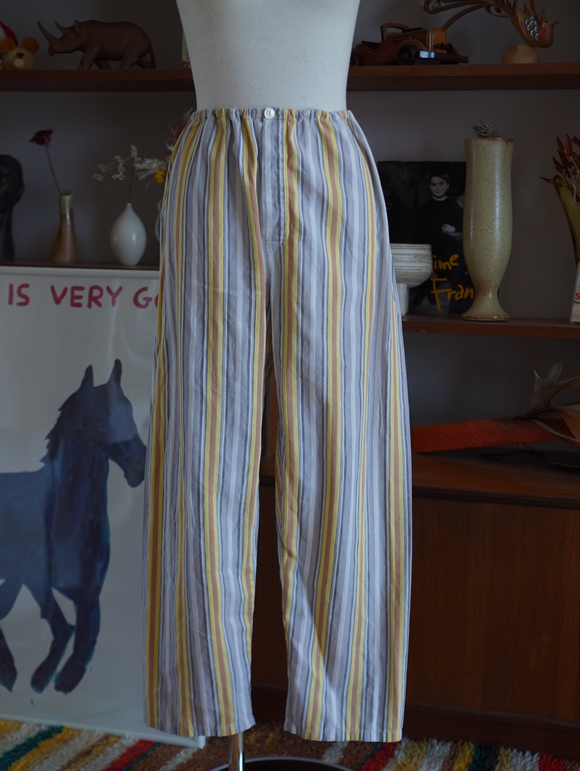 淡いパープルに、ミルキーイエローやアプリコットのような優しいオレンジ、さりげないブラックラインが重なり合う、絶妙なストライプパターンが目を惹くヴィンテージパジャマパンツ。柔らかなコットン混のような生地感で、ゆったりとした履き心地が魅力。フロントには小さなボタン、ウエストはゴムでリラックスに着用いただけます。お部屋ではもちろん、シャツやジャケットと合わせて外着としても楽しめる一本。/hungarian vintage pajama pants – yellow stripe