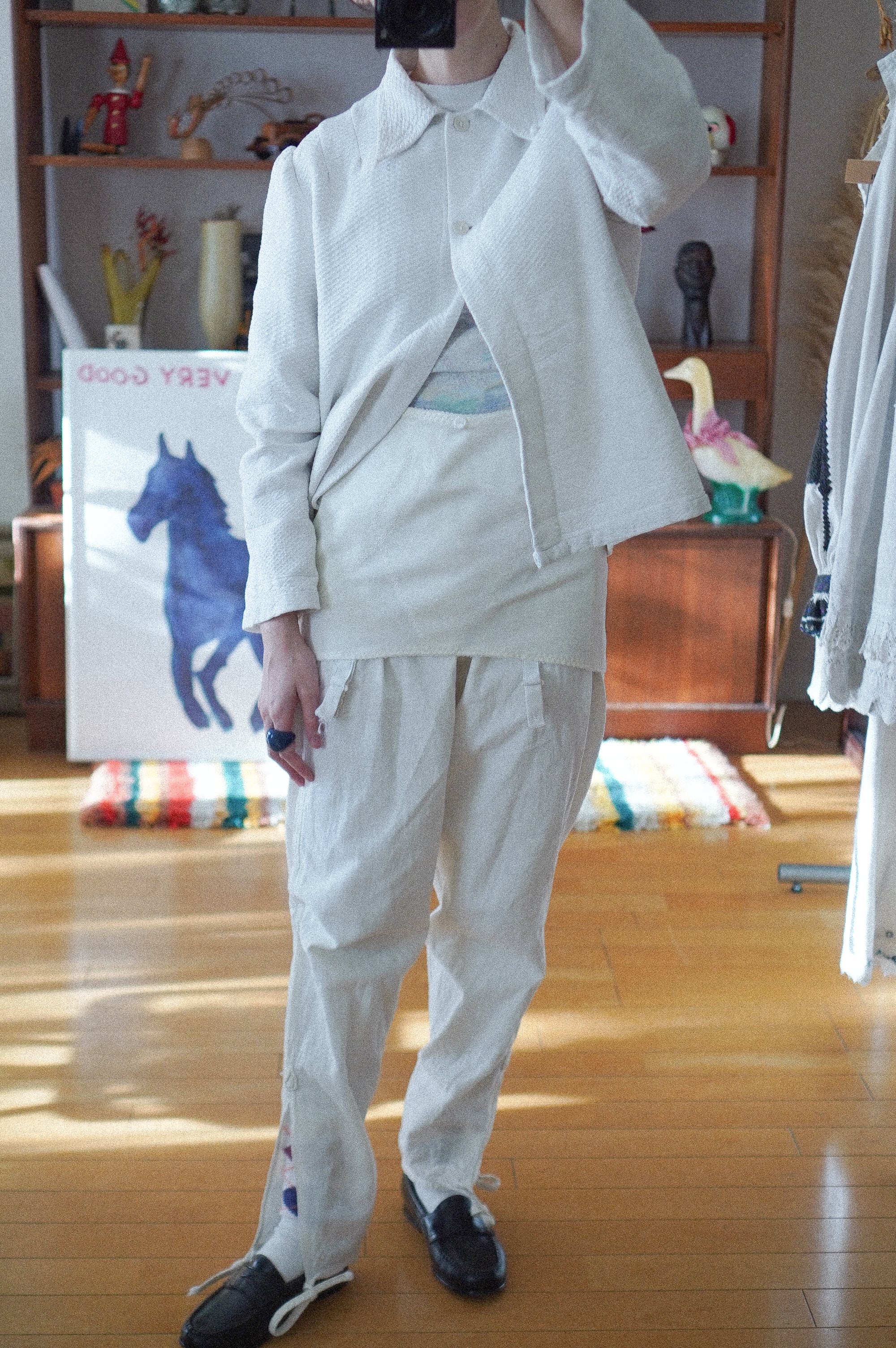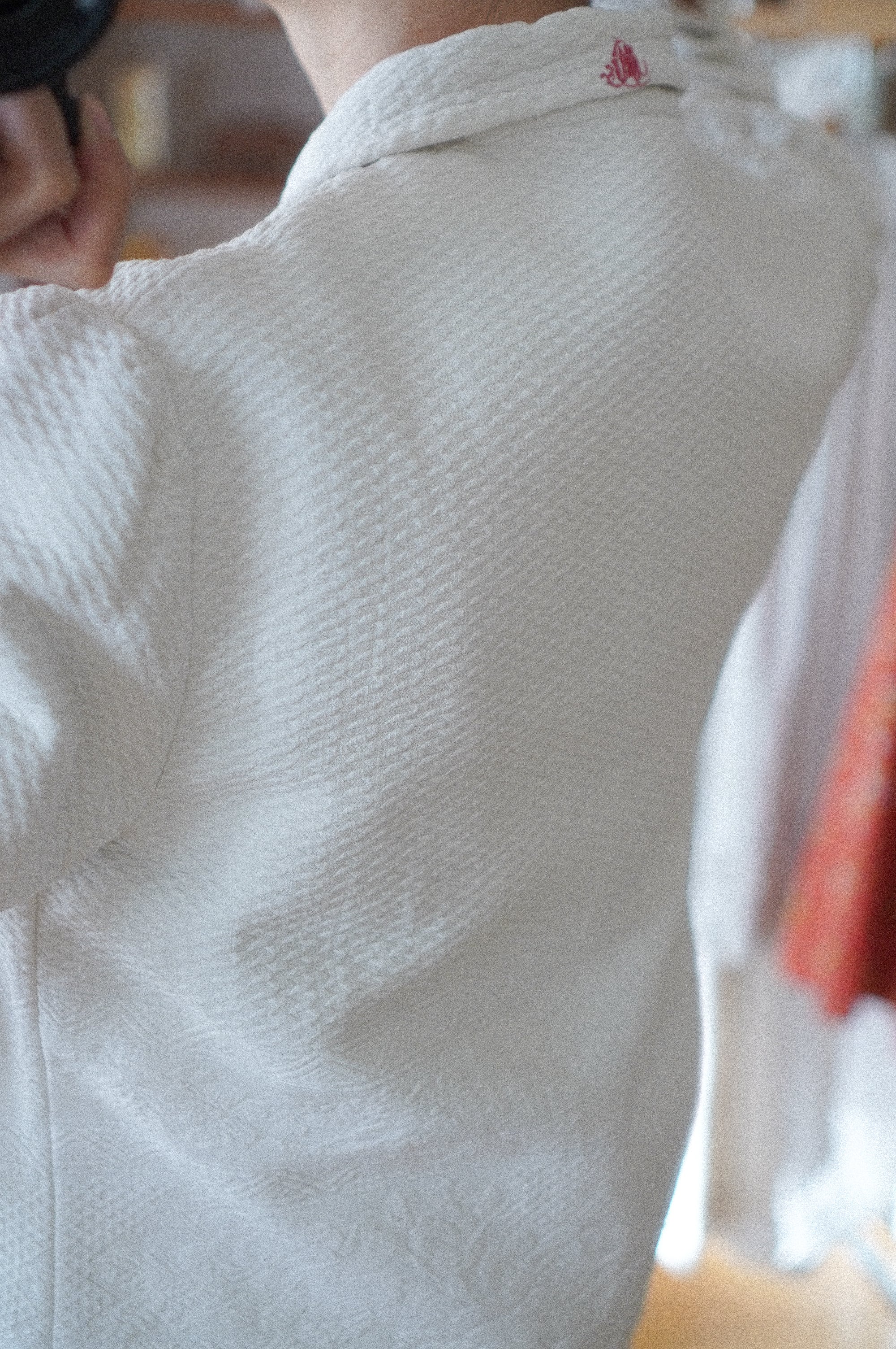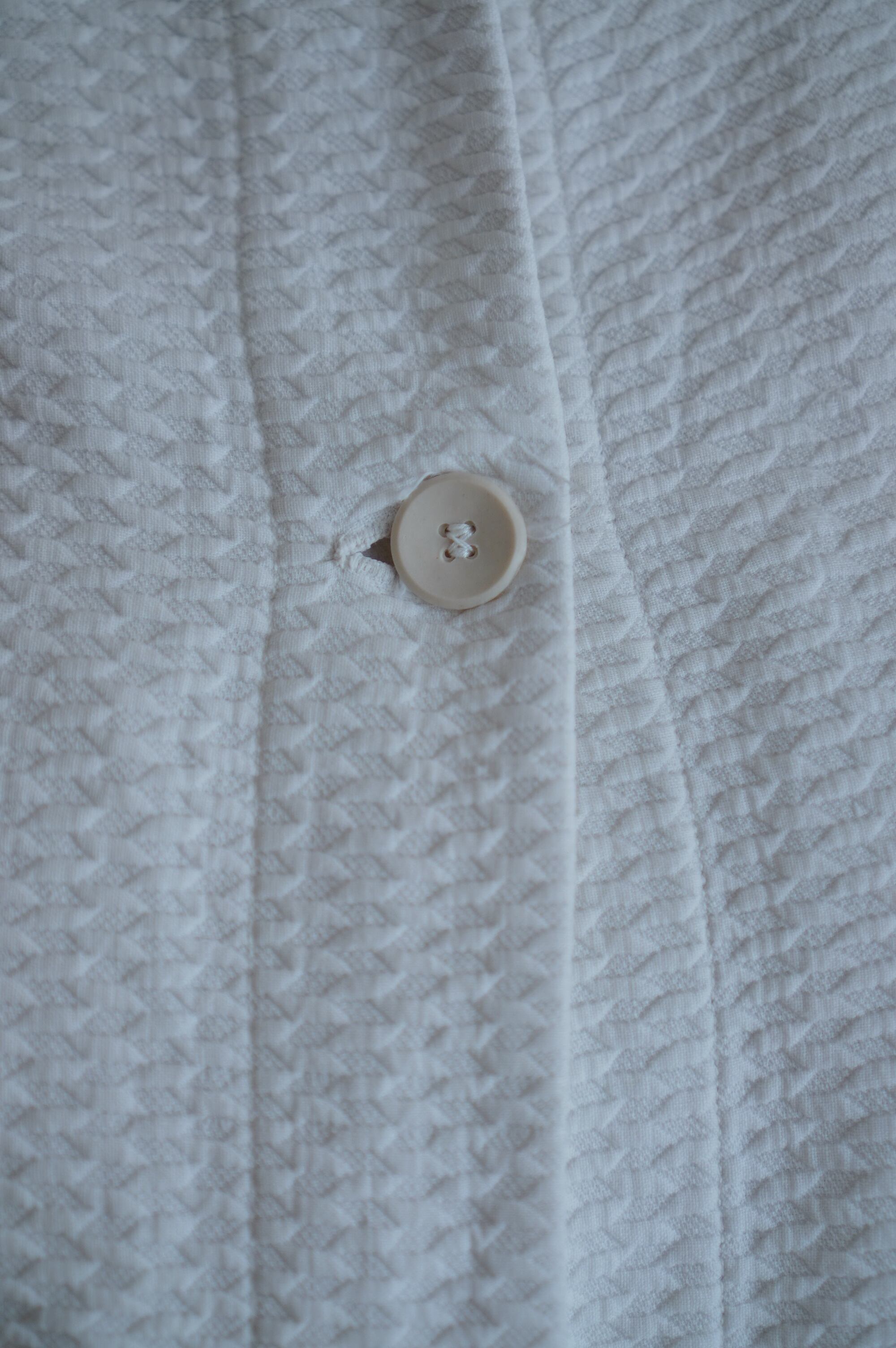 まっしろな織り生地に、ぽこぽこと浮かぶような織り柄がぎゅっと詰まった、60s頃のハンドメイドのヴィンテージジャケット。羽織としてもシャツ感覚でも着られる一枚で、首元の刺繍と、織り柄の美しさが最高のチャームポイント。襟の絶妙なとんがり感がキュートで、やや細めに仕上げられた襟先が、クラシックな印象の中にちょっぴりモードな空気を添えてくれています。誰ともかぶらない、背中を押してくれるようなスペシャルな一点モノです。/hand-embroidered textured cotton jacket