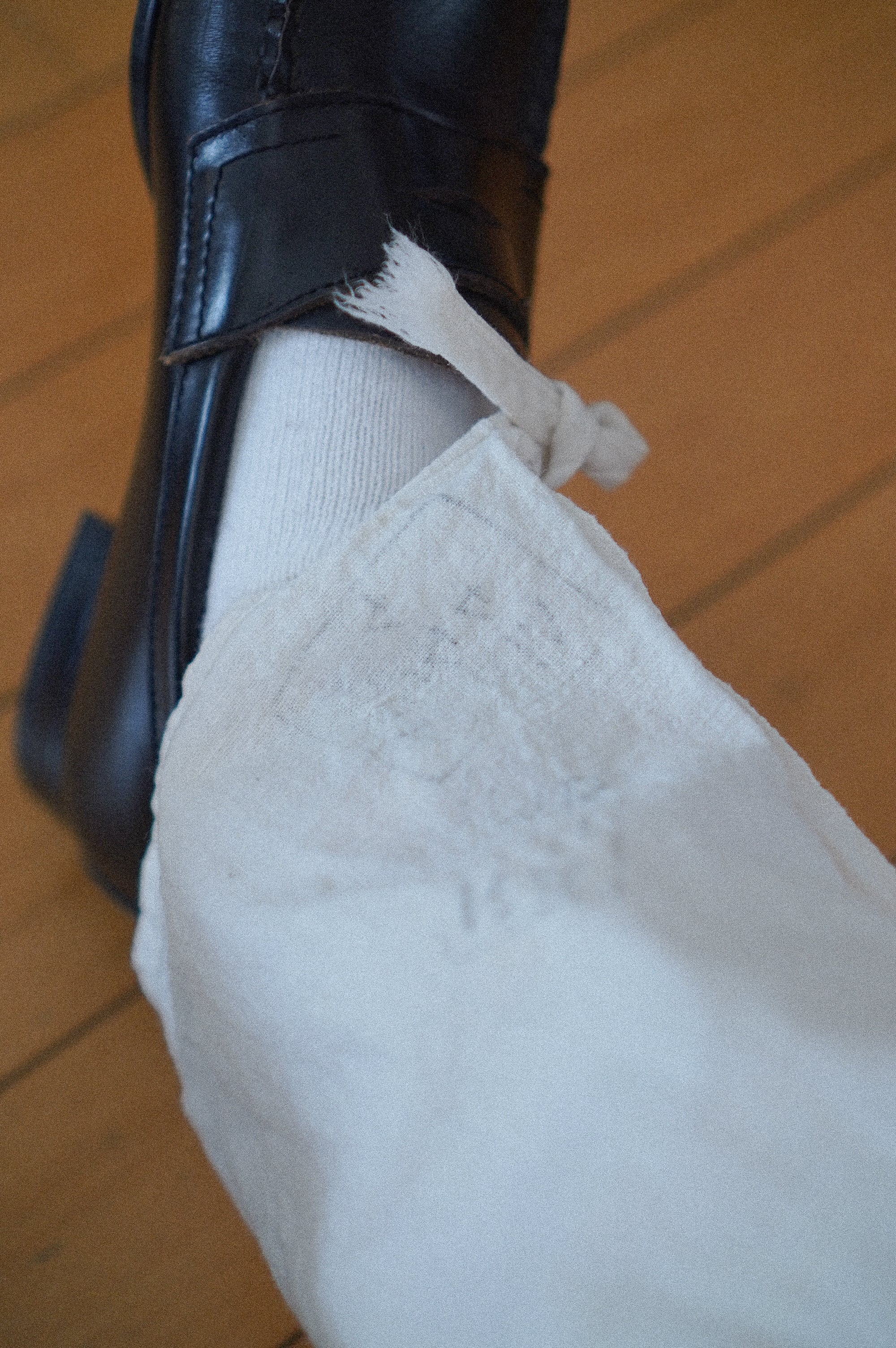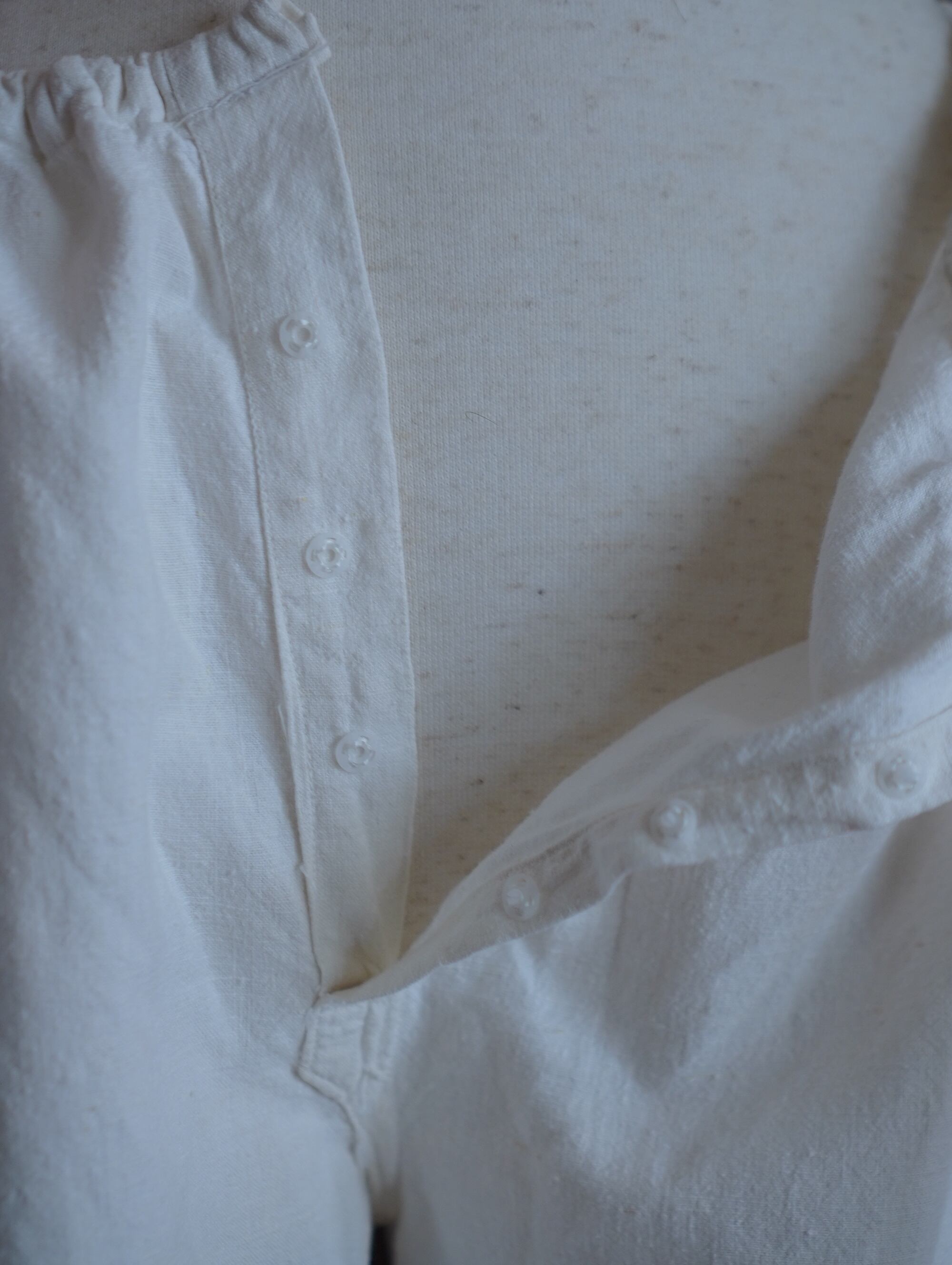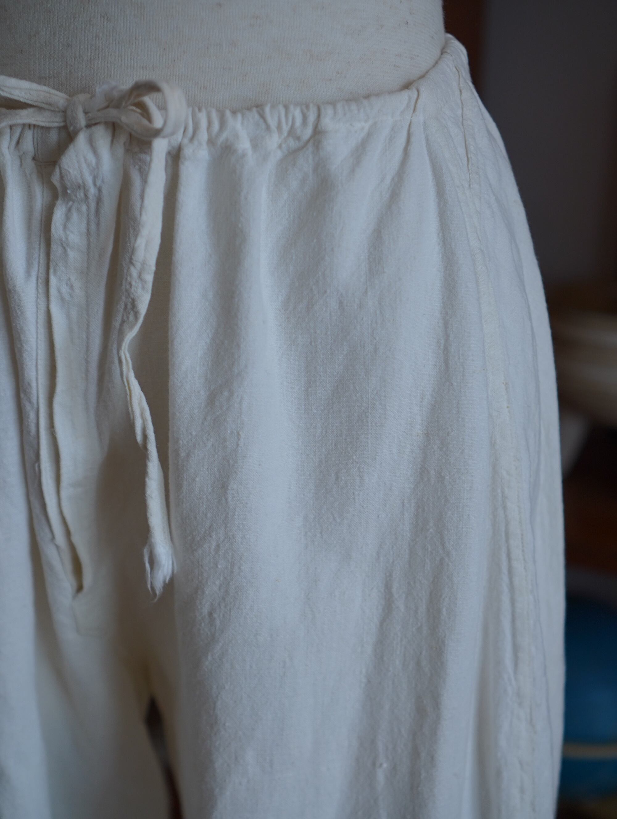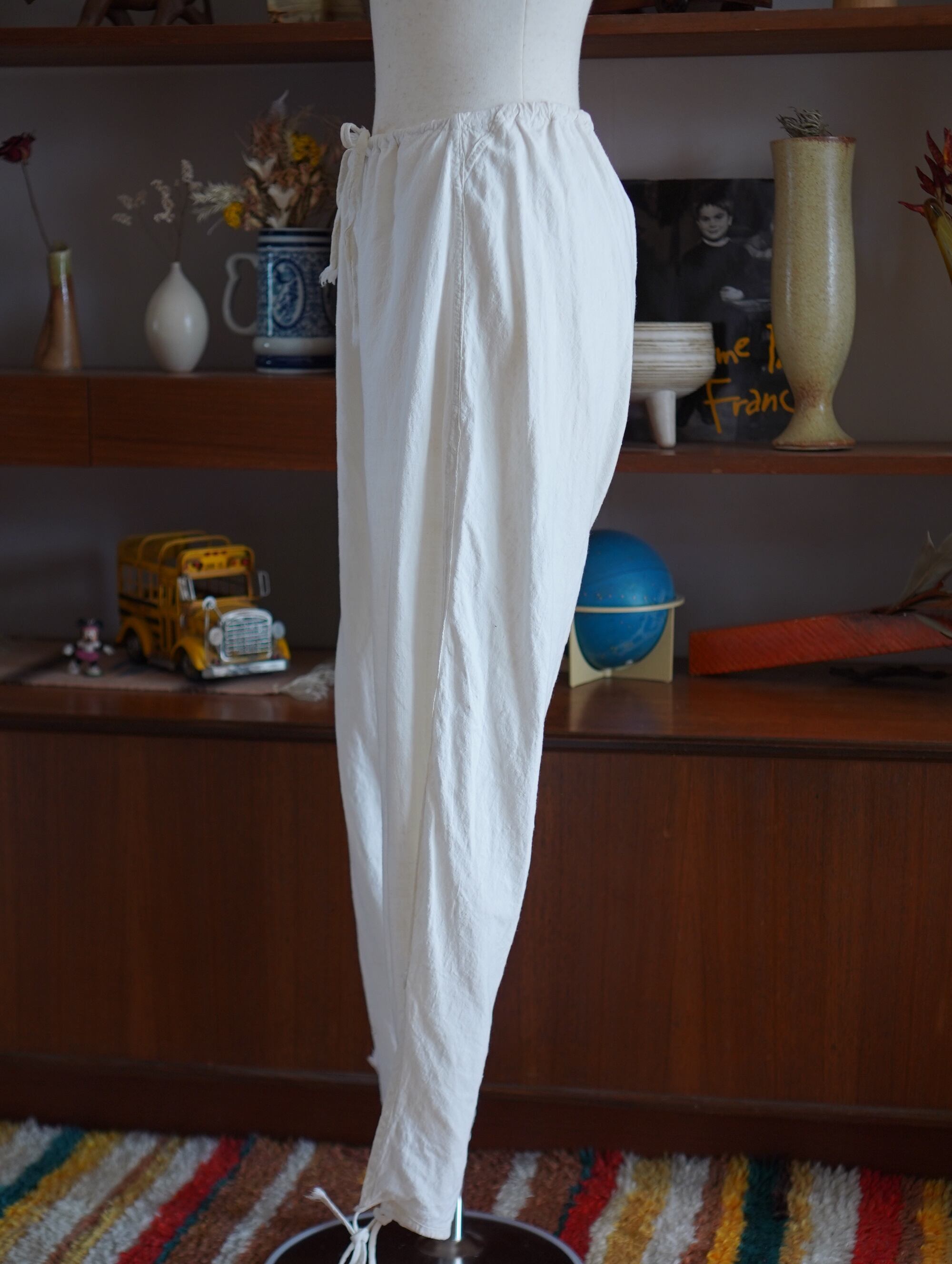 ふわっとしたやさしい綿素材と、裾のくたっとした紐が愛おしい、巻きパンツ型のドロワーズ。1930〜40年代頃と思われる1本で、ウエストは紐でぎゅっと調節いただけます。そのつくりがまるで“巻きパンツ”のような独特の形状になっていて、着たときにふわりとしたシルエットが出るのがたまらないポイントです。裾部分のスタンプで押されたような印字がチャームポイント。きっと昔は軍や農作業用だったのかな、と想像してしまうような雰囲気です。くるぶしに紐がついていて、ぎゅっと絞るのもキュートなディテール。/1930s–40s wrap gaucho pants