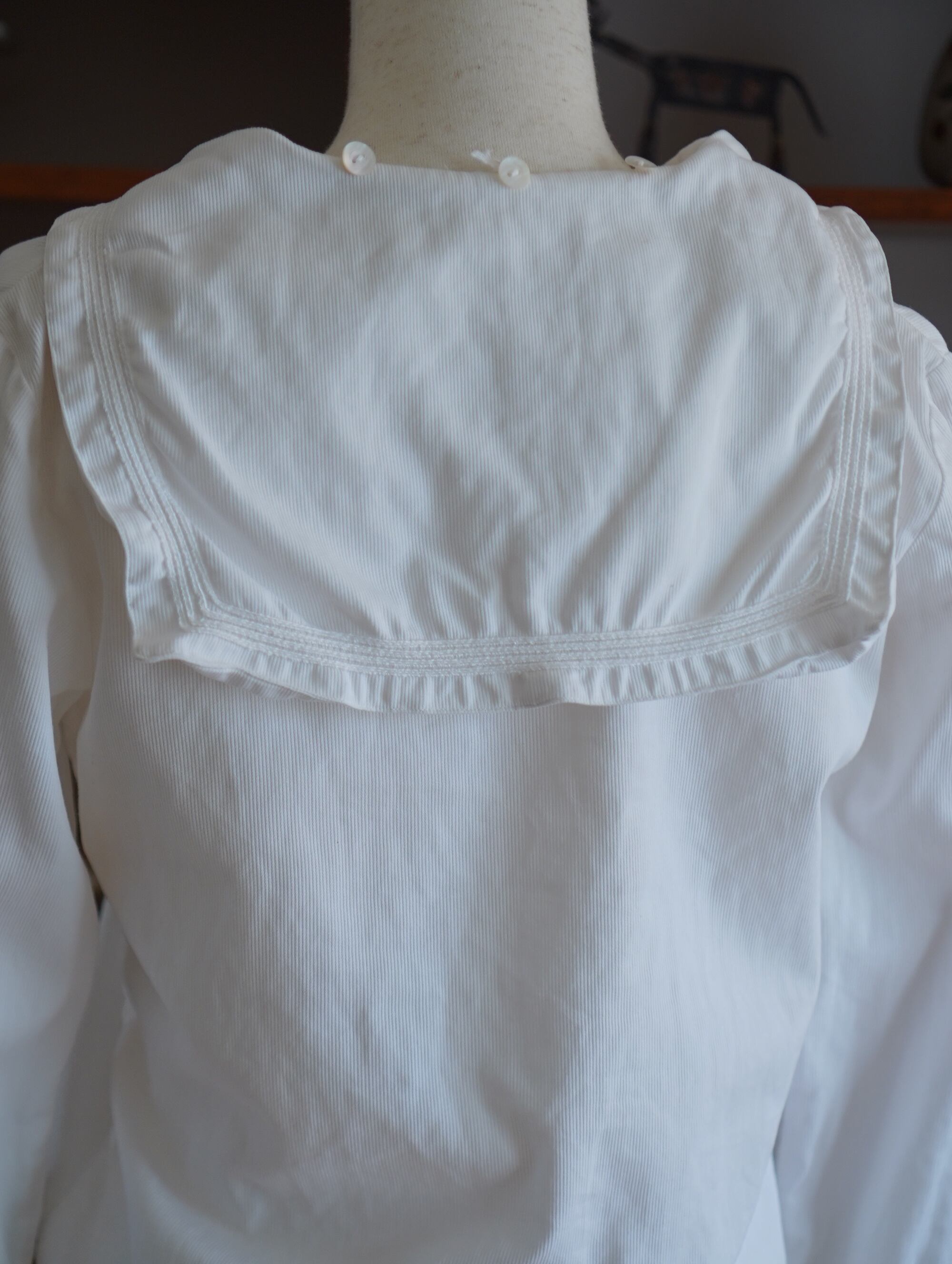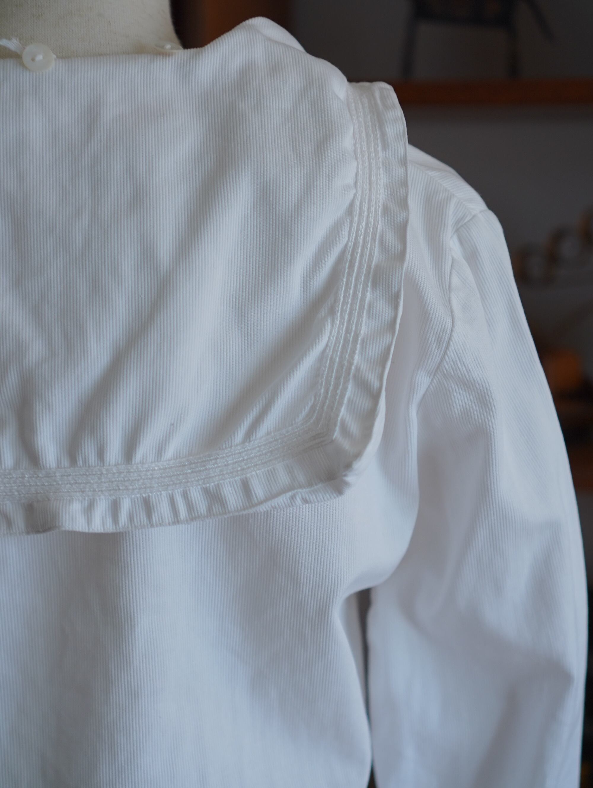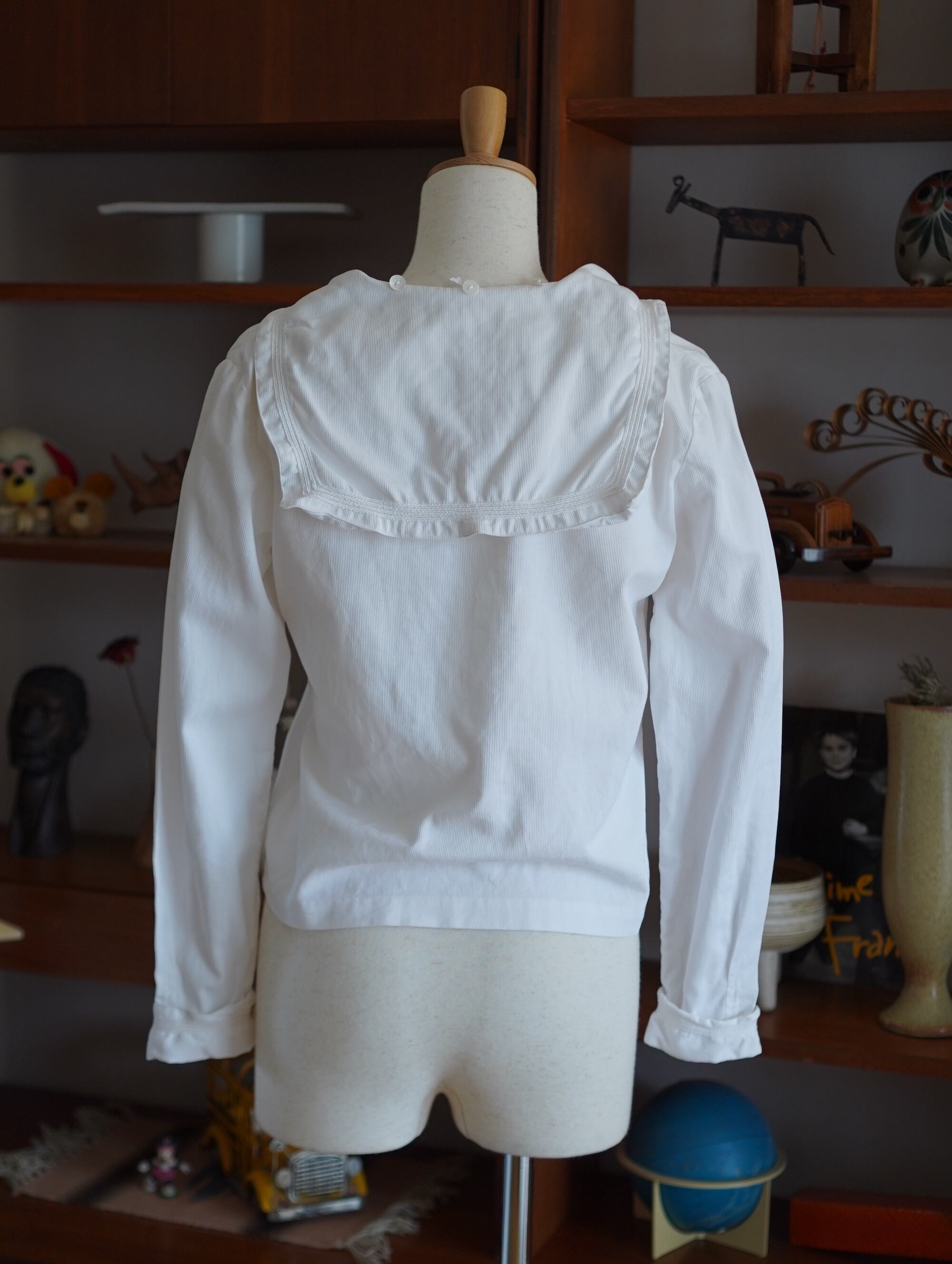 小柄さんにぴたっと着てほしい、キッズサイズのヴィンテージ・セーラートップス。1950〜70年代頃の子ども用制服・礼装として使われていた可能性のある一着。背中のセーラーカラーには繊細なステッチ入り、前から見たときの襟のVラインも美しく、フレンチスクールのような気品あるシルエット。ちいさなポケットが両側にちょこんとついていて、ディテールまでぬかりなく愛おしい仕上がり。ニットやカーディガンに合わせて背中のセーラーカラーを見せてあげるのもキュートです。/vintage sailor collar cotton top