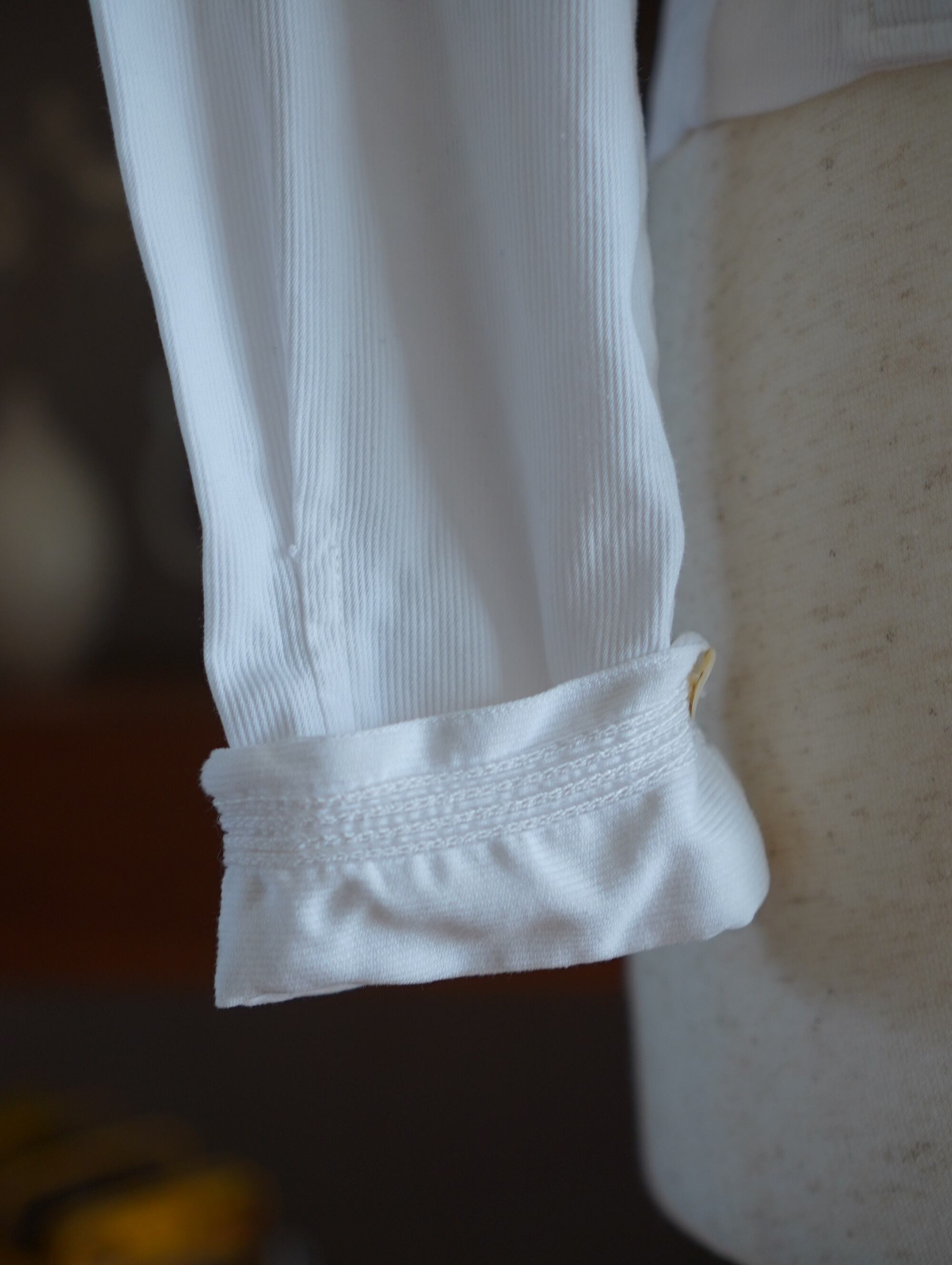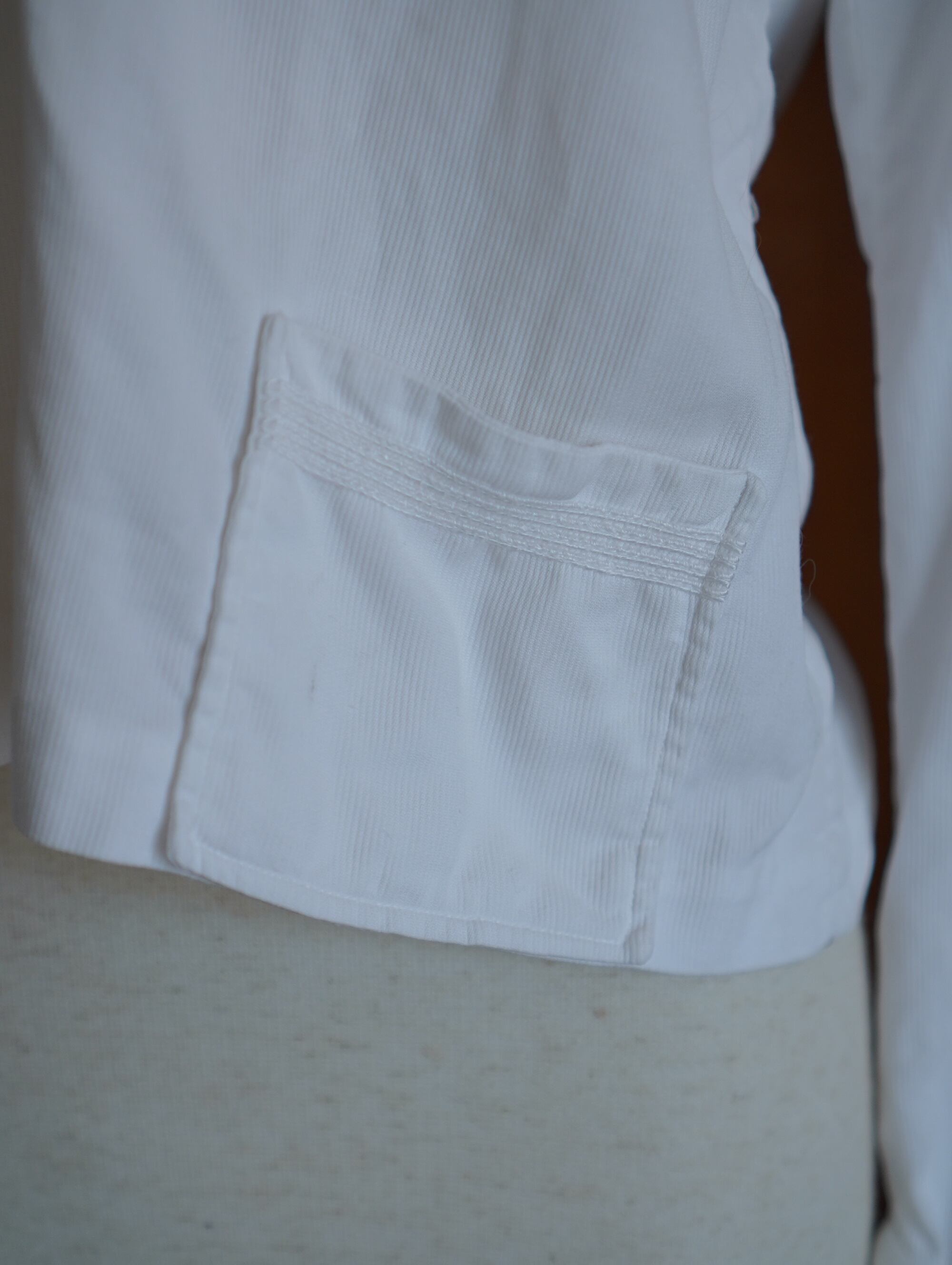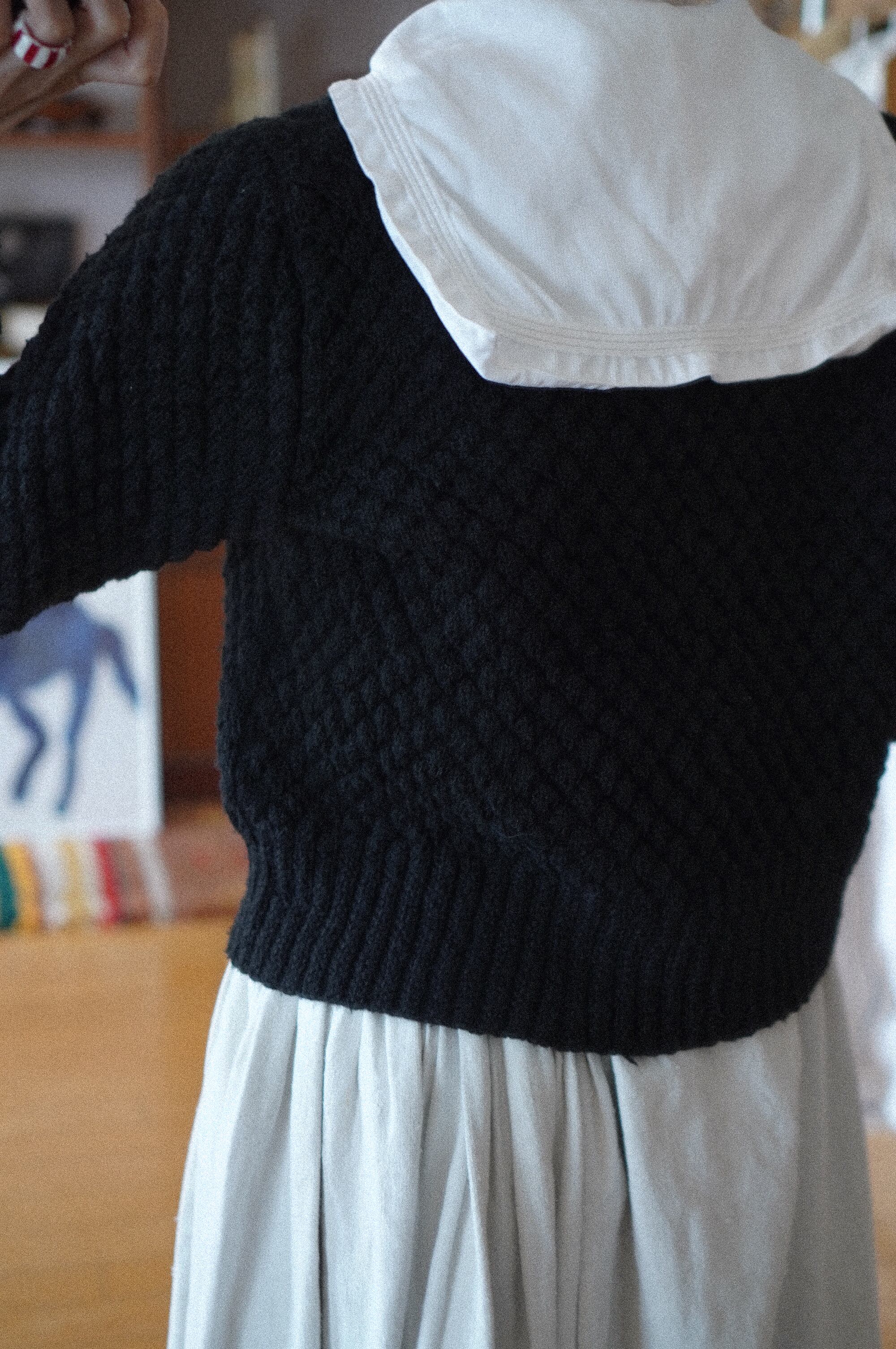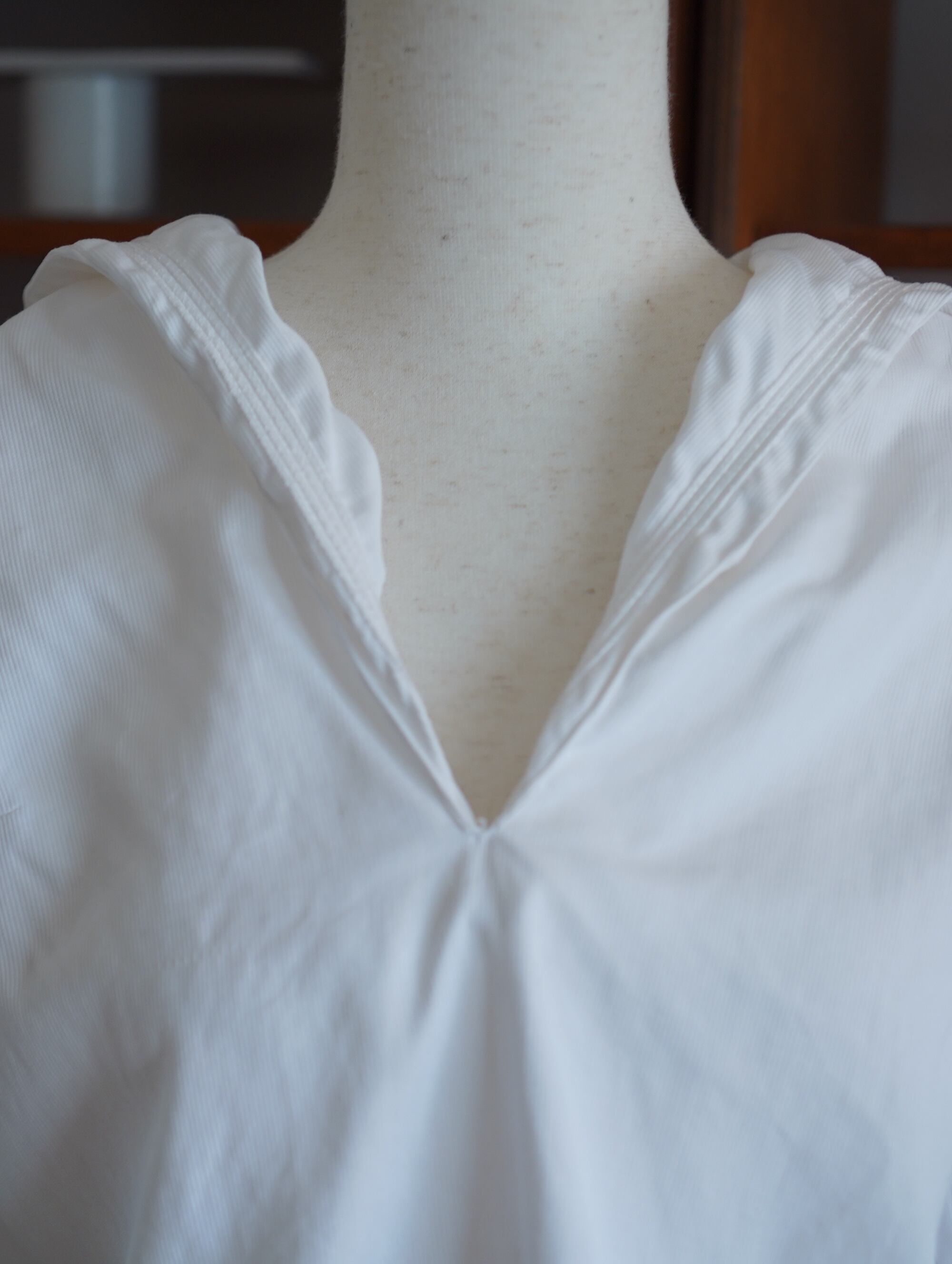小柄さんにぴたっと着てほしい、キッズサイズのヴィンテージ・セーラートップス。1950〜70年代頃の子ども用制服・礼装として使われていた可能性のある一着。背中のセーラーカラーには繊細なステッチ入り、前から見たときの襟のVラインも美しく、フレンチスクールのような気品あるシルエット。ちいさなポケットが両側にちょこんとついていて、ディテールまでぬかりなく愛おしい仕上がり。ニットやカーディガンに合わせて背中のセーラーカラーを見せてあげるのもキュートです。/vintage sailor collar cotton top