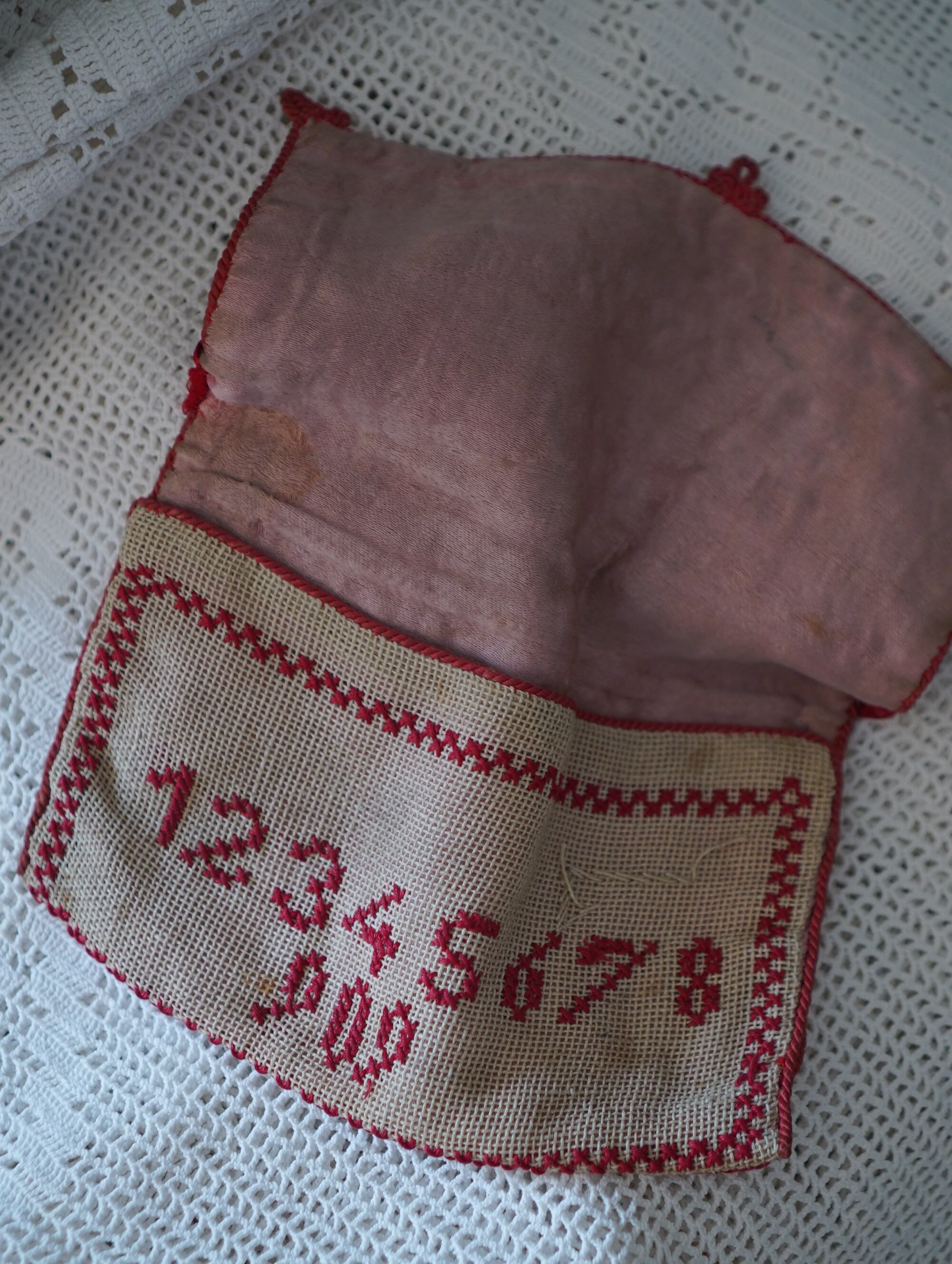 手刺繍で綴られた、赤いクロスステッチのアルファベットと数字。愛らしいイニシャル、内布のピンクの古いコットン、どこを見ても、当時の手仕事の美しさにときめきます。何十年、もしかすると100年近く前につくられた、世界にひとつだけのサンプラーケース。大切なものをそっとしまっておくポーチとして、あるいは小さなバッグとしてもお使いいただけます。/antique embroidery sampler pouch (c.1900s, europe)